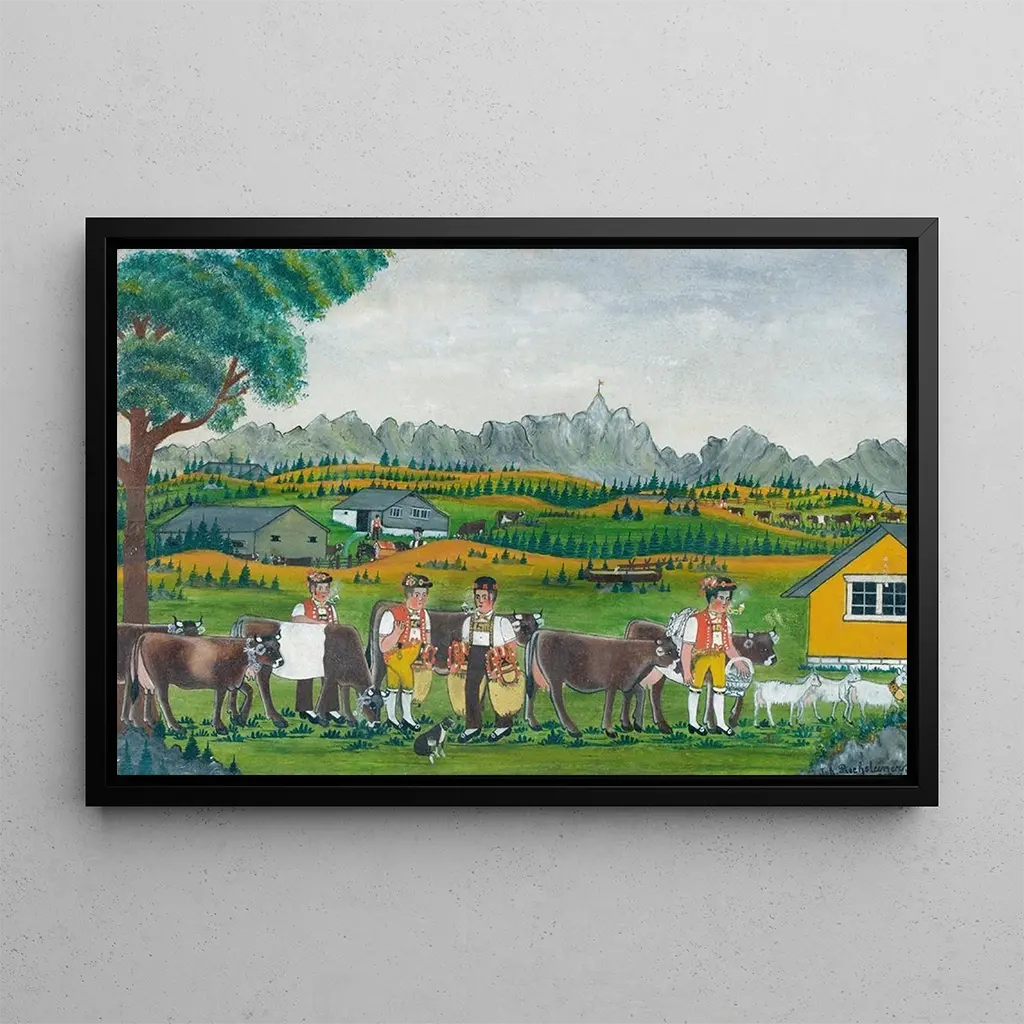 "Arrivo in alpeggio", opera di Johannes Rechsteiner, evoca la maestosa bellezza dei paesaggi alpini. Questa stampa d'arte cattura un momento di serenità in cui i personaggi, circondati da montagne imponenti, sembrano in armonia con la natura. Le tonalità morbide di verde e di blu, associate a tocchi di luce dorata, creano un'atmosfera pacifica e contemplativa. La tecnica di Rechsteiner, caratterizzata da un'attenzione meticolosa ai dettagli, permette di percepire la freschezza dell'aria alpina e la tranquillità del paesaggio, invitando lo spettatore a evadere in questo ambiente idilliaco.
