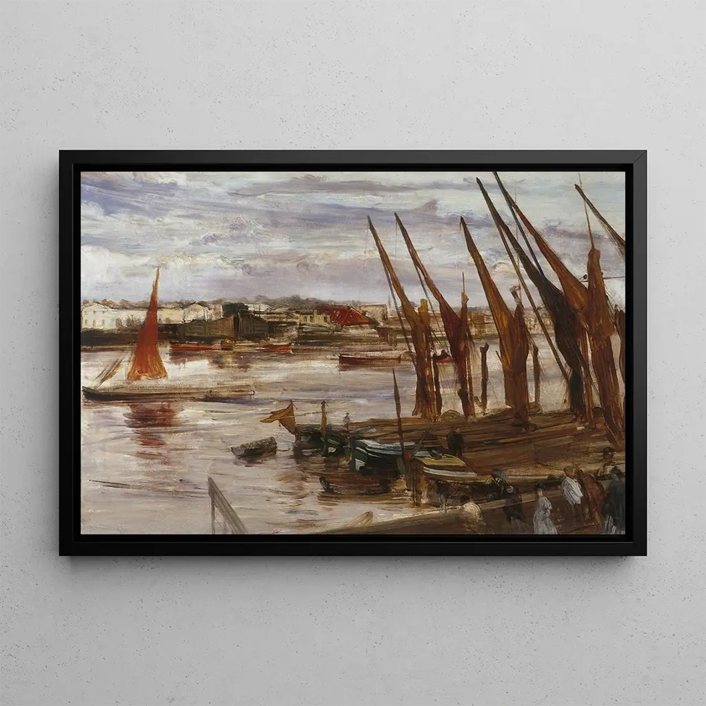 James Abbott McNeill Whistler, figura imprescindibile del movimento impressionista, ha saputo unire colore e luce in modo inedito. Nato nel 1834 negli Stati Uniti, si trasferisce a Parigi dove si impregna delle influenze degli artisti contemporanei, sviluppando al contempo il suo stile personale. Whistler è famoso per le sue opere che catturano momenti fugaci, spesso ispirati dalla vita urbana e dalla natura. Il suo periodo di creazione, che va dalla metà del XIX secolo fino agli ultimi anni, è caratterizzato da una ricerca costante di armonia cromatica. Battersea Reach è un esempio perfetto del suo approccio innovativo, dove ogni colpo di pennello contribuisce a un'esperienza visiva unica.