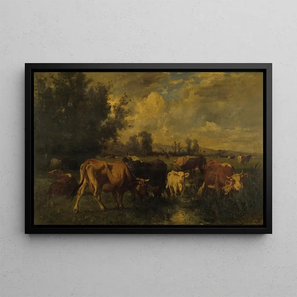 Bétail dans un champ : una scena bucolica ricca di vita La riproduzione di Bétail dans un champ di Émile van Marcke ci immerge in una scena bucolica dove regna la calma e la serenità. Le tonalità morbide di verde e marrone, abbinate a tocchi di luce, rendono omaggio alla bellezza dei paesaggi rurali. La tecnica realistica di Van Marcke, che cattura i dettagli degli animali e del loro ambiente, crea un'atmosfera pacifica e autentica. Questo quadro evoca la semplicità della vita in campagna, invitando lo spettatore ad apprezzare la bellezza dei momenti quotidiani trascorsi in armonia con la natura. Émile van Marcke : un pittore della vita rurale Émile van Marcke, nato nel 1827, è un artista francese riconosciuto per le sue rappresentazioni della vita rurale e degli animali. Influenzato dal realismo e dal naturalismo, ha saputo catturare l'essenza della campagna francese attraverso le sue opere. Van Marcke ha spesso dipinto scene di bestiame, mettendo in evidenza la bellezza e la dignità degli animali nel loro ambiente naturale. Il suo lavoro ha svolto un ruolo importante nella rappresentazione della vita agricola nel XIX secolo, e Bétail dans un champ è un esempio perfetto del suo talento nel immortalare momenti semplici ma significativi. Una riproduzione decorativa con molteplici vantaggi Questa riproduzione di Bétail dans un champ è ideale per aggiungere un tocco di fascino pastorale alla vostra decorazione d'interni. Che si trovi in una cucina, un soggiorno o un ufficio, questa tela evoca la tranquillità della campagna e arricchisce il vostro spazio vitale. La qualità di stampa garantisce fedeltà ai colori e ai dettagli dell'opera originale, offrendo un'attrattiva estetica indiscutibile. Scegliendo questa opera, aggiungete una dimensione calda e accogliente al vostro interno, celebrando al contempo la bellezza della vita rurale.