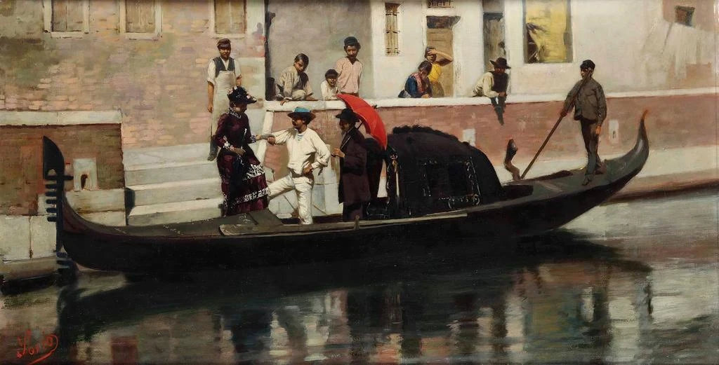 Luigi Sorio, attivo nel XIX secolo, è riconosciuto per le sue rappresentazioni poetiche della vita quotidiana a Venezia. Influenzato dai grandi maestri del Rinascimento, ha saputo catturare l'essenza di questa città unica attraverso le sue opere. Sorio si è evoluto in un contesto artistico ricco, dove il romanticismo e l'impressionismo iniziavano a influenzare gli stili tradizionali. I suoi dipinti, come Figura su gondola, testimoniano la sua abilità nel unire la tecnica classica con tocchi di modernità, rendendolo un artista importante della sua epoca, il cui lascito perdura nell'apprezzamento contemporaneo dell'arte veneziana.