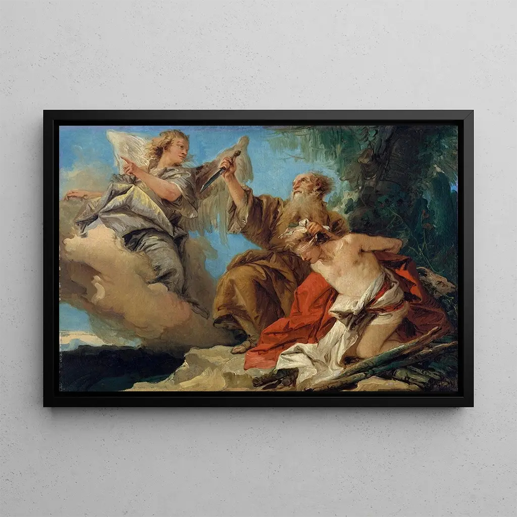 La riproduzione de Il Sacrificio di Isacco di Giovanni Domenico Tiepolo raffigura un momento chiave della Bibbia, in cui Abramo si prepara a sacrificare suo figlio Isacco. Quest'opera, ricca di emozioni, è caratterizzata da colori vivaci e da una composizione dinamica che cattura immediatamente lo sguardo. Le espressioni dei personaggi, che mescolano paura e rassegnazione, creano un'atmosfera carica di tensione. La maestria nella gestione della luce e dell’ombra, tipica dello stile barocco, accentua il dramma della scena, mentre i dettagli minuziosi degli abiti e dei paesaggi circostanti testimoniano il talento eccezionale dell’artista. Questa tela invita alla riflessione sulla fede e sul sacrificio, temi universali che risuonano attraverso i secoli.