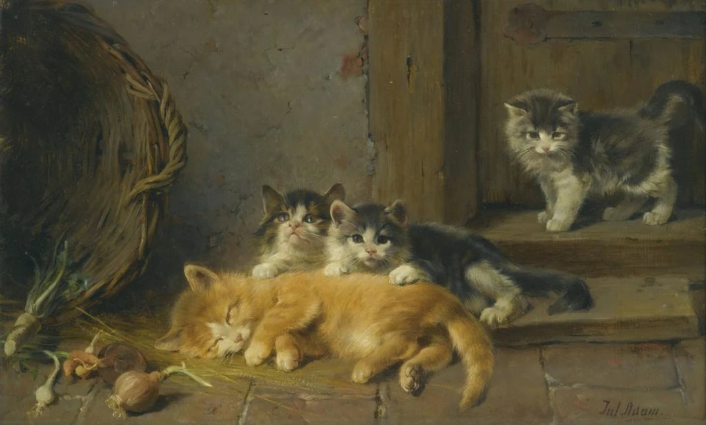 Julius Adam l'Ancien, pittore tedesco attivo nel XIX secolo, è riconosciuto per la sua abilità nel rappresentare scene della vita quotidiana con una sensibilità particolare. Influenzato dal movimento romantico, si è specializzato in soggetti intimi, spesso centrati sulla figura umana. La sua opera riflette un periodo in cui l'arte si rivolgeva a temi più personali ed emotivi, allontanandosi dagli ideali classici. Adam ha saputo catturare momenti di vita intrisi di poesia, il che gli ha valso un ruolo importante nel panorama artistico del suo tempo, soprattutto attraverso opere come "Il risveglio".