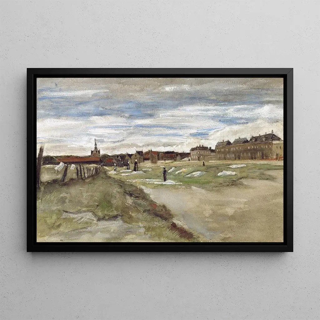 La riproduzione di "Blanchisserie à Scheveningen" di Vincent van Gogh cattura un momento della vita quotidiana con un'intensità vibrante. In questa scena, le lenzuola bianche svolazzano al vento, creando un contrasto sorprendente con il cielo azzurro e i colori terrosi degli edifici circostanti. La tecnica del tocco rapido di Van Gogh, caratteristica del suo stile post-impressionista, dà un'impressione di movimento e vitalità. L'atmosfera è intrisa di semplicità e calore, invitando lo spettatore a percepire la tranquillità di un pomeriggio in riva al mare, dove lavoro e natura si incontrano armoniosamente.