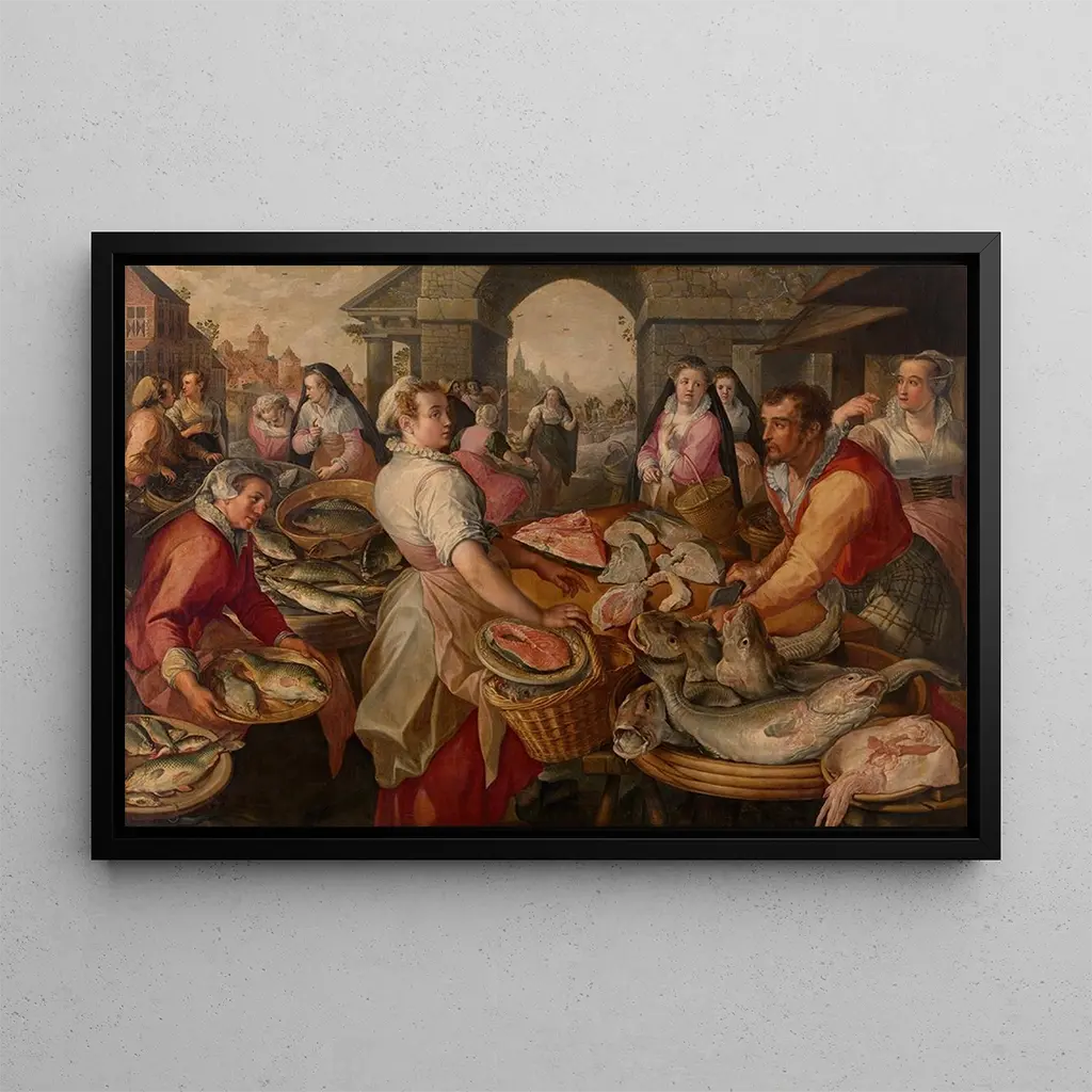 Il quadro "Mercato del pesce" di Joachim Beuckelaer rappresenta una scena vibrante e animata, dove si può quasi udire il brusio del mercato. I colori ricchi e vivaci, che vanno dai rossi profondi ai blu luminosi, creano un'atmosfera calda e accogliente. La tecnica di Beuckelaer, caratterizzata da un realismo minuzioso, permette di cogliere i dettagli dei pesci, dei frutti di mare e dei personaggi che interagiscono in questo contesto. Ogni elemento è accuratamente disposto, offrendo una composizione armoniosa che cattura lo sguardo e invita alla contemplazione della vita quotidiana del XVI secolo.