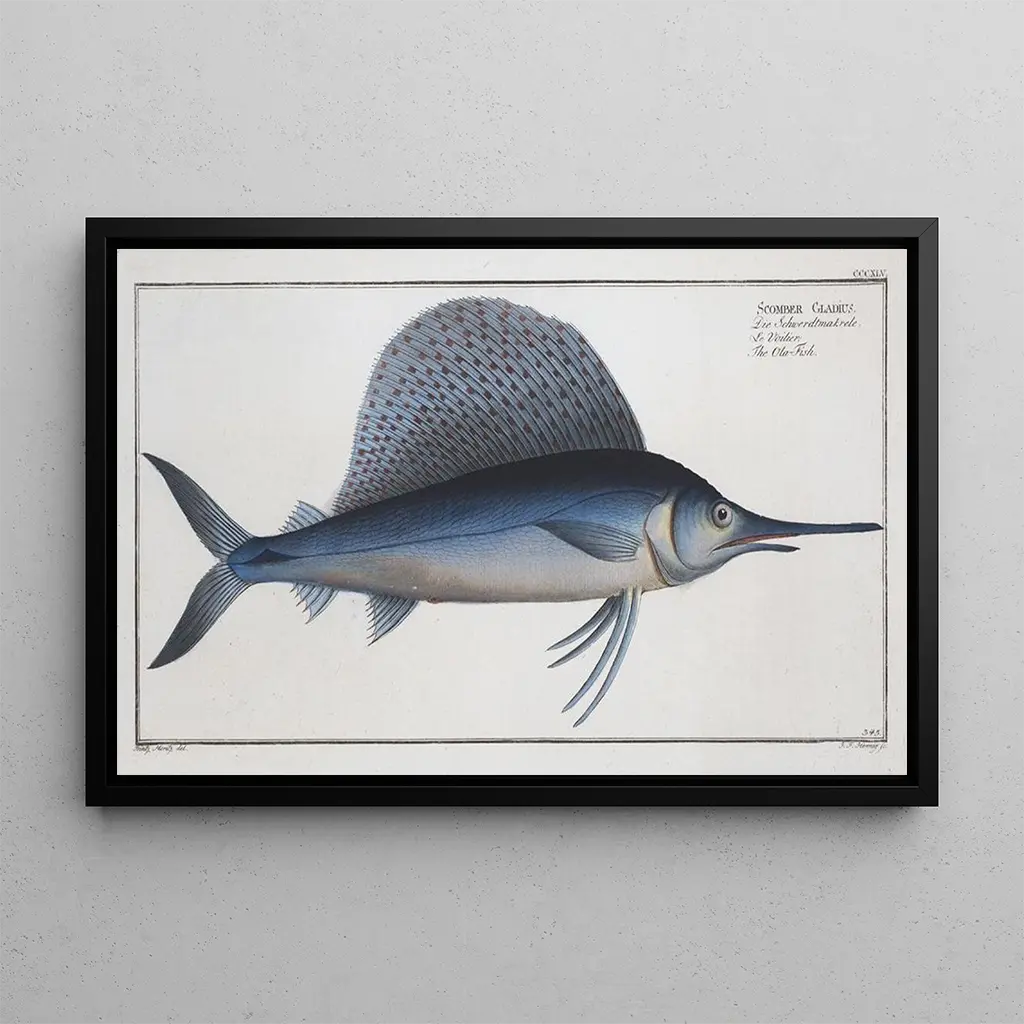 Thonier : un'ode al mare e alla vita marittima La stampa d'arte Thonier di Marcus Elieser Bloch ci immerge in un universo marino vibrante. Quest'opera, realizzata con una raffinatezza straordinaria, mette in evidenza un tonno maestoso, le cui sfumature di blu e d'argento catturano la luce in modo quasi ipnotico. La tecnica dell'acquarello, associata a dettagli minuziosi, crea un'atmosfera al tempo stesso realistica e poetica. Bloch, vero maestro della rappresentazione ichthyologica, riesce a trasmettere l'essenza stessa del mare, invitando lo spettatore a esplorare le profondità di questo affascinante ecosistema. Marcus Elieser Bloch : un pioniere dell’illustrazione marina Marcus Elieser Bloch, attivo nel XVIII secolo, è riconosciuto per i suoi contributi all’illustrazione scientifica, in particolare nel campo dell’ichtiologia. La sua opera principale, "Ichthyologie ou Histoire naturelle des poissons", ha segnato una svolta nella rappresentazione delle specie marine. Influenzato dalle scoperte scientifiche del suo tempo, Bloch ha saputo unire rigore ed estetica, offrendo ritratti di precisione senza pari. Il suo lavoro ha non solo arricchito la conoscenza dei pesci, ma ha anche stabilito standard elevati per gli artisti naturalisti. Così, la stampa d'arte Thonier si inserisce in un patrimonio artistico che unisce scienza e bellezza. Una scelta decorativa con molteplici vantaggi La riproduzione del quadro Thonier è una scelta ideale per abbellire diversi spazi abitativi, che sia in un soggiorno, in un ufficio o in una camera da letto. La sua palette di colori rilassanti e il soggetto affascinante portano un tocco di eleganza e serenità alla vostra decorazione d'interni. La qualità della riproduzione garantisce una fedeltà notevole ai dettagli originali, permettendo agli appassionati d’arte di godere di un’opera di grande valore estetico. Integrando questa tela nel vostro interno, offrite al vostro spazio un’atmosfera marina unica, celebrando al contempo il talento di Marcus Elieser Bloch.