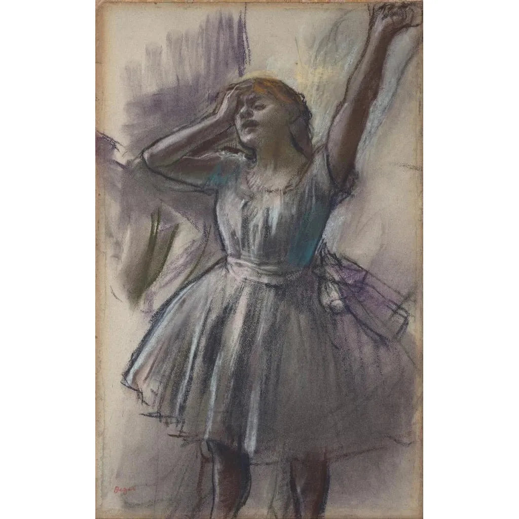 La stampa d'arte dell'opera "Danseuse che si stira" di Edgar Degas cattura un momento fugace della vita di una ballerina. La composizione mette in risalto la silhouette snella della danzatrice, i cui movimenti sembrano quasi sospesi nel tempo. I colori pastello, morbidi e delicati, evocano la luce soffusa di uno studio di danza, creando un'atmosfera intima. La tecnica del pastello, utilizzata da Degas, permette di rendere la texture dei tessuti e della pelle della danzatrice con grande finezza, sottolineando la bellezza e la concentrazione dell'artista in piena preparazione.