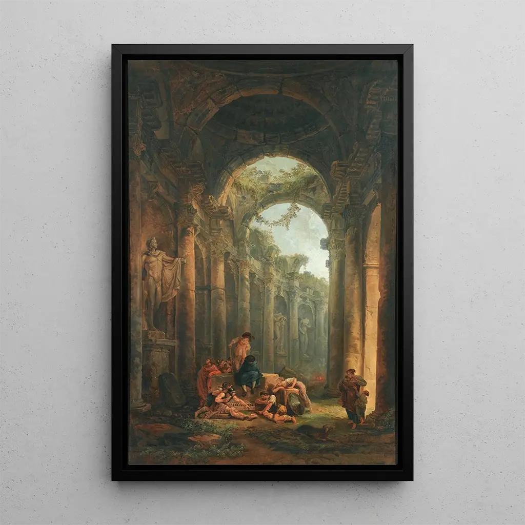Questa affascinante opera di Hubert Robert, "Stampa d'arte classica con soldati che giocano", ci trasporta in un mondo dove storia e gioco si incontrano. Le rovine maestose, resti di un'epoca passata, fungono da sfondo a una scena vivace in cui soldati, impegnati in attività ludiche, si dedicano a giochi infantili. La luce soffusa che inonda la quadro, così come i colori caldi, creano un'atmosfera al tempo stesso nostalgica e gioiosa. La composizione, equilibrata e dinamica, invita lo spettatore a esplorare i dettagli architettonici mentre si sofferma sull'interazione tra i personaggi, rivelando così una sfaccettatura ludica della storia.