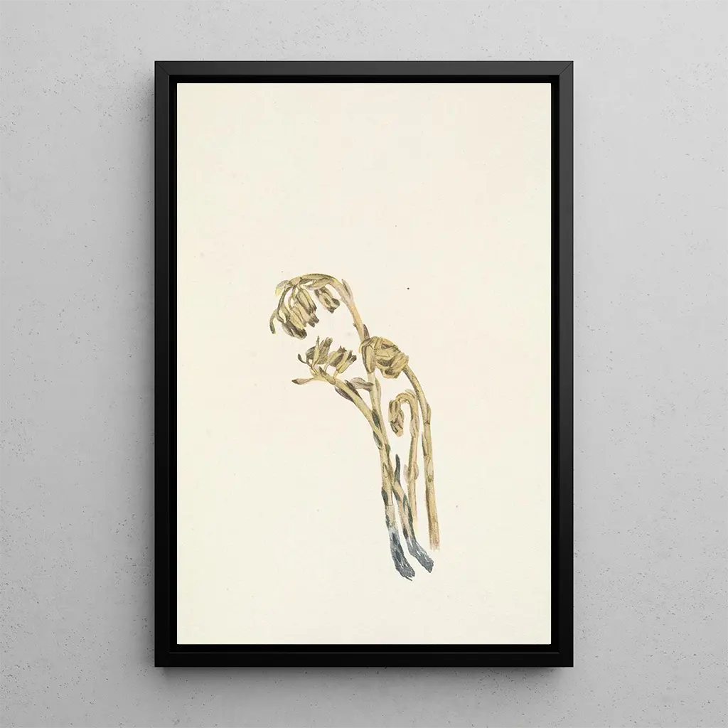 L'Hypopitys americana pallida, conosciuta anche come "pallida della foresta", si rivela con una grazia sottile. Questa stampa d'arte di Mary Vaux Walcott cattura la bellezza effimera di questa pianta rara, con sfumature di giallo pallido e di verde tenero che evocano la dolcezza dei sottoboschi. La tecnica dell'acquarello, utilizzata con raffinatezza, permette di rendere la trasparenza delle foglie e la delicatezza dei fiori. L'atmosfera che si sprigiona da questa stampa d'arte invita a una contemplazione silenziosa, dove ogni dettaglio sembra sussurrare i segreti della natura.