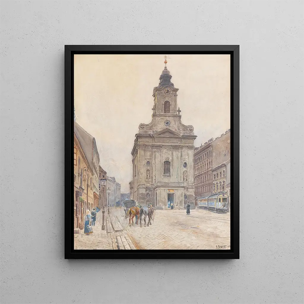 Le style d'Ernst Graner se distingue par une harmonie entre précision technique et sensibilité artistique. La soi-disant Rauchfangkehrerkirche à Vienne révèle une maîtrise des perspectives qui donne vie à l'espace, tout en jouant avec les ombres et les lumières pour accentuer les volumes. Les couleurs, soigneusement choisies, évoquent une palette chaleureuse qui invite à la contemplation. Chaque élément de l'œuvre, des détails architecturaux aux personnages qui peuplent la scène, est traité avec une minutie qui témoigne du respect de l'artiste pour son sujet. La composition, équilibrée et dynamique, guide le regard du spectateur à travers les différentes strates de l'image, créant ainsi un dialogue entre l'œuvre et celui qui l'observe. Cette singularité fait de Graner un artiste à part entière, capable de capturer l'essence d'un lieu tout en y insufflant une dimension intemporelle.