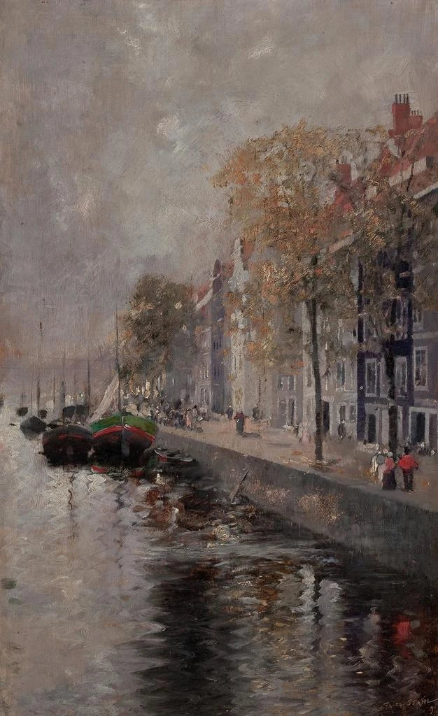 Friedrich Stahl, attivo nel XIX secolo, è riconosciuto per il suo talento nel rappresentare paesaggi urbani con una sensibilità unica. Influenzato dal movimento romantico, ha saputo catturare la bellezza delle città europee, in particolare quella di Amsterdam. La sua opera si distingue per un'attenzione minuziosa ai dettagli architettonici e alla luce, conferendogli una dimensione quasi poetica. Attraverso i suoi quadri, Stahl invita lo spettatore a riscoprire luoghi familiari sotto una nuova luce, rendendolo un artista essenziale per comprendere l'evoluzione della pittura di paesaggio in quel periodo.