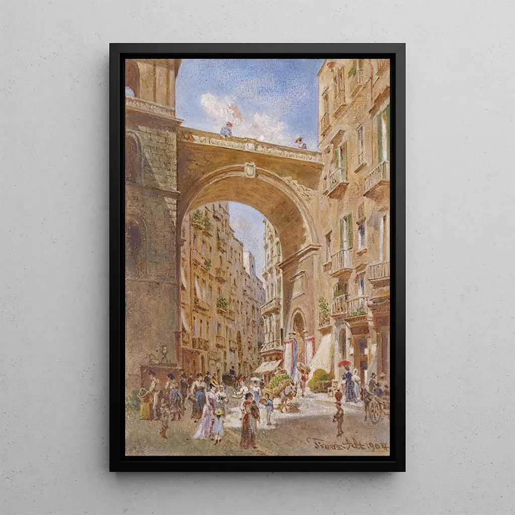 La stampa d'arte "Naples Pont de Chiaia" di Franz Alt cattura l'essenza vibrante della vita napoletana. La composizione mette in evidenza un ponte maestoso, immerso in una luce dorata, mentre personaggi animati si muovono sulla scena. I colori caldi e le sfumature delicate del cielo creano un'atmosfera allo stesso tempo gioiosa e nostalgica. Alt utilizza una tecnica di pittura ad olio che dà vita ai dettagli architettonici e alla texture degli abiti dei passanti, invitando lo spettatore a immergersi in questa scena quotidiana intrisa di poesia.