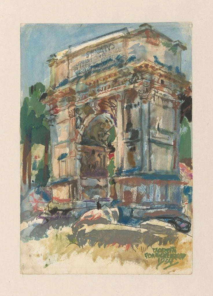Martin Monnickendam, né à la fin du XIXe siècle, est un pittore néerlandais dont le travail s'inscrit dans un contexte historique riche. Influencé par le réalisme et l'impressionnisme, il a su capturer des scènes historiques et des paysages avec une grande finesse. L'arc de Titus, monument construit en 81 après J.-C. pour commémorer la victoire de l'empereur Titus, est un sujet qui résonne avec l'intérêt de Monnickendam pour l'histoire et l'architecture. En représentant ce monument, il témoigne de l'importance de la mémoire et de l'héritage culturel, tout en s'inscrivant dans une tradition artistique qui valorise le passé.