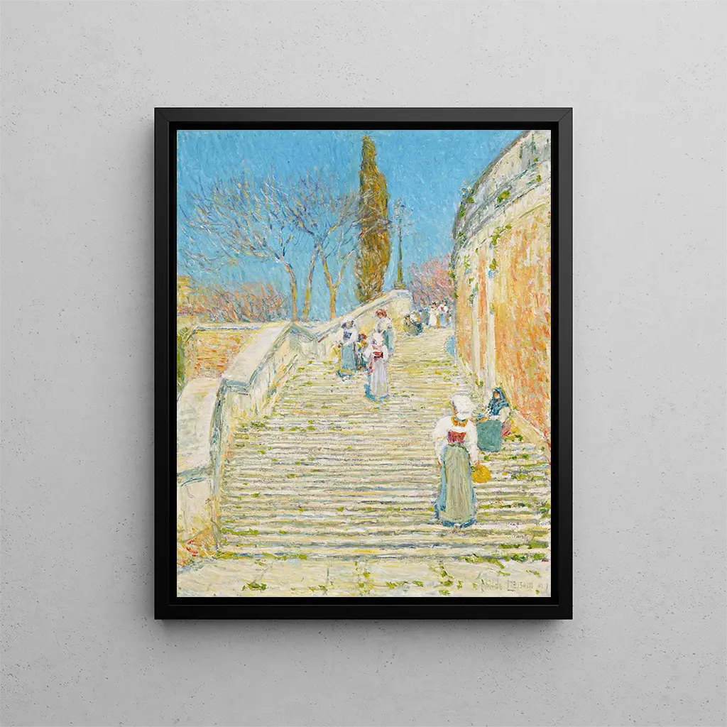 La "Place d'Espagne à Rome" di Childe Hassam è un'opera che trascende il semplice quadro pittorico per immergere lo spettatore in un'atmosfera vibrante e poetica. Questo quadro, emblematico del movimento impressionista americano, evoca non solo la bellezza architettonica di Roma, ma anche l'effervescenza di una vita urbana in piena fermentazione. I colori vivaci e i tocchi di pennello dinamici invitano a un'esplorazione sensoriale, dove ogni dettaglio sembra respirare luce e movimento. Contemplando questa opera, si viene trasportati nel cuore della città eterna, dove arte e vita si mescolano armoniosamente. Stile e unicità dell’opera Lo stile di Childe Hassam si caratterizza per un uso audace del colore e della luce, creando così un'atmosfera unica che rende ogni quadro un'esperienza immersiva. In "Place d'Espagne a Roma", l'artista gioca con i contrasti e le armonie cromatiche per rendere conto della vivacità della scena. Le ombre danzanti degli alberi, i riflessi delle facciate e l'animazione dei passanti sono tanti elementi che si intrecciano in una danza visiva affascinante. Hassam, maestro dell'impressionismo, riesce a catturare l'effimero, a congelare l'istante lasciando trasparire una sensazione di movimento perpetuo. Questo quadro è un'ode alla bellezza fugace della vita cittadina, dove ogni elemento contribuisce a una composizione equilibrata e dinamica. L’artista e la sua influenza Childe Hassam, figura di spicco dell'impressionismo americano, ha saputo affermarsi sulla scena artistica internazionale grazie al suo approccio innovativo e alla sua sensibilità unica. Influenzato dai grandi maestri europei, ha sviluppato uno stile proprio, mescolando tradizione e modernità. Il suo amore per la luce e il colore lo ha portato a esplorare vari temi, dalla vita urbana ai paesaggi bucolici. Hassam ha anche svolto un ruolo fondamentale nella promozione dell'impressionismo negli Stati Uniti, contribuendo all'emergere di una nuova generazione di artisti. Il suo lavoro ha avuto un impatto duraturo sullo sviluppo dell'arte moderna, e il suo lascito continua a ispirare molti creatori contemporanei.
