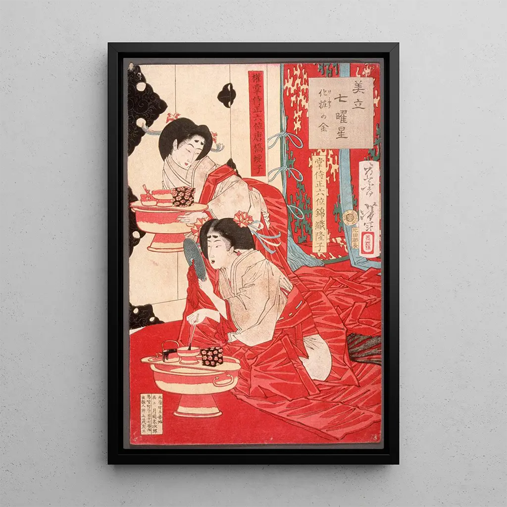 In l'opera "Metallo per l'oscuramento dei denti", Tsukioka Yoshitoshi ci immerge in un universo affascinante dove la bellezza e la cultura si intrecciano. Questa stampa d'arte vibrante di colori scuri e di dettagli minuziosi evoca una pratica tradizionale giapponese, quella dell'oscuramento dei denti, simbolo di bellezza e di status sociale. La tecnica della stampa su carta, caratteristica dell'ukiyo-e, conferisce a questa tela un'atmosfera al tempo stesso misteriosa e coinvolgente. Le sfumature di nero e d'oro, così come i motivi delicati, invitano a una contemplazione profonda di questa usanza singolare.
