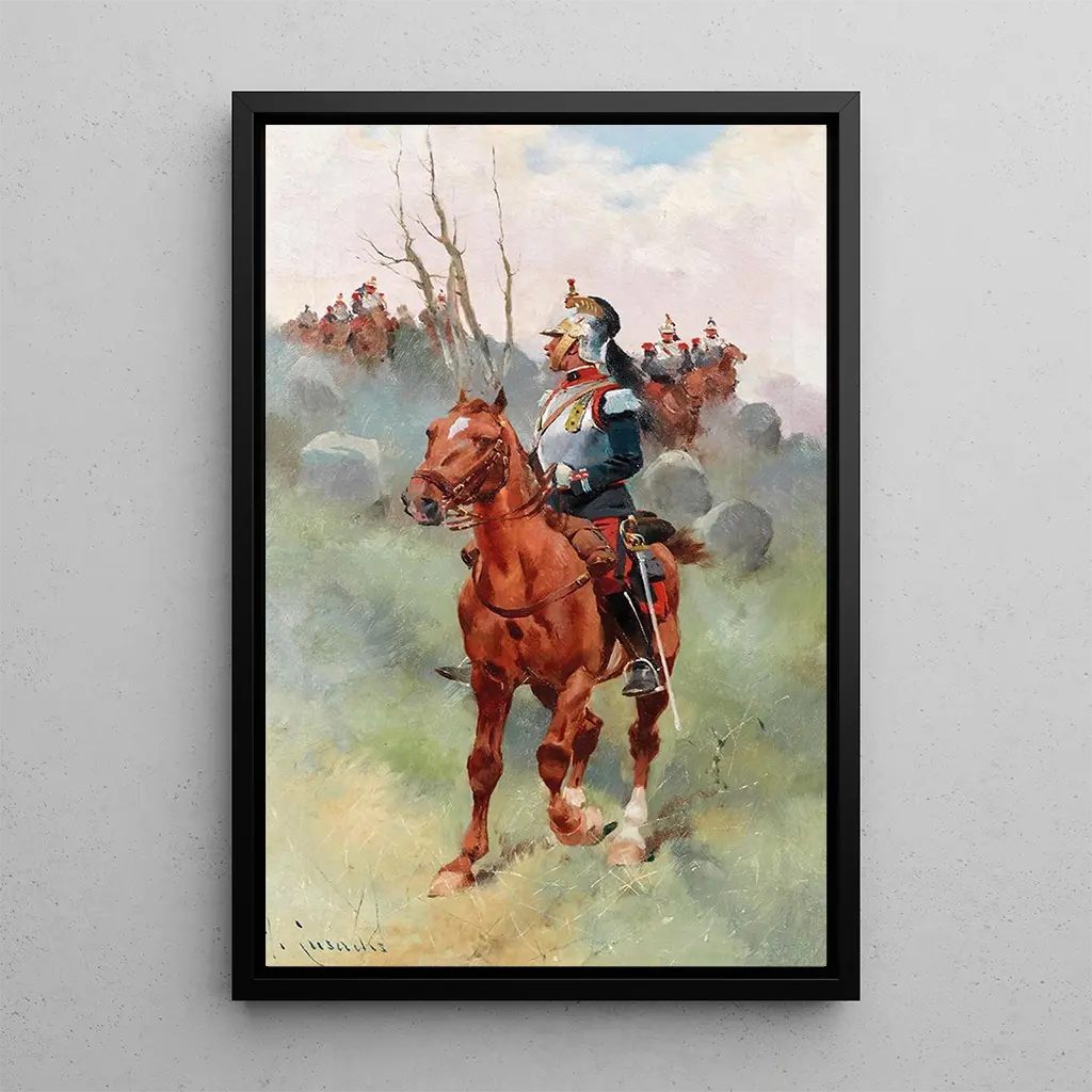 In "Alla testa delle truppe", José Cusachs dipinge un momento di coraggio e determinazione, dove un comandante militare si erge fiero all'avanguardia. I colori vivaci e i dettagli minuziosi degli uniformi e dei cavalli creano una dinamica coinvolgente. La composizione, centrata sulla figura del leader, trasmette un senso di movimento ed energia, catturando l'essenza del coraggio e della strategia. L'atmosfera è allo stesso tempo drammatica e ispiratrice, invitando lo spettatore a immergersi nell'universo militare del XIX secolo, dove onore e dovere occupavano un ruolo preponderante.