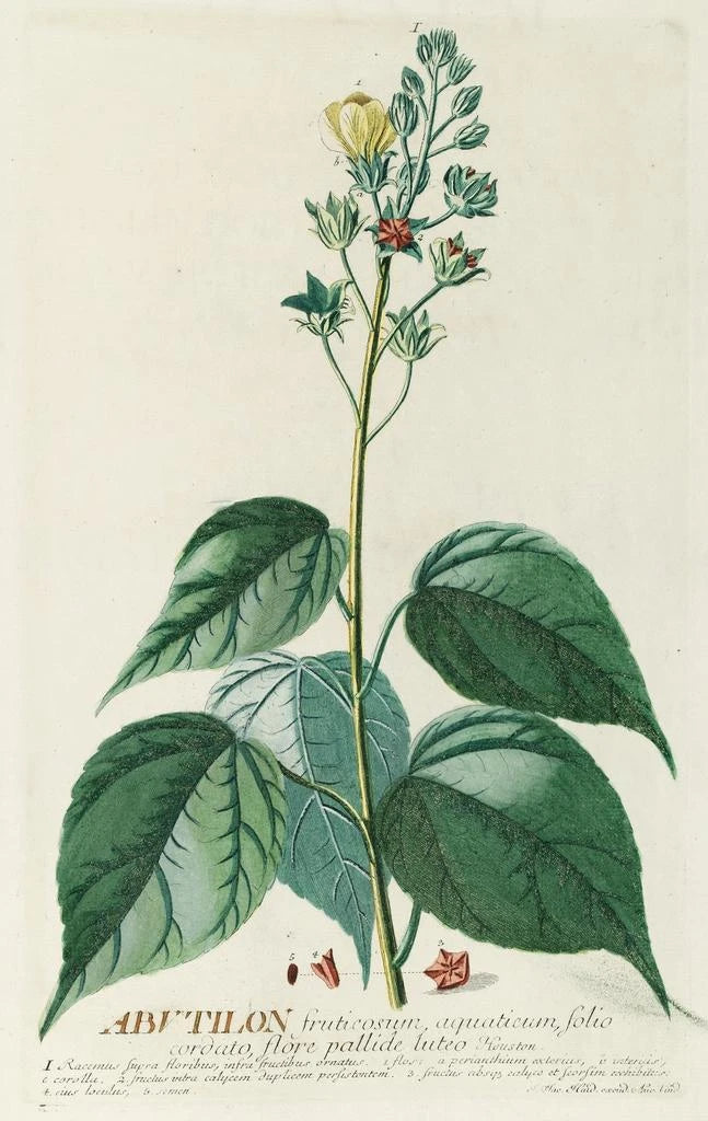 Georg Dionysius Ehret, attivo nel XVIII secolo, è famoso per le sue illustrazioni botaniche che uniscono arte e scienza. Influenzato dalle scoperte scientifiche del suo tempo, ha saputo catturare la diversità delle piante con una precisione senza pari. Il suo lavoro ha svolto un ruolo chiave nella documentazione delle specie vegetali, ed è spesso considerato uno dei pionieri della stampa d'arte botanica. Le sue opere, tra cui "Abutilon", testimoniano un'epoca in cui arte e scienza si univano per celebrare la bellezza del mondo naturale.