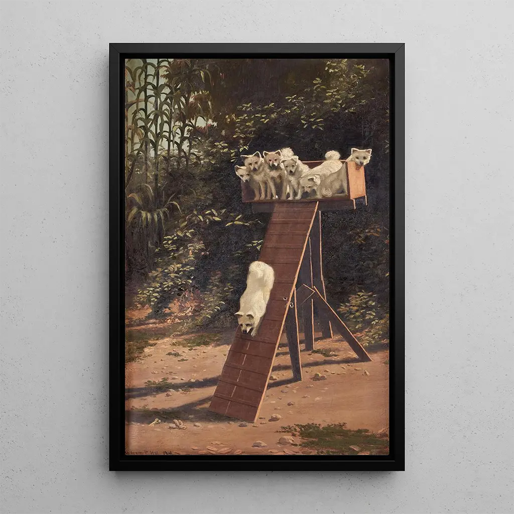 Andrew Putnam Hill, actif à la fin du XIXe siècle et au début du XXe siècle, est connu pour ses représentations de la vie quotidienne, souvent centrées sur des thèmes animaliers. Influencé par le mouvement impressionniste, Hill a su capturer des moments fugaces avec une grande sensibilité. Son travail reflète une époque où l'art se tournait vers des sujets plus accessibles et familiers, loin des grandes scènes historiques. "Dressage de chien" s'inscrit dans cette tradition, mettant en avant la beauté des interactions simples et authentiques entre les êtres vivants, tout en témoignant de l'évolution de la représentation artistique.