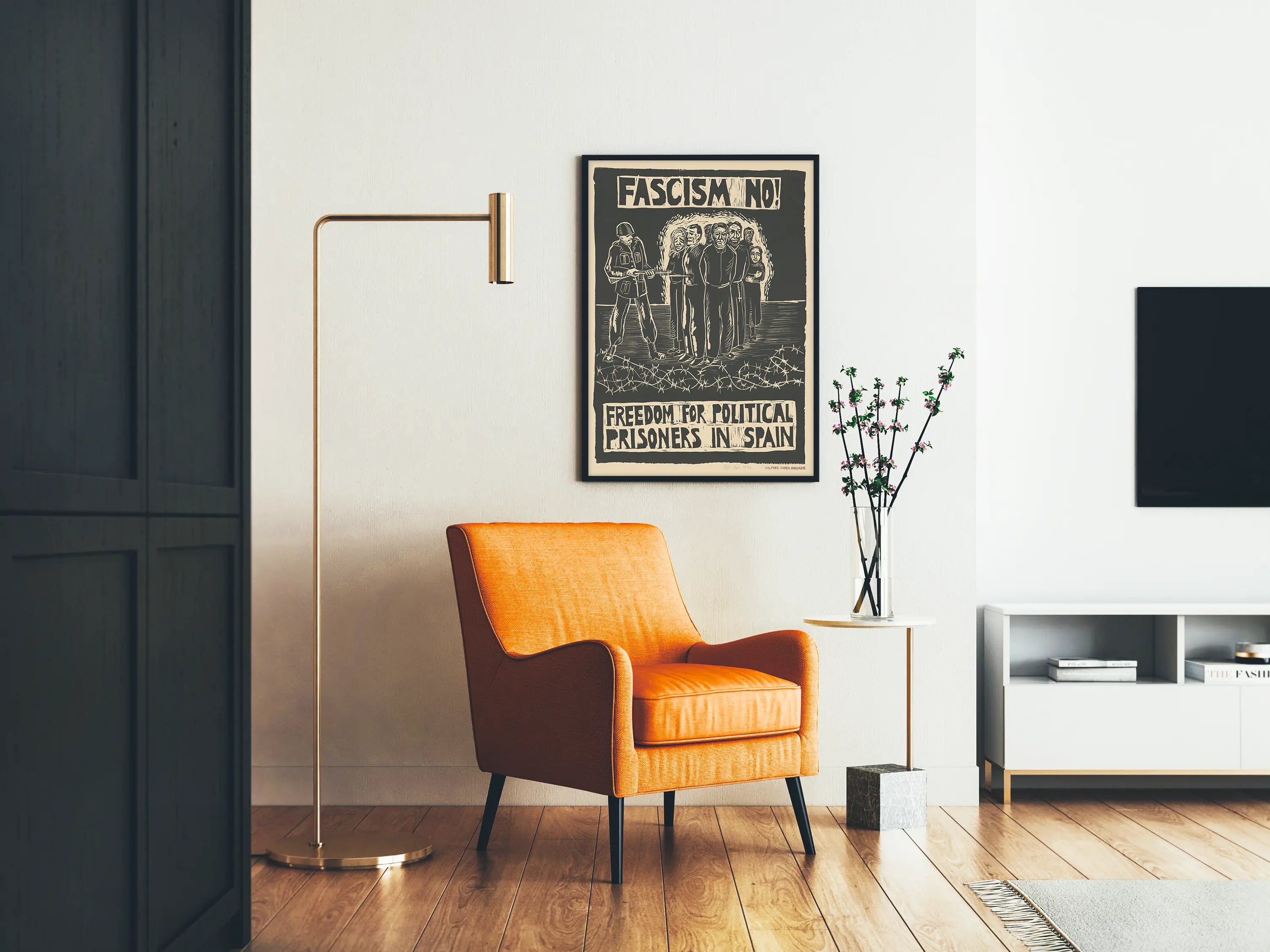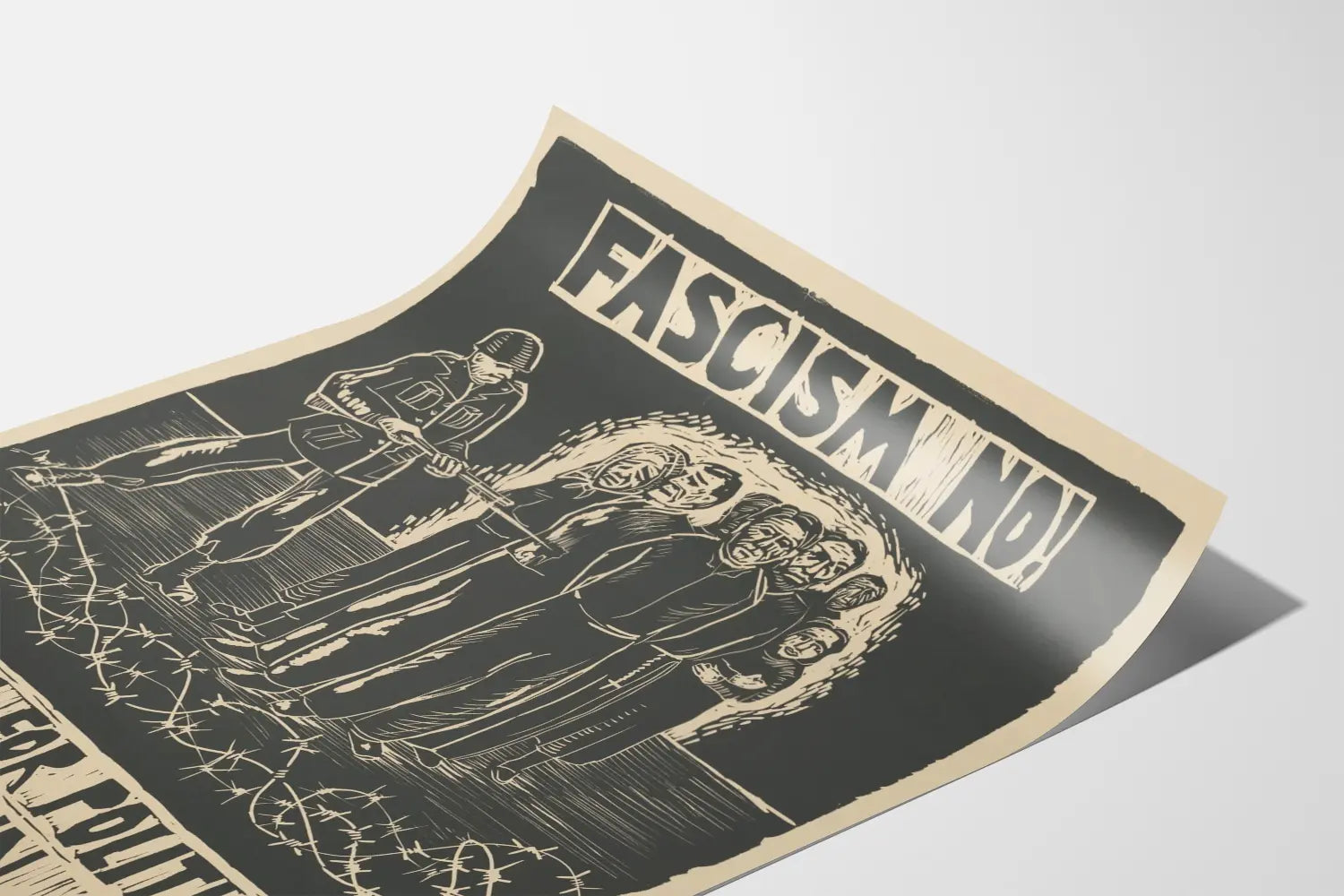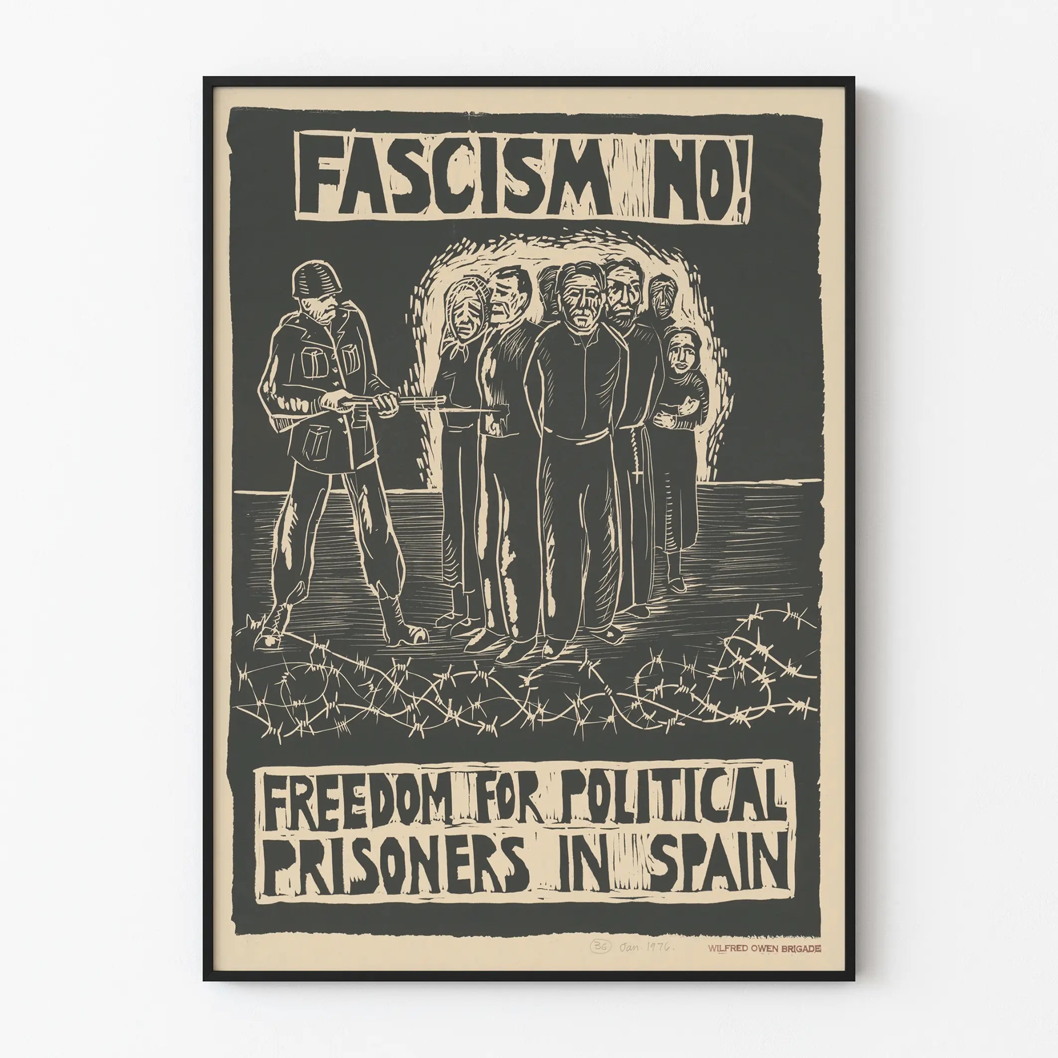 Questa locandina murale dallo stile grafico forte e contrastato illustra un messaggio incisivo contro il fascismo e a favore della libertà dei prigionieri politici in Spagna. La composizione raffigura un gruppo di persone con volti segnati dalla paura e dalla rassegnazione, allineate davanti a un soldato armato, simbolo di oppressione e repressione politica. Sullo sfondo, una luce illumina i personaggi, rafforzandone la presenza e la tensione drammatica della scena. Il bordo inferiore è decorato con filo spinato, sottolineando il concetto di cattività e lotta contro l'ingiustizia. Il testo in lettere maiuscole «FASCISMO NO!» e «LIBERTÀ PER I PRIGIONIERI POLITICI IN SPAGNA» accentua l'urgenza della causa difesa. Questa locandina, utilizzabile come poster o decorazione murale impegnata, conferisce un tocco storico e militante a qualsiasi ambiente. È particolarmente adatta agli appassionati di decorazione murale sensibili a un messaggio sociale. Il suo grafismo monocromatico a tonalità scure si integra bene in un arredamento interno moderno o industriale. Scegliere questo poster significa optare per una decorazione murale ricca di simbolismo, che stimola una riflessione sui temi del fascismo, della resistenza e dei diritti umani. Questa stampa rappresenta una scelta unica per arricchire una collezione di arte politica o semplicemente per decorare un muro con un elemento portatore di significato.