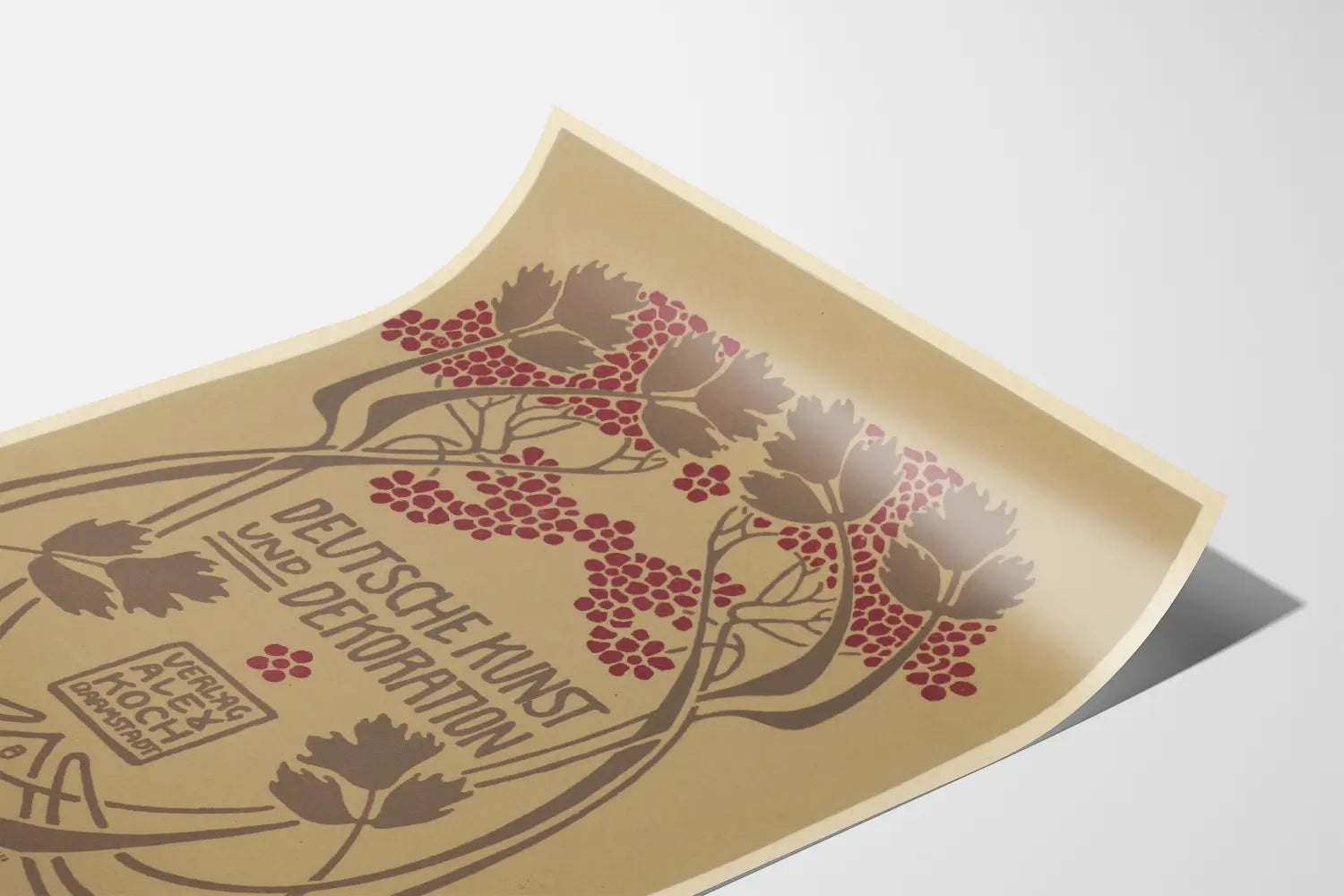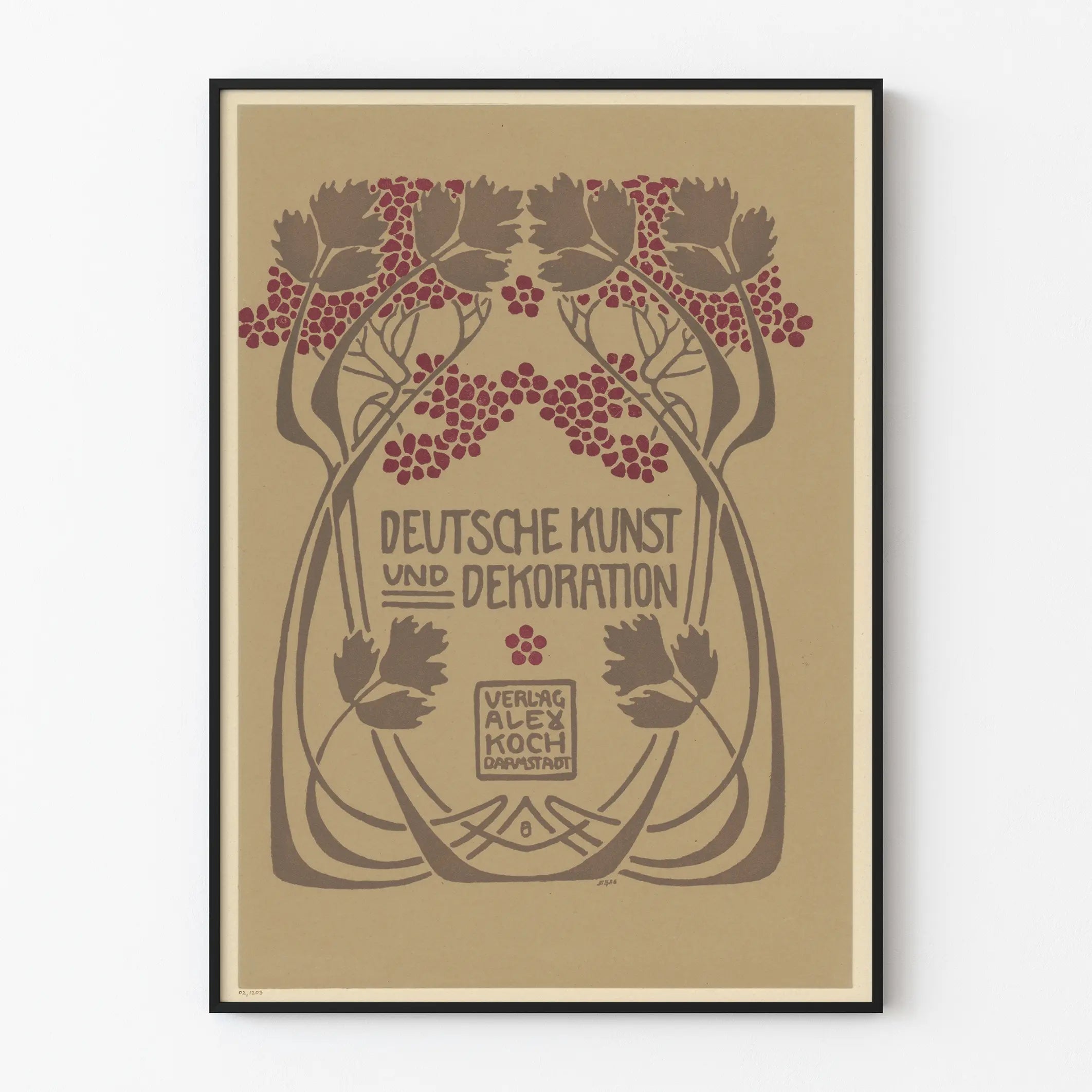 Scoprite questa locandina unica dallo stile Art Nouveau, intitolata "Arte e Decorazione Tedesca". Caratterizzata da linee curve e motivi floreali stilizzati, questa decorazione murale rappresenta un esempio tipico del design tedesco delle prime metà del XX secolo. I colori caldi, con tonalità marroni e rosse profonde, creano un’atmosfera accogliente e naturale, ideale per un ambiente sia classico che elegante. Questa locandina si distingue per il suo equilibrio grafico, dove gli elementi vegetali incorniciano armoniosamente il testo centrale. Pensata per gli appassionati di decorazioni murali storiche e di arte grafica, offre un tocco decorativo originale a qualsiasi spazio di vita, lavoro o relax. La sua estetica raffinata e lo stile retrò la rendono un poster perfetto per valorizzare una parete, sia nel soggiorno, in ufficio o in una biblioteca. Come opera d’arte grafica, questa locandina richiama anche il patrimonio culturale tedesco nel campo della decorazione e del design. Una scelta di prima qualità per arricchire la tua collezione di locandine o per decorare le pareti con un’atmosfera artistica firmata dai primi movimenti moderni. Questo poster su carta naturale conferisce un tocco autentico alla tua decorazione murale, portando un’aria di storia e raffinatezza. Regalati un pezzo raro, che coniuga arte decorativa ed estetica vintage, per un ambiente che unisce fascino e carattere.