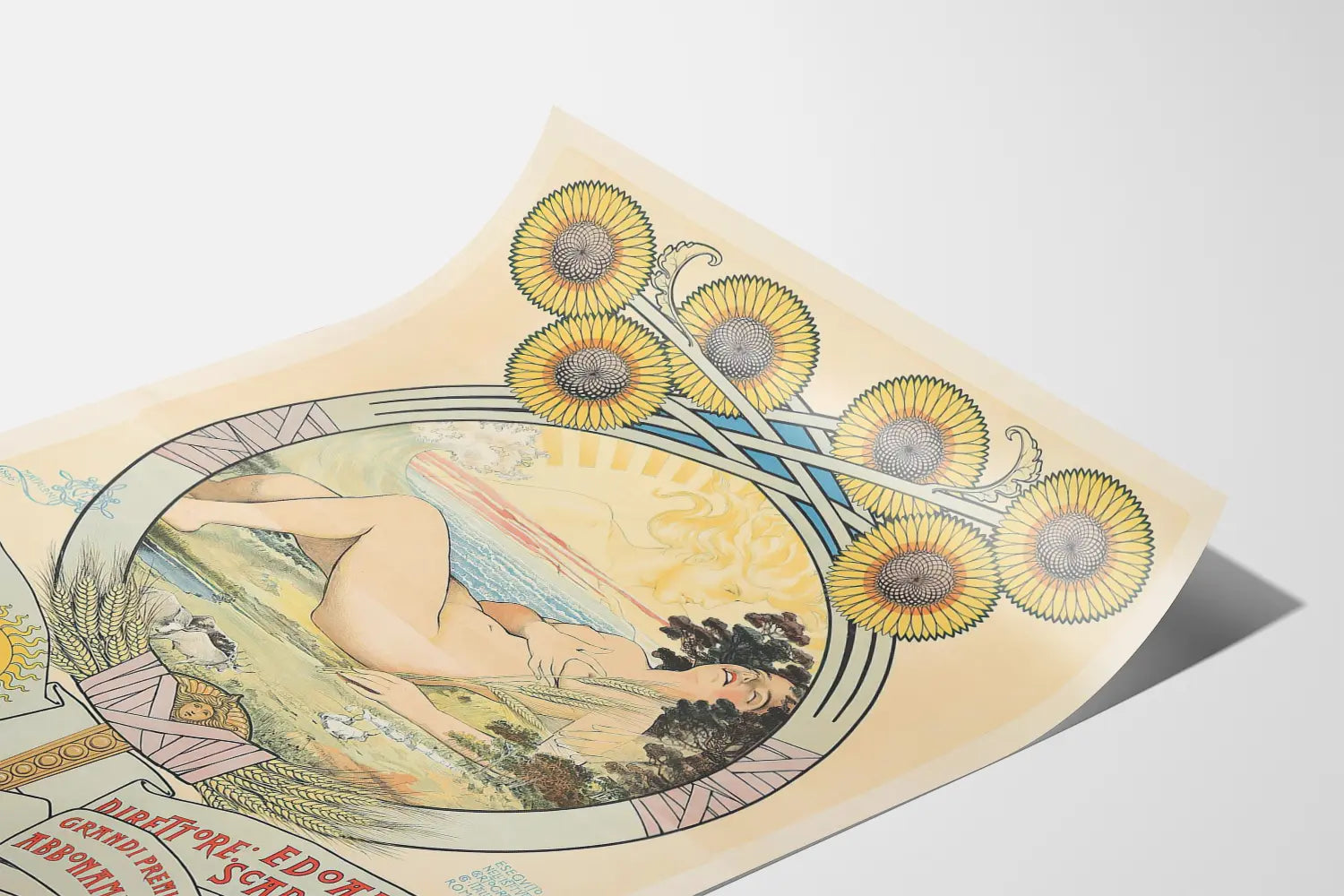 Questa locandina in stile Art Nouveau, intitolata Il Mattino, è un’opera decorativa murale affascinante ed elegante. Rappresenta una figura femminile distesa, simbolo di natura e rinnovamento, circondata da un cerchio decorato con motivi floreali. In alto, sette girasoli splendenti aggiungono un tocco solare e luminoso, evocando l’energia del mattino e il ciclo naturale delle stagioni. La cornice circolare e gli elementi grafici decorativi sottolineano l’estetica armoniosa tipica del movimento Art Nouveau, caratterizzata da linee fluide e forme organiche. Questa locandina si presta perfettamente a un ambiente interno raffinato e ispirante, ideale per chi desidera integrare un’opera d’arte grafica nella propria collezione di poster decorativi. La scelta dei colori, dominata da tonalità gialle luminose, azzurri delicati e sfumature di beige, conferisce a questa opera un’atmosfera calda e rilassante. Il testo in banner, in basso sulla locandina, aggiunge un tocco vintage con una tipografia curata che ricorda le locandine pubblicitarie o letterarie d’epoca. Questa decorazione murale è adatta a spazi vari, come un soggiorno, una camera o uno studio, cercando di unire tradizione artistica e modernità dello stile Art Nouveau. Questo poster può diventare un vero punto focale in una stanza, portando fascino ed eleganza grazie al soggetto iconografico che unisce natura, femminilità e poesia grafica.