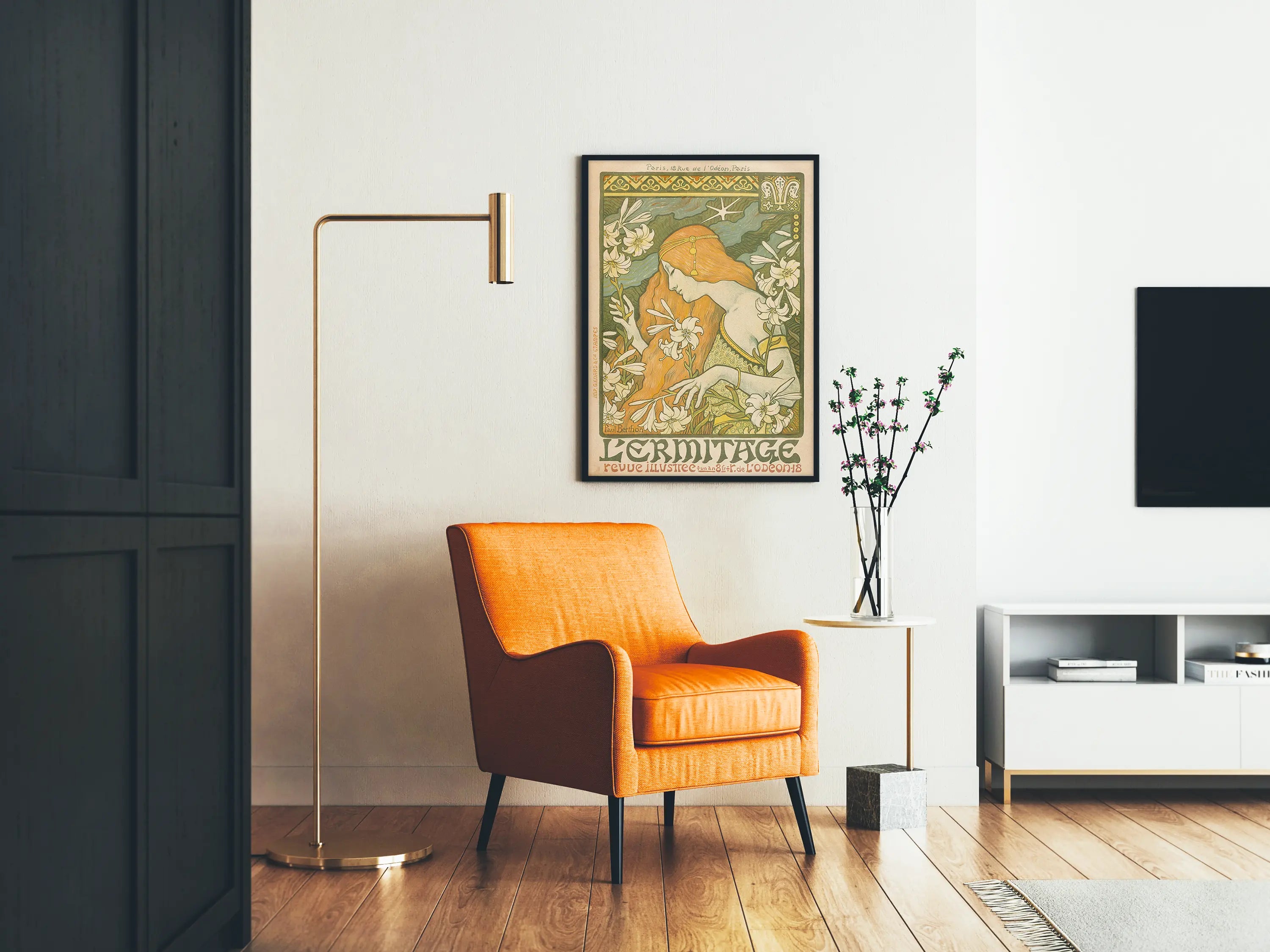 Scegliete questa stampa per creare un'atmosfera al tempo stesso romantica e stilizzata, perfettamente rappresentativa dello stile Art Nouveau che celebra la natura e la bellezza femminile. È un elemento decorativo da parete che, grazie alla sua ricchezza visiva e al suo estetismo unico, arricchirà l'arredamento della vostra stanza, affermando un gusto deciso per l'arte e il vintage.