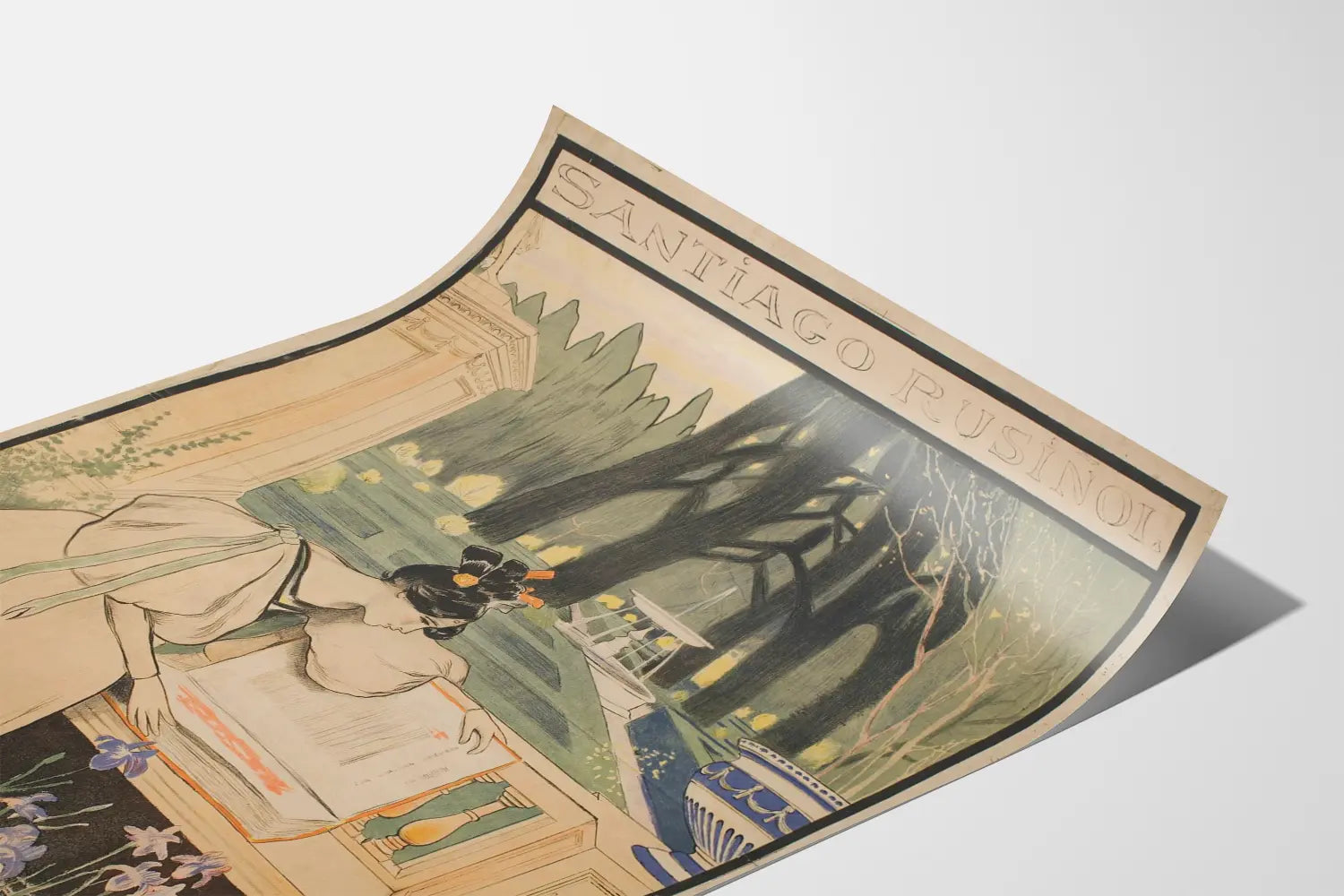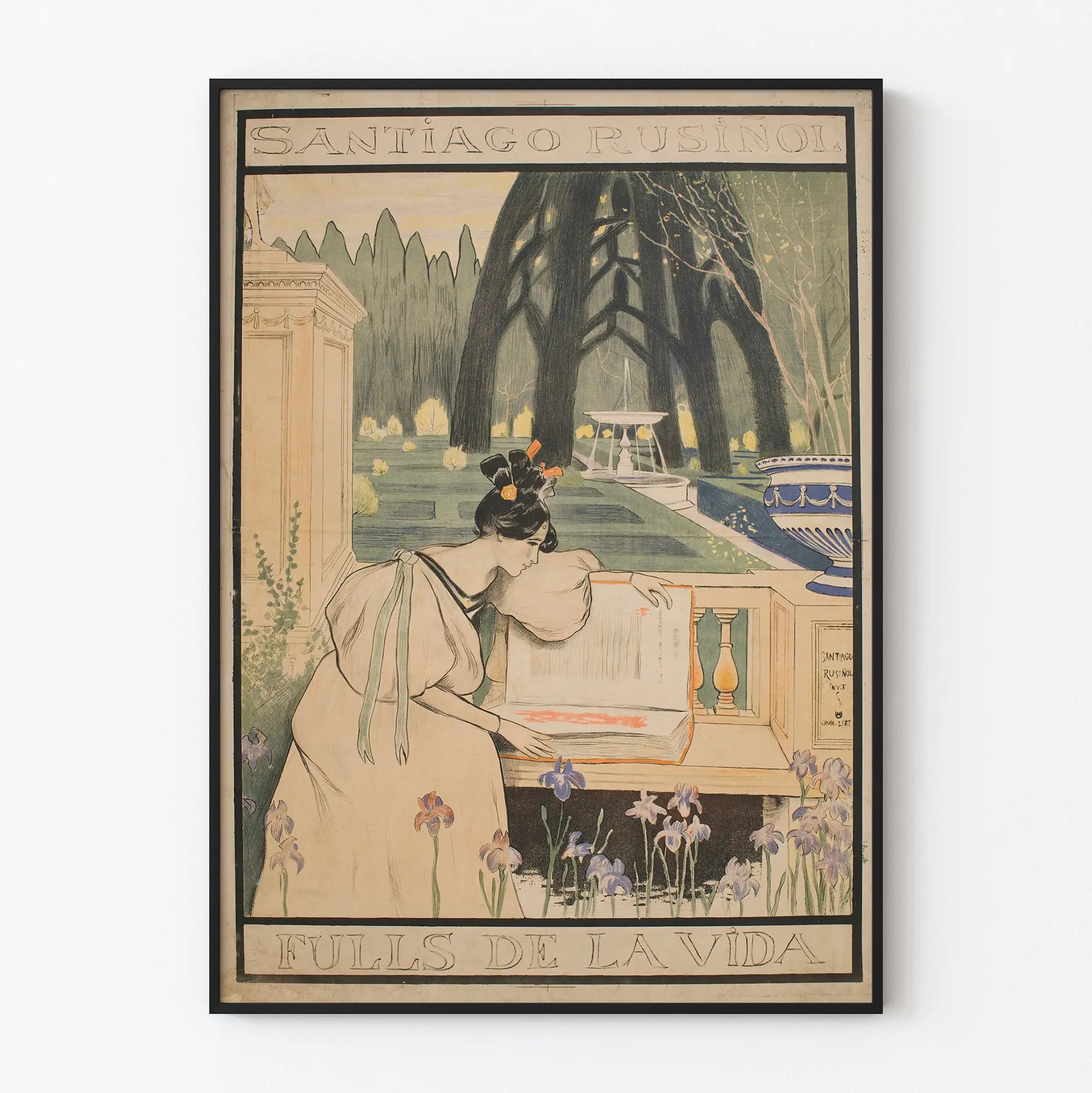 Questa stampa Art Nouveau intitolata « Fulls de la Vida » di Santiago Rusiñol è una decorazione murale raffinata che porterà un tocco di eleganza classica nel vostro interno. Questa locandina raffigura una scena tranquilla e poetica in un giardino stilizzato, dove una donna vestita con un abito d’epoca è assorta nella lettura di un grande libro aperto. I colori delicati e armoniosi, così come le linee fluide e delicate caratteristiche del movimento Art Nouveau, creano un’atmosfera rilassante e sofisticata.