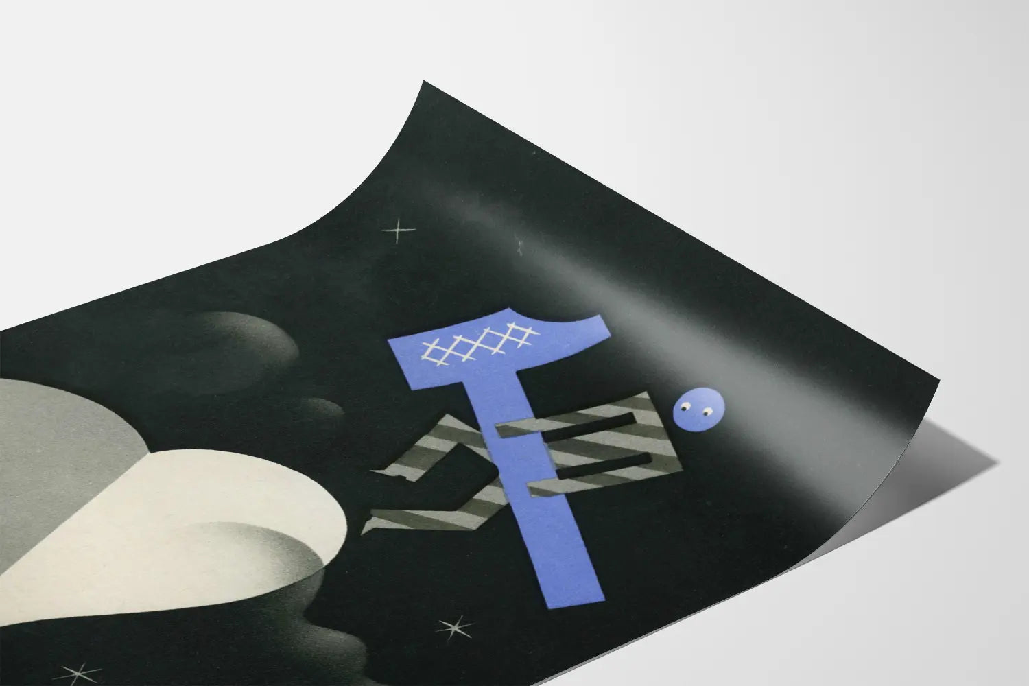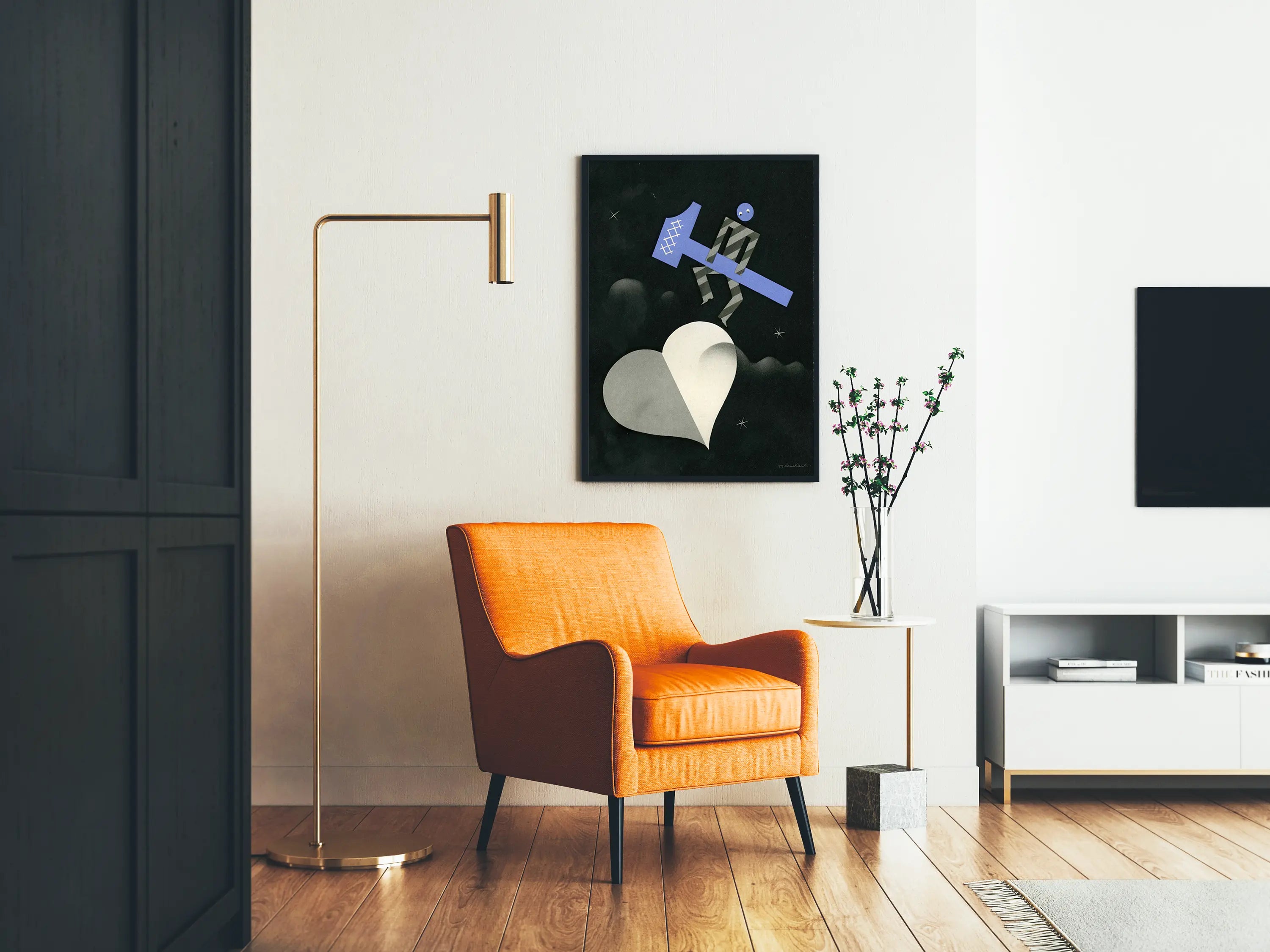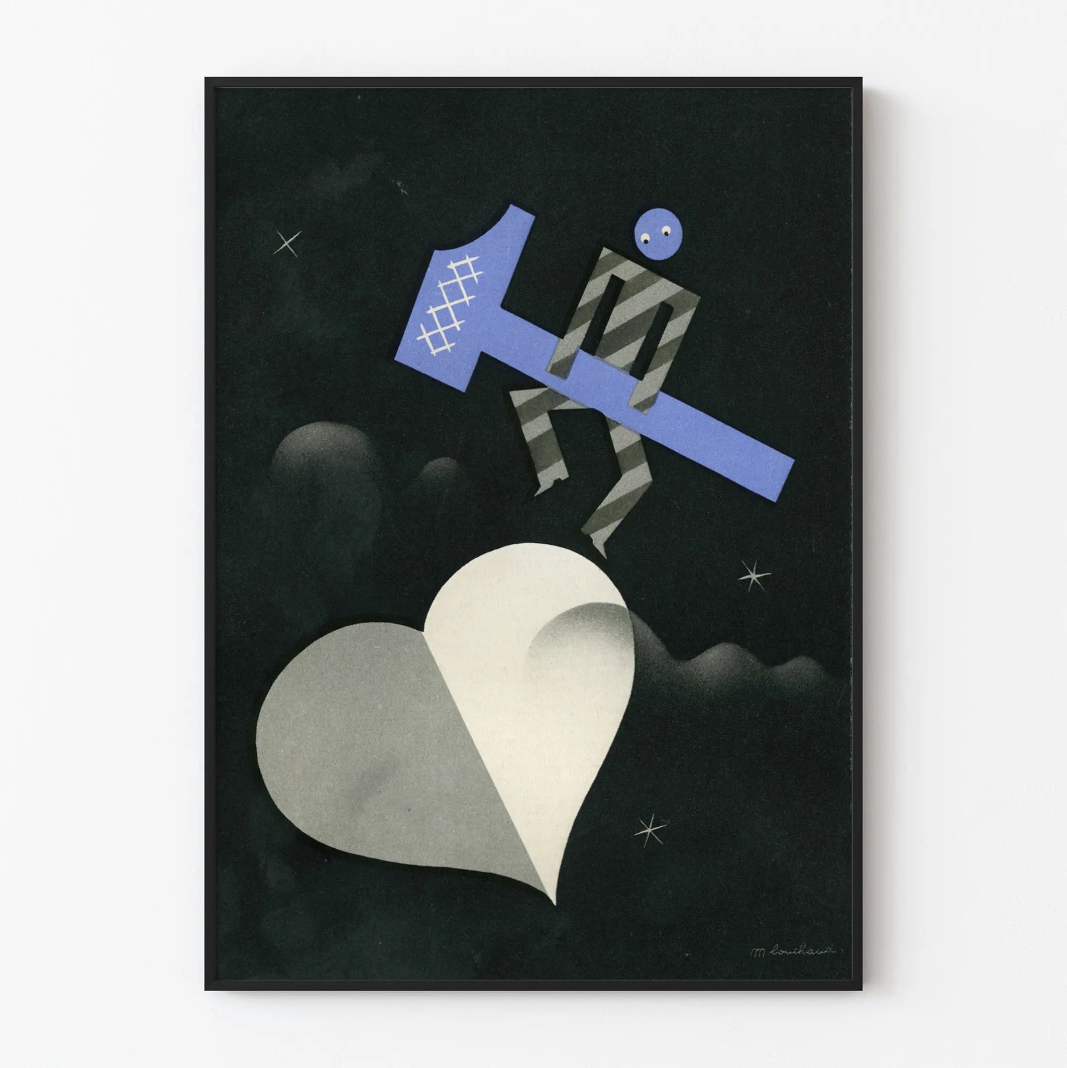 Questa stampa decorativa aggiunge un tocco di originalità e modernità alla vostra decorazione murale grazie al suo design astratto e minimalista. Su uno sfondo scuro, si distingue una figura geometrica composta da forme semplici. Questa figura, formata da un cerchio blu per la testa e da un corpo e arti con linee grigie a strisce, sembra tenere un grande oggetto dalla forma geometrica blu vibrante. Sotto, un cuore stilizzato, diviso in parti grigie e bianche, crea un forte contrasto grafico, accentuato dalle forme pulite e dalle sfumature sottili. Lo sfondo nero, punteggiato di piccole stelle bianche, conferisce un’atmosfera notturna e leggermente onirica a questa composizione. Questa stampa si inserisce perfettamente in un universo di decorazione contemporanea, combinando forme geometriche, colori contrastanti e semplicità figurativa. Rappresenta una decorazione murale originale che attirerà lo sguardo, donando al contempo un carattere unico e artistico a un ambiente. Perfetta per abbellire un soggiorno, una camera o uno spazio di lavoro, questa stampa si abbinerà sia a decorazioni moderne che minimaliste. Questo poster offre un equilibrio estetico tra astrazione e simbolismo, con gli elementi del cuore e della figura, evocando tematiche come l’emozione, la ricerca o la connessione umana, rimanendo comunque sufficientemente aperto all’interpretazione personale. Come elemento decorativo murale, permette di aggiungere una nota artistica e contemporanea, ideale per chi cerca un oggetto da parete sia decorativo che portatore di significato. Collocate questa stampa nel vostro spazio per vivacizzare l’atmosfera interna con uno stile grafico e moderno, godendo al contempo di un’opera murale che suscita curiosità e riflessione visiva.