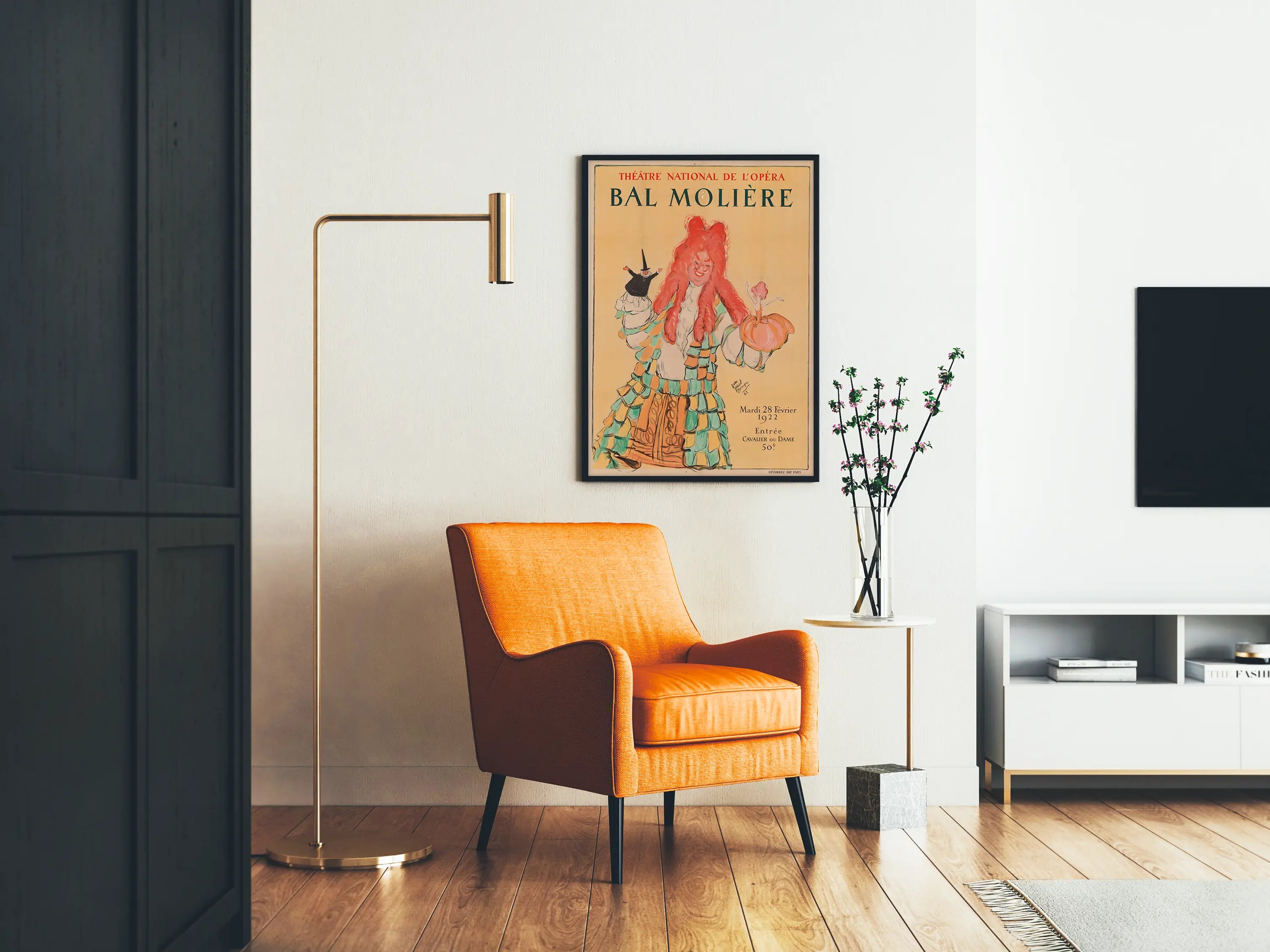 Questa locandina vintage del Ballo Molière al Teatro Nazionale dell'Opera illustra uno stile unico e fascino d'epoca, perfetta per arricchire la vostra decorazione murale con un tocco artistico e storico. Datata 28 febbraio 1922, evoca un'atmosfera festosa e teatrale, ampiamente caratterizzata dai costumi colorati e dal trucco tipico delle balli in maschera di quel periodo. Al centro, un personaggio vestito con una grande parrucca rossa sfavillante e un costume con volant verdi e arancioni tiene in ogni mano una piccola figurina in costume, probabilmente simbolo della tradizione dello spettacolo e della danza. Questa locandina si distingue per i colori vivaci su uno sfondo beige che dona calore e autenticità al vostro spazio. Che sia per un salotto, un ufficio o una sala culturale, questo poster da parete crea un'atmosfera elegante e originale. È anche un'opera decorativa rivolta agli amanti del teatro, delle arti grafiche e degli eventi storici. Stampata con cura, questa locandina del ballo mette in evidenza un momento festoso del Teatro Nazionale dell'Opera, rendendo omaggio alla tradizione francese dei balli in maschera. Perfetta come poster o quadro da parete, questo pezzo aggiunge un tocco vintage e culturale al vostro interno, ideale per uno stile retrò o barocco rivisitato. Un oggetto di decorazione murale che racconta una storia, conferendo carattere alle vostre pareti.