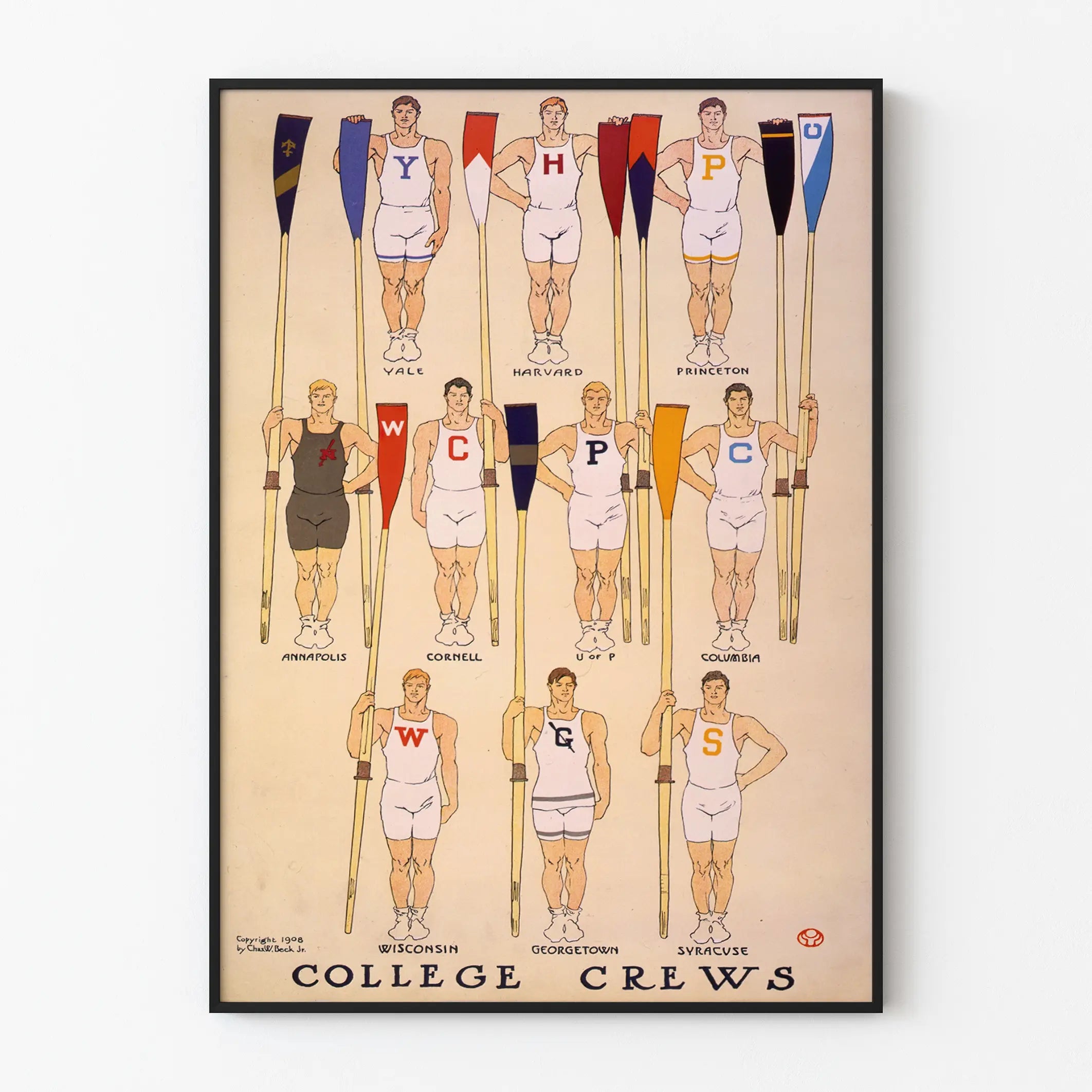 Aggiungi un tocco di eleganza retrò alla tua decorazione murale con questa locandina vintage raffigurante le squadre di canottaggio delle grandi università americane. Illustrata con precisione e cura, questa locandina colorata mette in scena undici vogatori vestiti con divise bianche o scure, ognuno con una pagaia distintamente marcata con le iniziali e i colori delle università come Yale, Harvard, Princeton, Annapolis, Cornell, Columbia e altre. Ogni vogatore è disegnato in una postura fiera e eretta, simbolo di vigore e spirito di squadra tipici di questo sport di resistenza. Questa stampa si presenta come un elemento decorativo ideale per gli appassionati di sport, di storia universitaria o per chi desidera infondere uno stile classico e sportivo nel proprio ambiente. Il suo stile grafico dell’inizio del XX secolo, datato 1908, le conferisce un carattere autentico apprezzato negli ambienti moderni e tradizionali. Facile da incorniciare, questa opera decorativa può integrarsi perfettamente in un ufficio, un soggiorno o una palestra. È anche un regalo eccellente per gli appassionati di canottaggio, gli studenti o i nostalgici delle prestigiose università americane. In sintesi, questa locandina è molto più di una semplice decorazione murale: è una celebrazione visiva della disciplina e della storia dello sport universitario, perfettamente adatta a un ambiente contemporaneo o vintage.