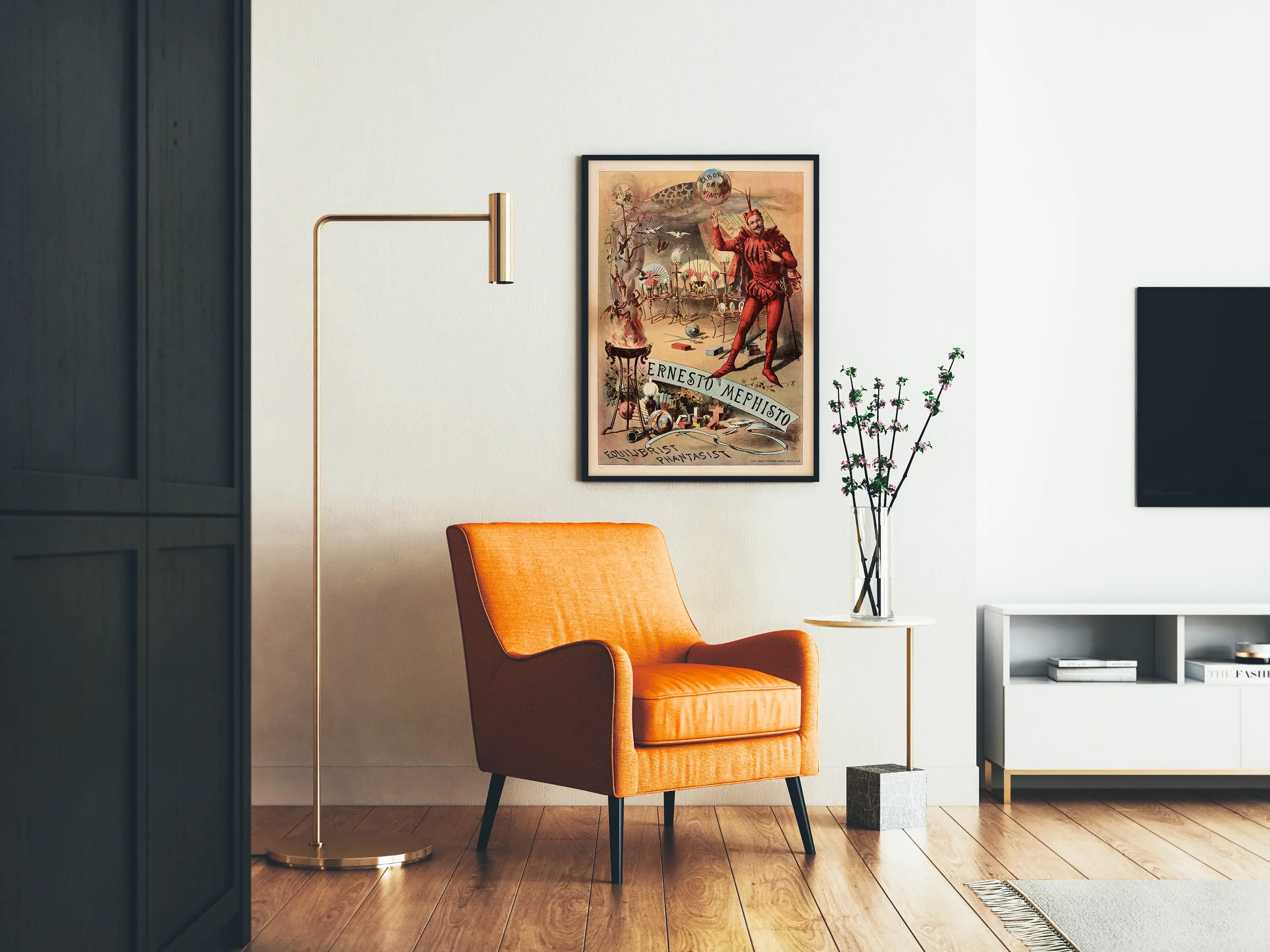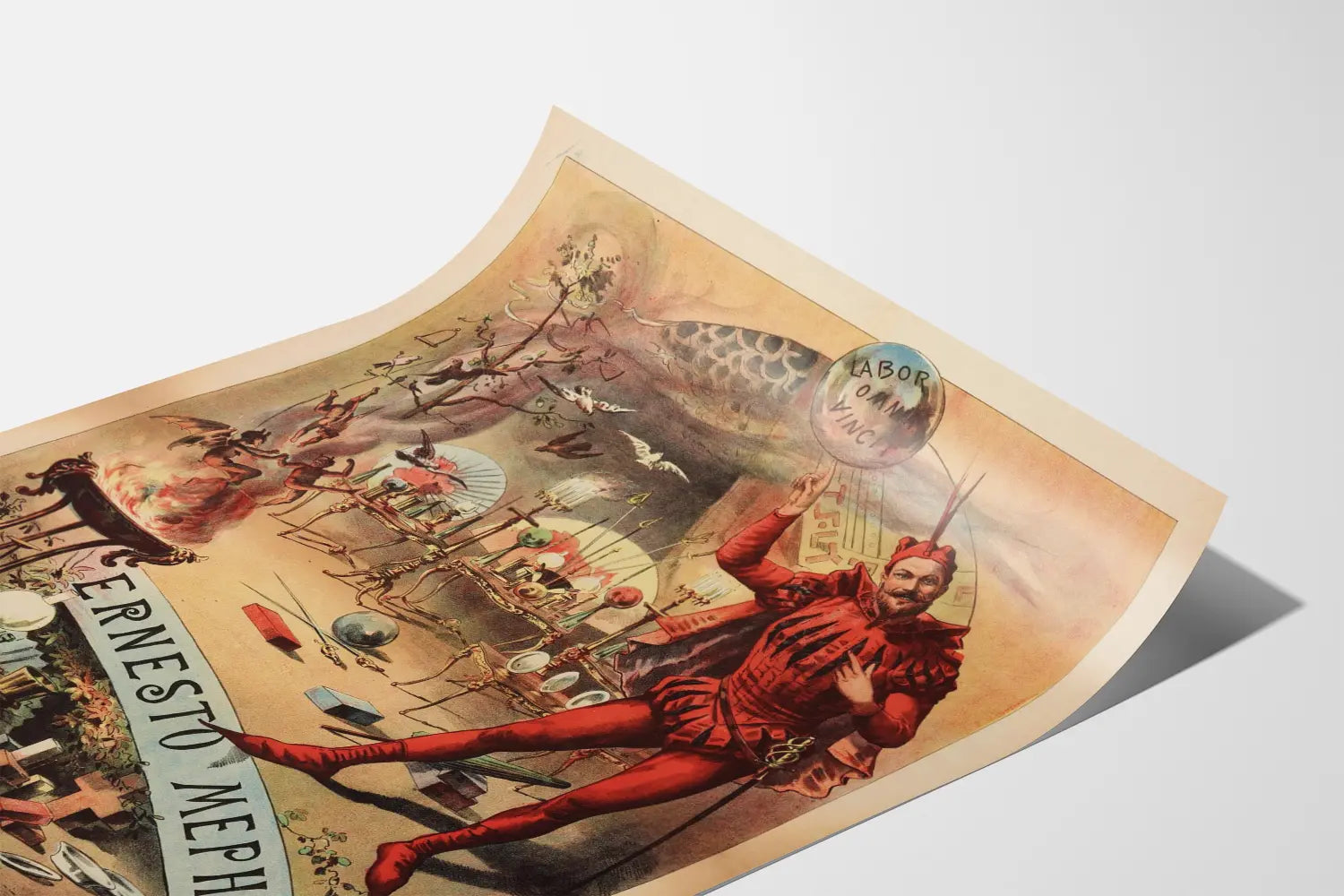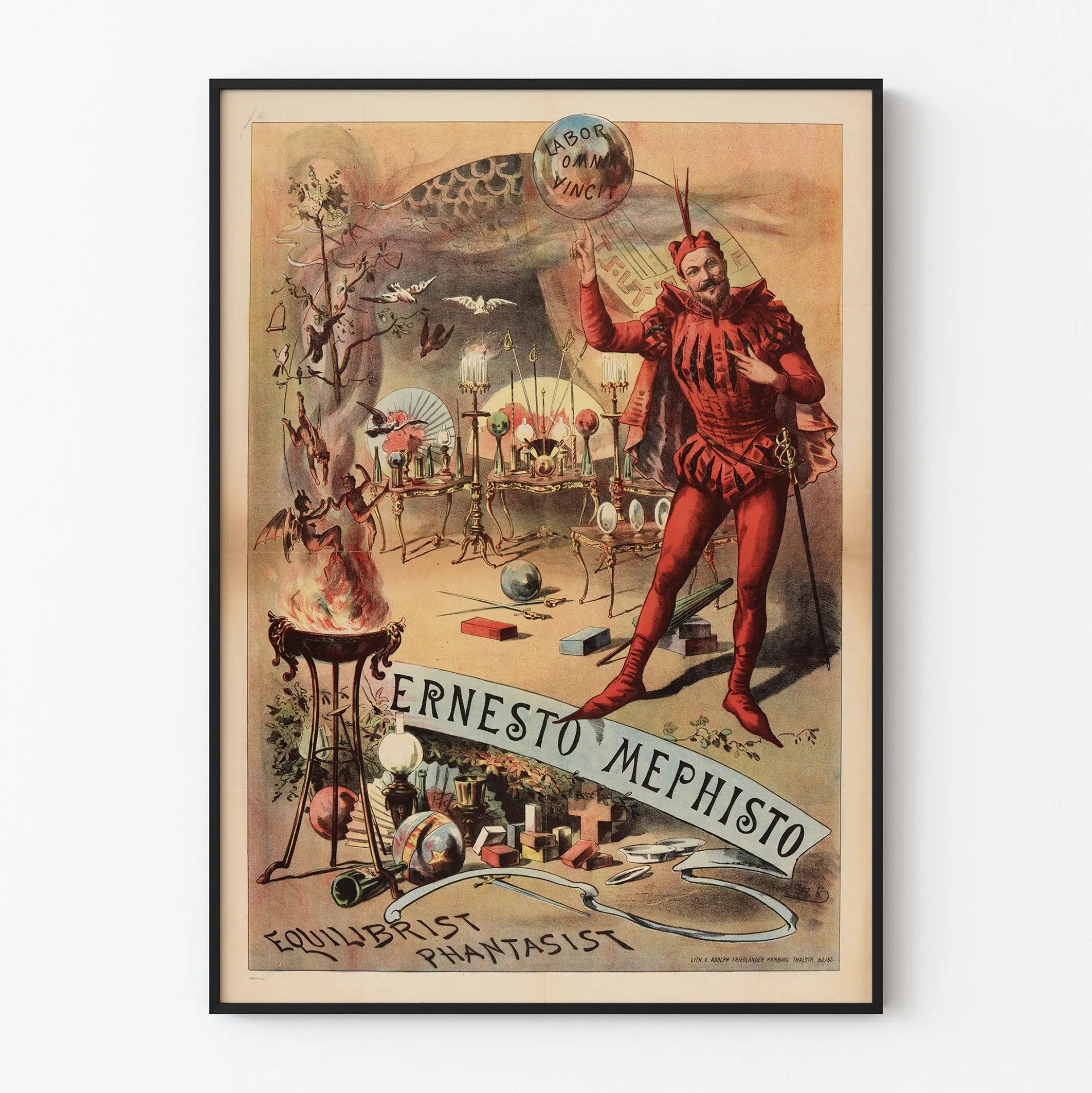 Scoprite questa locandina vintage raffigurante Ernesto Mephisto, acrobata e fantasioso, in una scena ricca di dettagli affascinanti e di un'atmosfera mistica. Questa decorazione murale unica combina l'arte dello spettacolo e l'immaginazione, con un personaggio vestito con un costume rosso vivace, stilizzato e teatrale, che cattura lo sguardo.