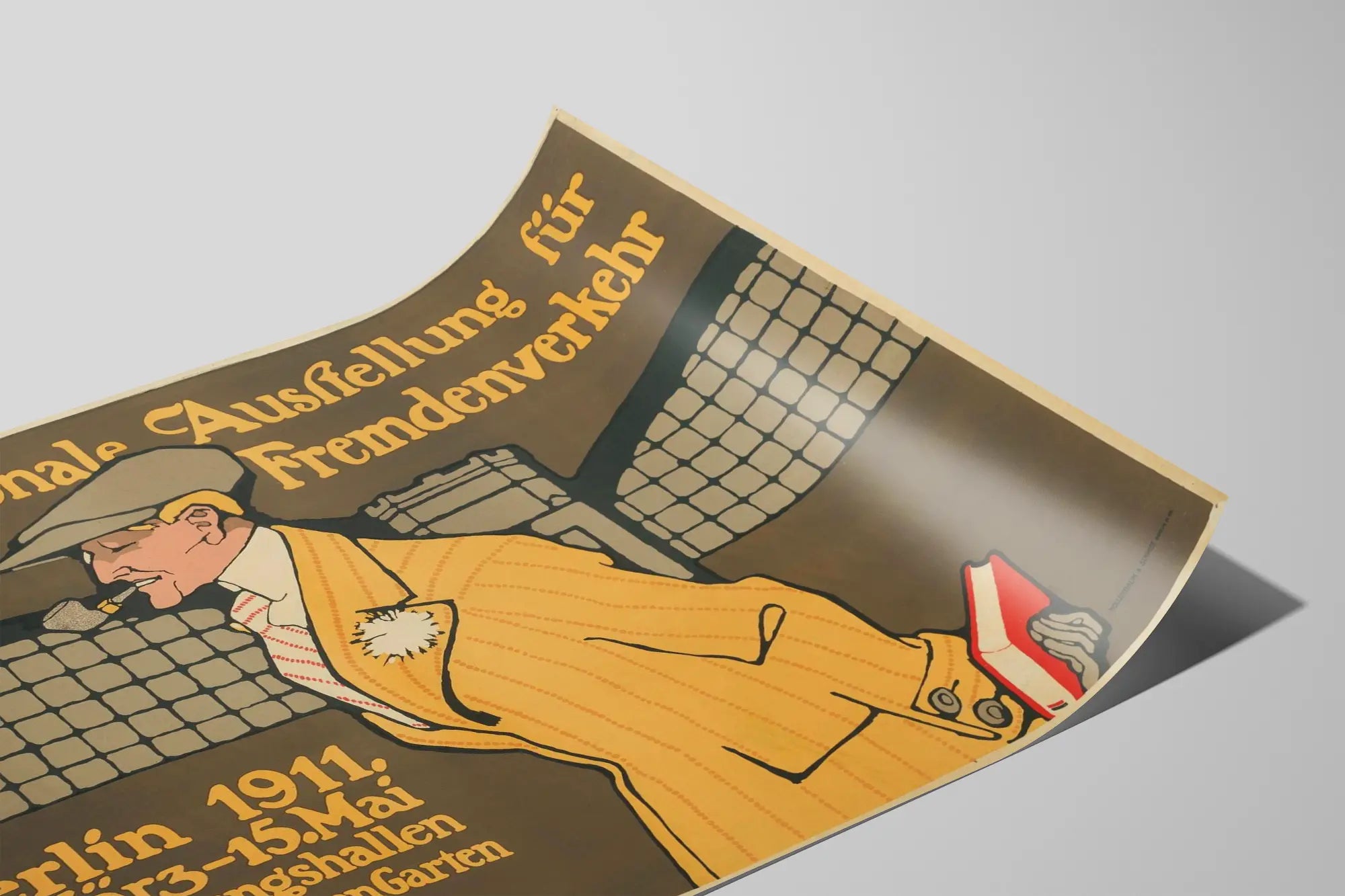 Cette affiche vintage annonce l'Internationale Ausstellung für Reise und Fremdenverkehr, une exposition internationale dédiée au voyage et au tourisme qui s'est tenue à Berlin en 1911, du 18 mars au 15 mai. Réalisée dans un style graphique typique du début du XXe siècle, elle met en scène un homme élégamment habillé, pipe à la bouche, portant un pardessus jaune à rayures, un chapeau et tenant un livre rouge derrière le dos. Le fond de l'affiche présente une architecture aux grandes fenêtres vitrées, évoquant les halls d'exposition situés au Zoologischen Garten, le célèbre jardin zoologique berlinois. L'utilisation de couleurs douces et d'un dessin épuré avec des contours nets accentue son style rétro et sa dimension décorative. Cette affiche est un excellent choix pour les amateurs de décoration murale à thème historique ou vintage, apportant à la fois une atmosphère culturelle et un caractère unique à n'importe quelle pièce. Elle s'intègre parfaitement en tant que poster ou tableau dans un intérieur au style éclectique ou classique, valorisant l'art du voyage d'antan. Extrêmement évocatrice, cette décoration murale est une invitation au rêve et à l'évasion, parfaite pour enrichir un espace de vie, un bureau ou une salle d'attente avec une touche d'élégance et de nostalgie.