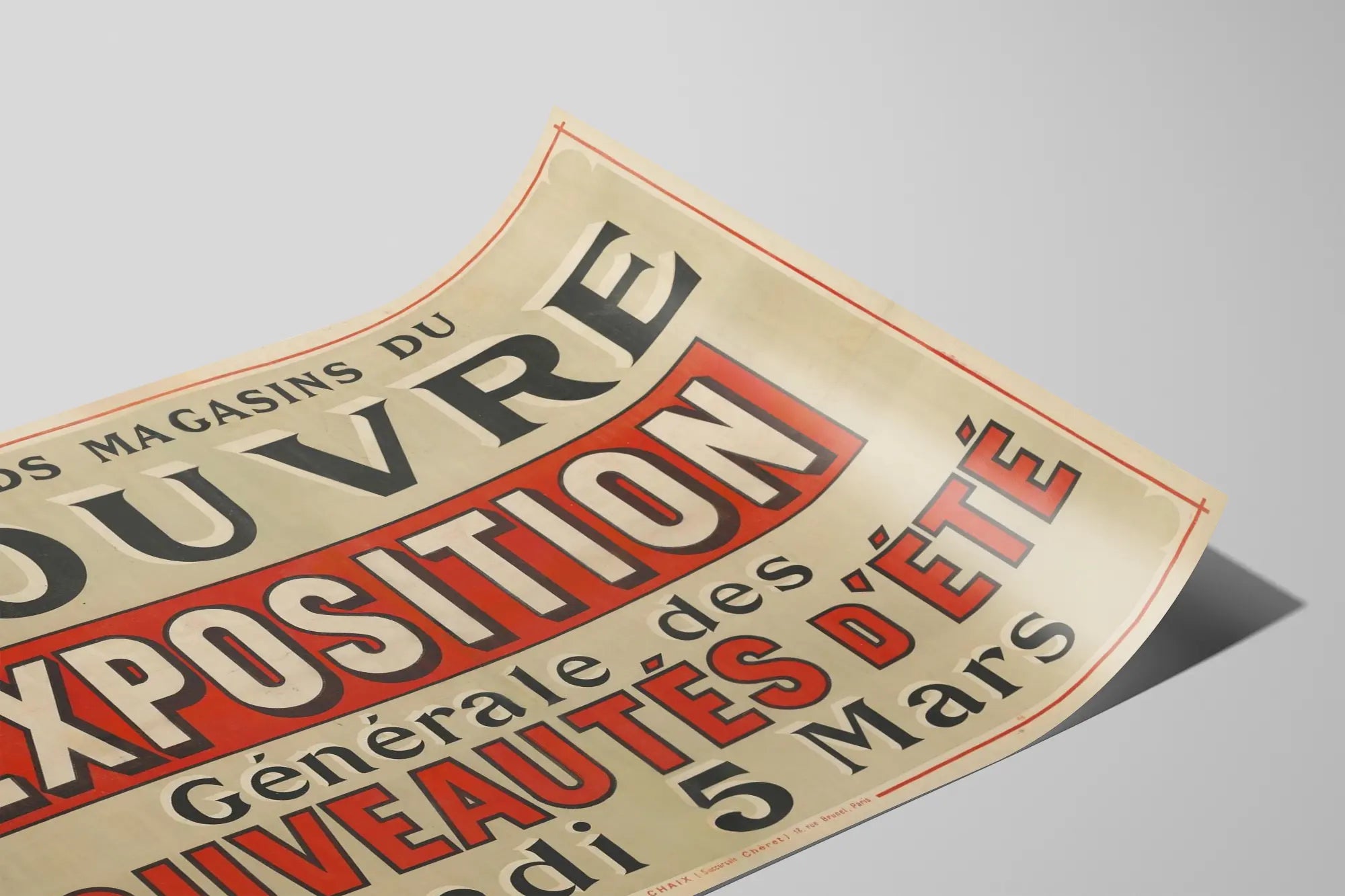 Cette affiche vintage emblématique annonce l'exposition générale des nouveautés d'été aux Grands Magasins du Louvre, un lieu iconique du commerce parisien. Avec un design typographique fort, cette décoration murale mêle lettres imposantes en noir et rouge, soulignant le caractère important et festif de l'événement. Le poster met en avant la date précise du lundi 5 mars, renforçant l'idée d'une campagne publicitaire ciblée pour une saison spécifique. La composition associe un fond beige, une bordure discrète rouge et un lion placé stratégiquement au-dessus du mot « Louvre », symbole de force et de prestige, conférant une touche d'élégance et d'histoire à cette affiche. Cette pièce de décoration murale est idéale pour les amateurs de design rétro et de publicité ancienne, apportant une ambiance vintage authentique à tout intérieur. En tant qu'affiche publicitaire ancienne, elle incarne un style graphique du début du XXe siècle avec un usage habile du jeu de couleurs pour attirer l'œil. Ce poster est parfait pour valoriser un espace avec une touche de patrimoine commercial parisien et d'art graphique. Que ce soit dans un salon, une boutique ou un bureau, cette affiche unique fera une décoration murale originale et chargée d'histoire.