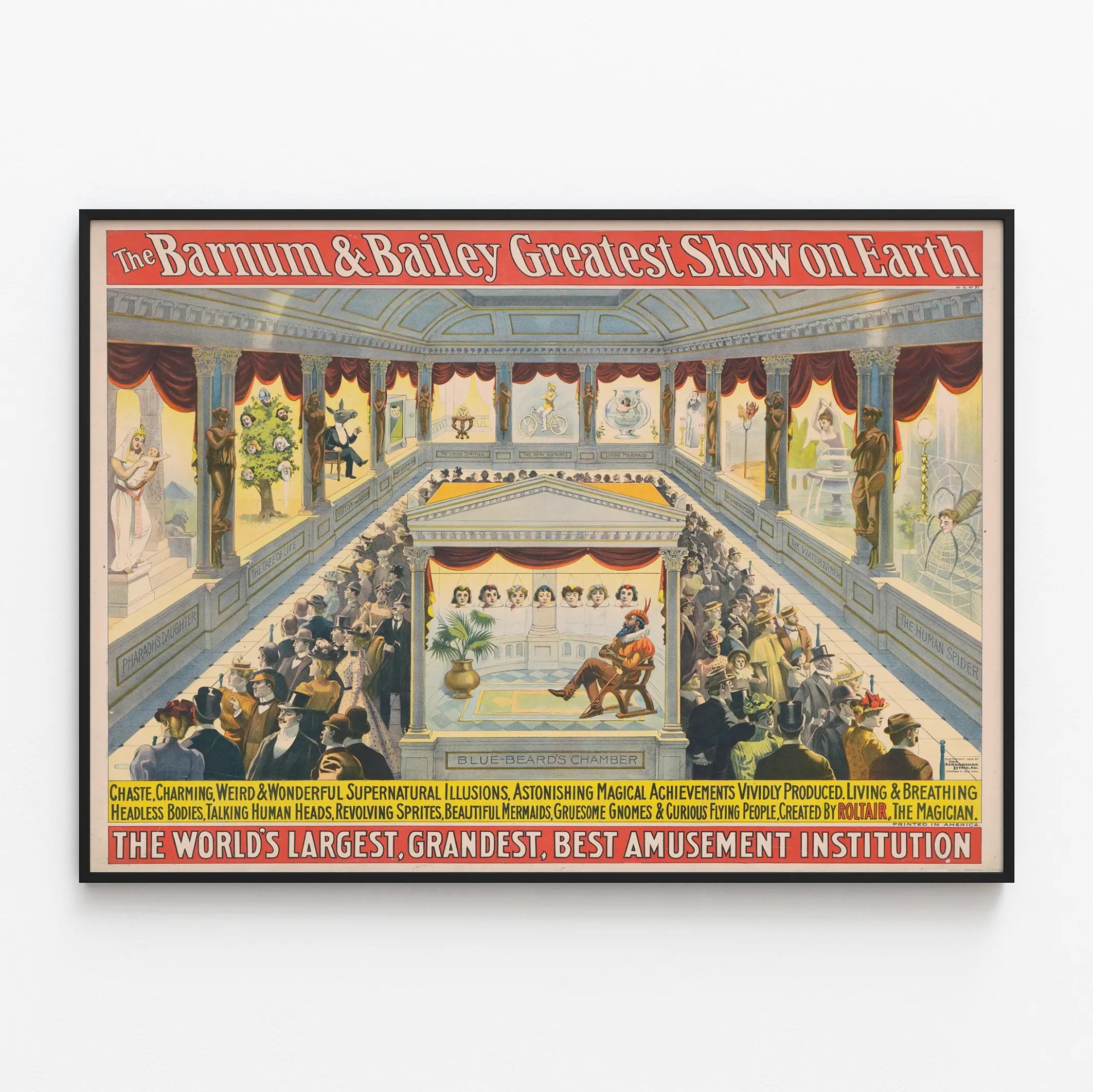 Découvrez cette affiche vintage unique, véritable œuvre de décoration murale inspirée du monde fascinant des illusions surnaturelles et des spectacles magiques. Représentant une scène de l'illustre Barnum & Bailey, célèbre pour être le plus grand et le meilleur spectacle d'amusement au monde, cette affiche met en avant les créations magiques de Roltair, magicien et maître des illusions. Ce poster est une belle pièce murale qui saisit l'attention grâce à son style ancien et ses couleurs douces, idéales pour une décoration murale vintage et originale. L'image met en scène une salle de spectacle décorée de moulures classiques et de colonnes ornées, entourée d'un public captivé. On y retrouve plusieurs vitrines où sont exposées différentes illusions et figures fantastiques, telles que la "Pharaoh's Daughter", "The Tree of Life", "The Living Sphinx", "The New Astarte", "Living Mermaid", "The Water Nymph" et "The Human Spider". Ces éléments sont parfaits pour sublimer un espace avec une touche d’émerveillement et un souci du détail raffiné. En son centre, "Blue-Beard's Chamber" occupe une place dominante, avec sa scène où un personnage trône sous un décor de têtes humaines et de plantes en pot, offrant un effet visuel attrayant pour une décoration murale thématique autour de l'histoire et de la magie. Le texte au bas de l'affiche souligne les talents de Roltair dans la création d'illusions captivantes : corps sans tête, têtes humaines parlantes, sprites tournoyantes, sirènes enchanteresses, gnomes inquiétants et personnages volants mystérieux. Ces thématiques ajoutent une atmosphère spectaculaire et intrigante, parfaite pour les amateurs d'art mural original et les passionnés de spectacles fantastiques. Ce poster décoratif est idéal pour apporter une touche d'histoire et de mystère à un intérieur, que ce soit dans un salon, une bibliothèque ou un espace créatif. Sa composition soignée, sa richesse narrative et ses couleurs harmonieuses en font un choix parfait pour enrichir votre décoration murale avec une œuvre authentique à fort impact visuel et esthétique.