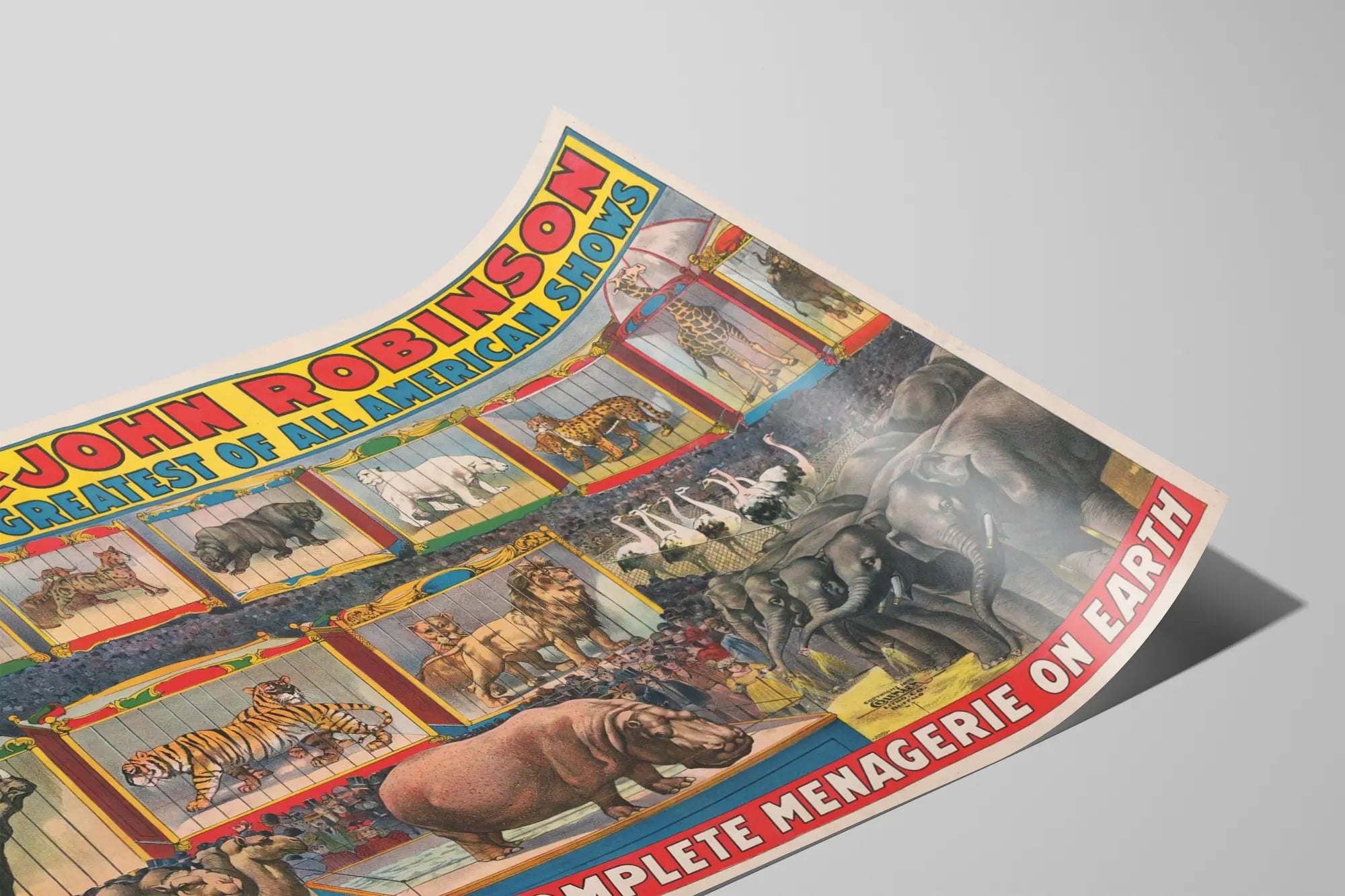Découvrez cette affiche vintage captivante représentant la célèbre ménagerie de John Robinson, réputée comme la plus grande et la plus complète au monde. Cette décoration murale unique met en scène une variété impressionnante d'animaux sauvages présentés dans des cages, faisant référence aux spectacles de cirque américains du XIXe siècle. Véritable pièce d'histoire, ce poster illustre des espèces comme l'hippopotame, l'éléphant, la girafe, le lion, le tigre, le rhinocéros, ainsi que plusieurs autres animaux exotiques tels que des léopards, des ours, des autruches et des chameaux. Sur l'affiche, vous pouvez également apercevoir trois portraits de la famille Robinson, pionniers des spectacles de cirque établis sur plusieurs générations, symbolisant la tradition et la grandeur de leurs shows. Idéale pour les amateurs d'affiches rétro et de décoration murale originale, cette affiche vintage apportera une touche d'authenticité et de charme à votre intérieur. Son style coloré et détaillé est parfait pour embellir une pièce à vivre, un bureau ou un espace dédié à la passion du cirque ou des animaux sauvages. Ce poster est une excellente idée déco murale pour ceux qui souhaitent mêler histoire, culture et exotisme dans leur aménagement. Son format horizontal met en valeur la diversité des espèces ainsi que l'ambiance spectaculaire des anciens spectacles de cirque. Ce tableau imprimé sur papier met en avant l'exubérance et la richesse d'une époque où les ménageries itinérantes fascinaient le public. Elle invite à un voyage visuel dans un passé emblématique aux animaux majestueux et aux grandes foules admiratives. Le graphisme soigné et l’utilisation de couleurs vives renforcent l’impact visuel de cette affiche, qui sera un élément décoratif central dans votre collection d'art mural.