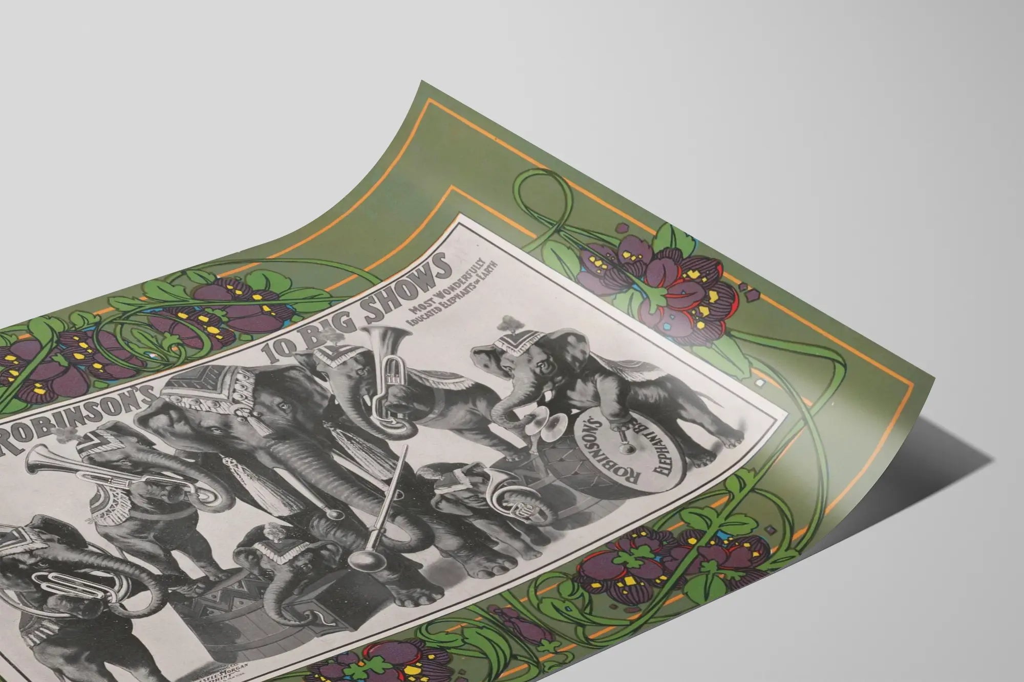 Cette affiche vintage illustre avec charme "John Robinson's 10 Big Shows" mettant en scène un groupe d'éléphants habillés et jouant d’instruments de musique, évoquant un spectacle unique d'éléphants éduqués. Cette décoration murale au style rétro et artistique imprime une ambiance nostalgique et ludique, parfaite pour une décoration intérieure originale. Le poster présente un cadre orné de motifs floraux aux couleurs discrètes et harmonieuses, soulignant le dessin central en noir et blanc où figurent plusieurs éléphants musiciens, illustrant un instant animé et fascinant. L'attention portée aux détails des instruments et des costumes, ainsi que la mise en page équilibrée, font de cette affiche un objet décoratif captivant qui attirera l'œil dans un salon, une chambre ou une salle de spectacle. Ce tableau mural est idéal pour les amateurs d'art vintage, de cirque ou de décoration thématique animalière, apportant une touche d'authenticité et de caractère à tout espace. Son style graphique unique combine illustration et typographie d'époque pour un rendu visuel impactant. Utiliser cette affiche comme objet décoratif mural permet d'ajouter une note artistique et historique à votre intérieur, tout en célébrant le folklore des spectacles animaliers d'autrefois. Le cadre végétal qui entoure la composition fait écho à la nature et à la tradition, renforçant le charme et la richesse visuelle de cette pièce décorative. Cette affiche est un choix parfait pour enrichir un mur avec une touche de poésie, de fantaisie et de mémoire culturelle, indispensable dans une collection d'affiches décoratives ou posters artistiques.