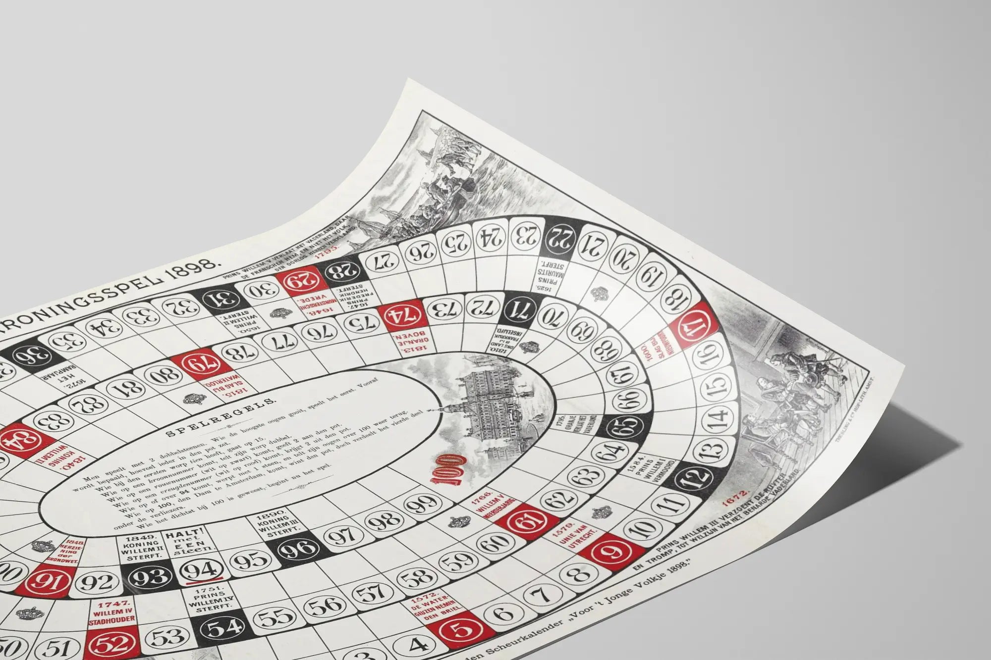 Cette affiche vintage intitulée "Kroningsspel 1898" est une décoration murale originale qui s'apparente à un plateau de jeu historique. Elle représente un jeu de parcours numéroté de 1 à 100, avec des cases en noir, blanc et rouge, où chacune est accompagnée de dates et de faits marquants de l'histoire des Pays-Bas. Ce poster met en lumière des événements et personnages clés, comme la reine Wilhelmina et le prince Willem, ainsi que différentes batailles et dates importantes remontant du XVIe au XIXe siècle. Ce tableau mural au style ancien en noir et blanc avec touches de rouge est idéal pour les amateurs d'histoire ou pour une ambiance vintage dans un intérieur. Le design est riche en détails, incluant des illustrations gravées en arrière-plan illustrant des scènes historiques et des personnages en costumes d'époque. Au centre, un encart expose les règles du jeu, ajoutant un aspect ludique et éducatif à ce poster décoratif. Ce poster historique est parfait pour une décoration murale dans un bureau, une bibliothèque ou une salle de jeux, apportant une touche originale et didactique à votre espace. Il s’agit d’une pièce unique qui combine esthétique ancienne et intérêt historique, faisant de cette affiche un objet décoratif captivant et distinctif.