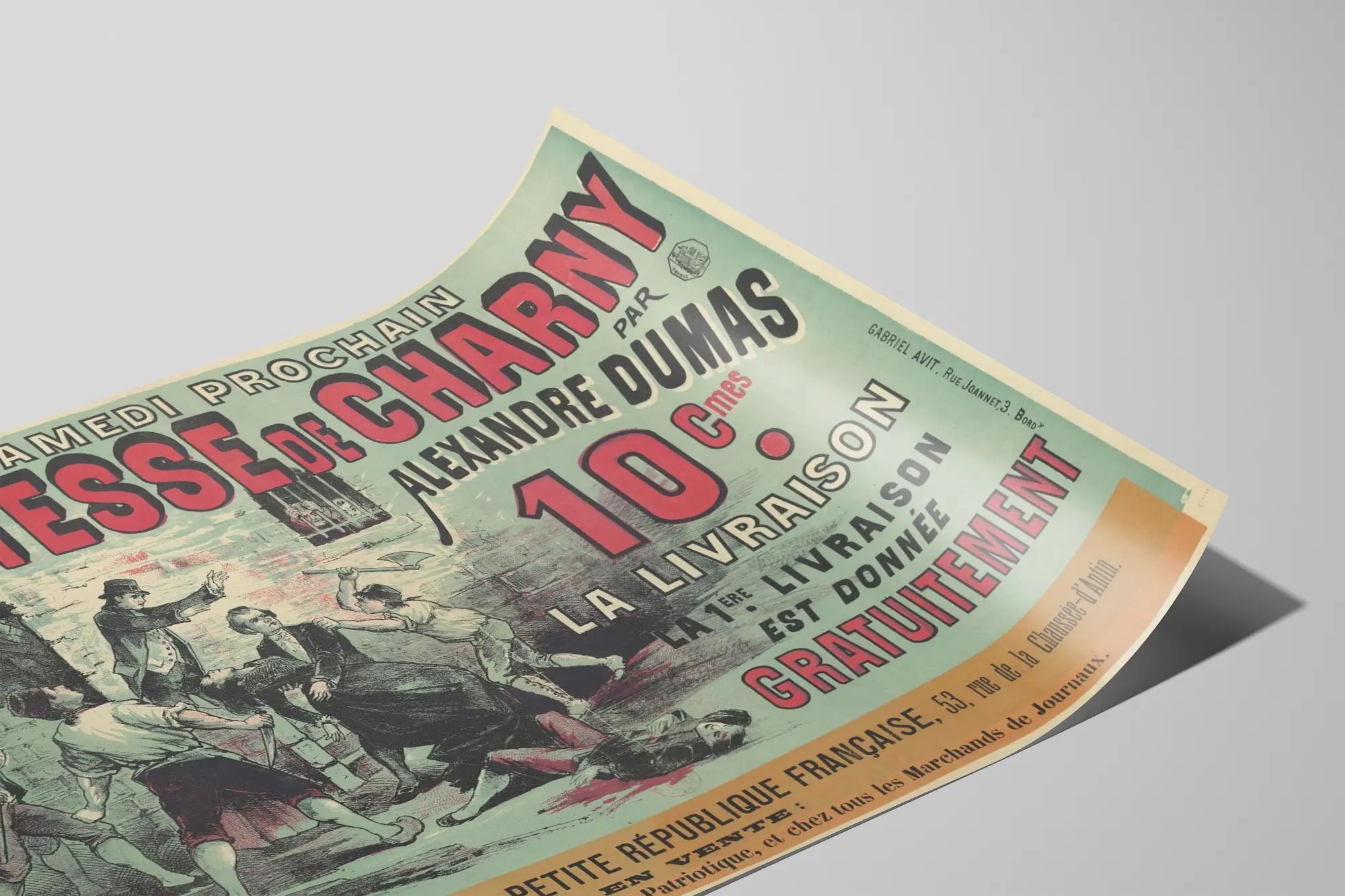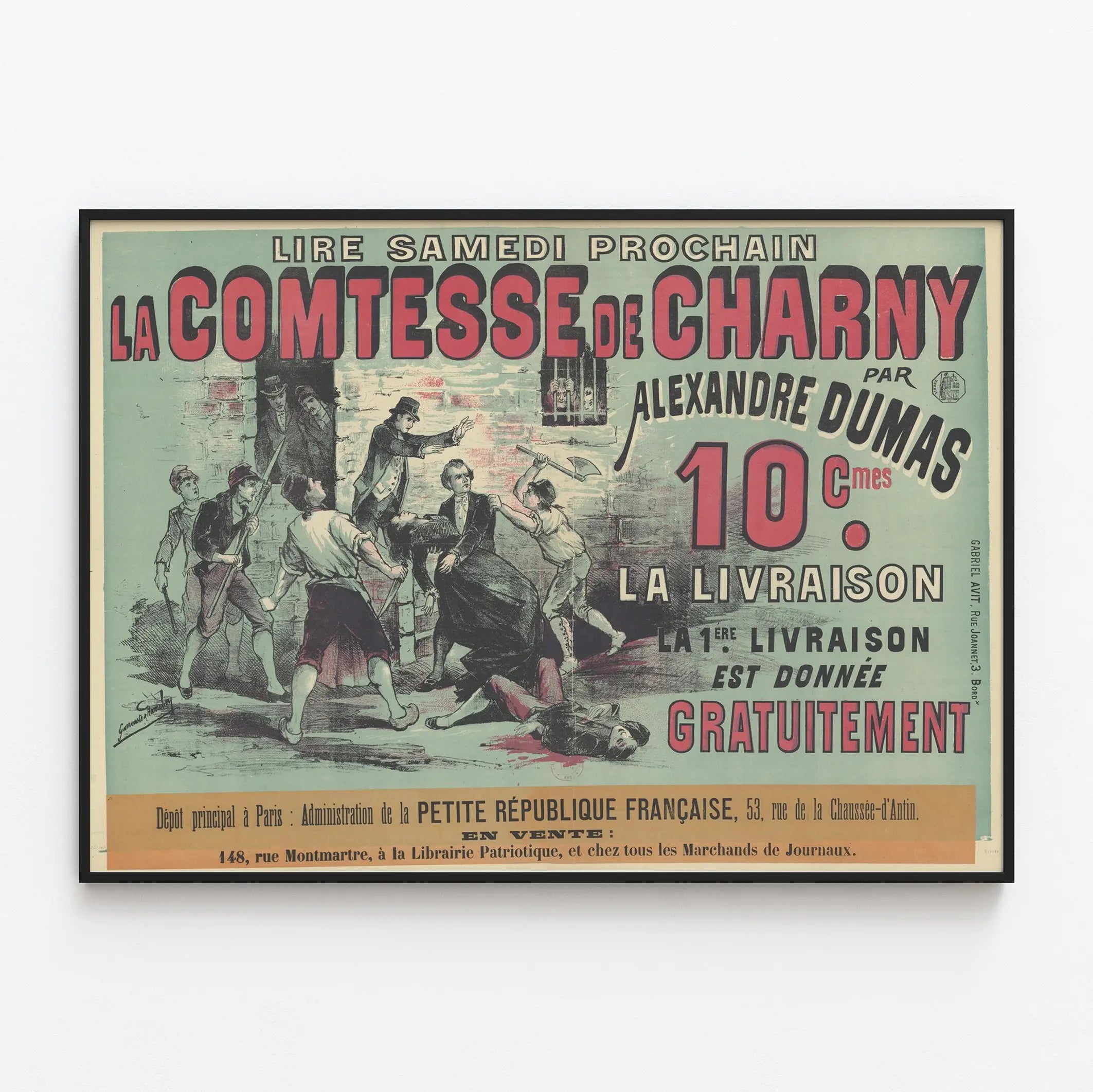 Cette affiche vintage annonce la sortie prochaine du roman "La Comtesse de Charny" d'Alexandre Dumas. Un poster emblématique qui évoque le style graphique ancien, où le titre est mis en avant avec des lettres rouges et noires accrocheuses sur un fond clair, apportant une touche rétro à votre décoration murale. L'illustration au centre montre une scène dramatique et animée, présentant un groupe de personnages en pleine confrontation autour d'un homme en costume, soulignant l'intensité du récit. Ce tableau imprime une atmosphère historique et littéraire, idéale pour les amateurs de littérature classique et de design vintage. Cette affiche de lecture littéraire évoque également une ambiance typique des petites républiques françaises, avec un texte promotionnel qui annonce la gratuité de la première livraison du roman, soulignant son aspect ancien et authentique. Un élément décoratif parfait pour personnaliser un espace de lecture, un bureau ou un salon, apportant une touche d'histoire et de culture directement sur vos murs. L'ensemble du visuel utilise des couleurs contrastées qui captent le regard tout en restant harmonieuses, ce qui en fait une décoration murale attrayante et historique. Optez pour ce poster unique afin de sublimer votre intérieur avec une pièce de décoration murale qui raconte une histoire et rend hommage à la plume d'Alexandre Dumas.
