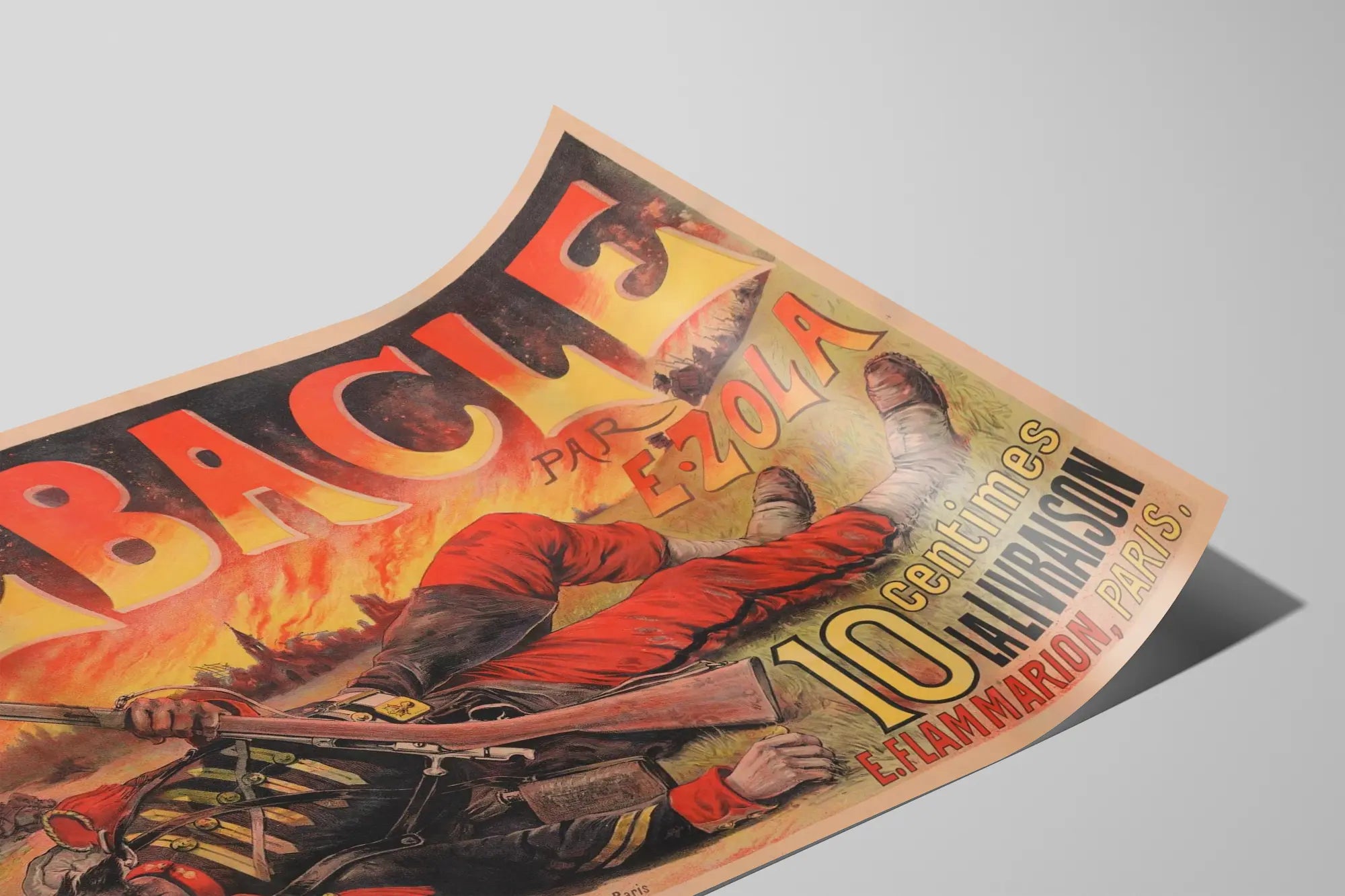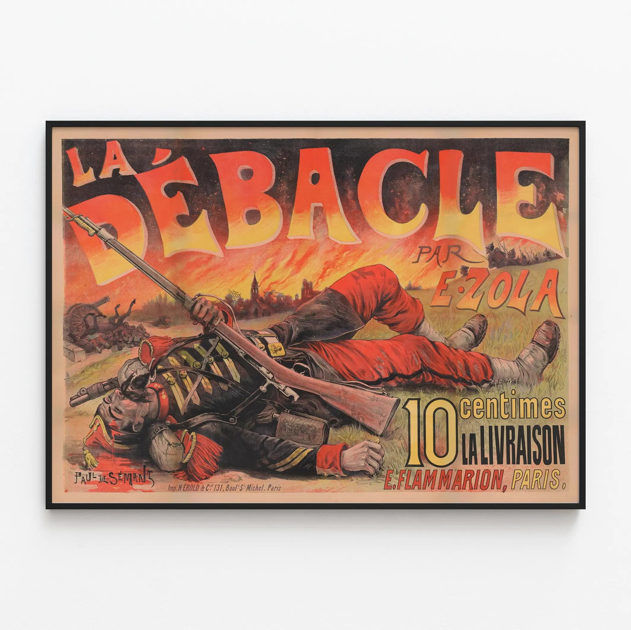 Cette affiche vintage illustrée par Paul de Sémantis offre une représentation saisissante du roman historique "La Débâcle" d'Émile Zola. Conçue dans un style classique et dramatique, cette décoration murale met en scène un soldat étendu au sol, vêtue d'un uniforme militaire détaillé avec un fusil à la main, évoquant la violence et la désolation de la guerre. Le fond en feu symbolise la destruction, renforçant l'intensité dramatique de l'image. Cette affiche est un excellent choix pour les amateurs de littérature et d'histoire souhaitant enrichir leur intérieur avec une pièce à la fois artistique et évocatrice. Parfaite en tant que poster ou décoration murale, elle s'intègre facilement dans un salon, un bureau ou une bibliothèque, ajoutant une touche d'élégance vintage et un point de conversation intéressant. La typographie large et colorée du titre "LA DÉBÂCLE" capte immédiatement l'attention, tandis que l'ensemble des éléments graphiques reflète le contexte historique et littéraire du XIXe siècle. Cette œuvre imprimée en France par H. Érold & Cie, avec la mention d'édition E. Flammarion Paris, confirme son authenticité et son lien direct avec le milieu éditorial français. Son style artistique, combiné à son fort impact visuel, fait de cette affiche un choix remarquable pour une décoration murale originale qui allie art, histoire et littérature.
