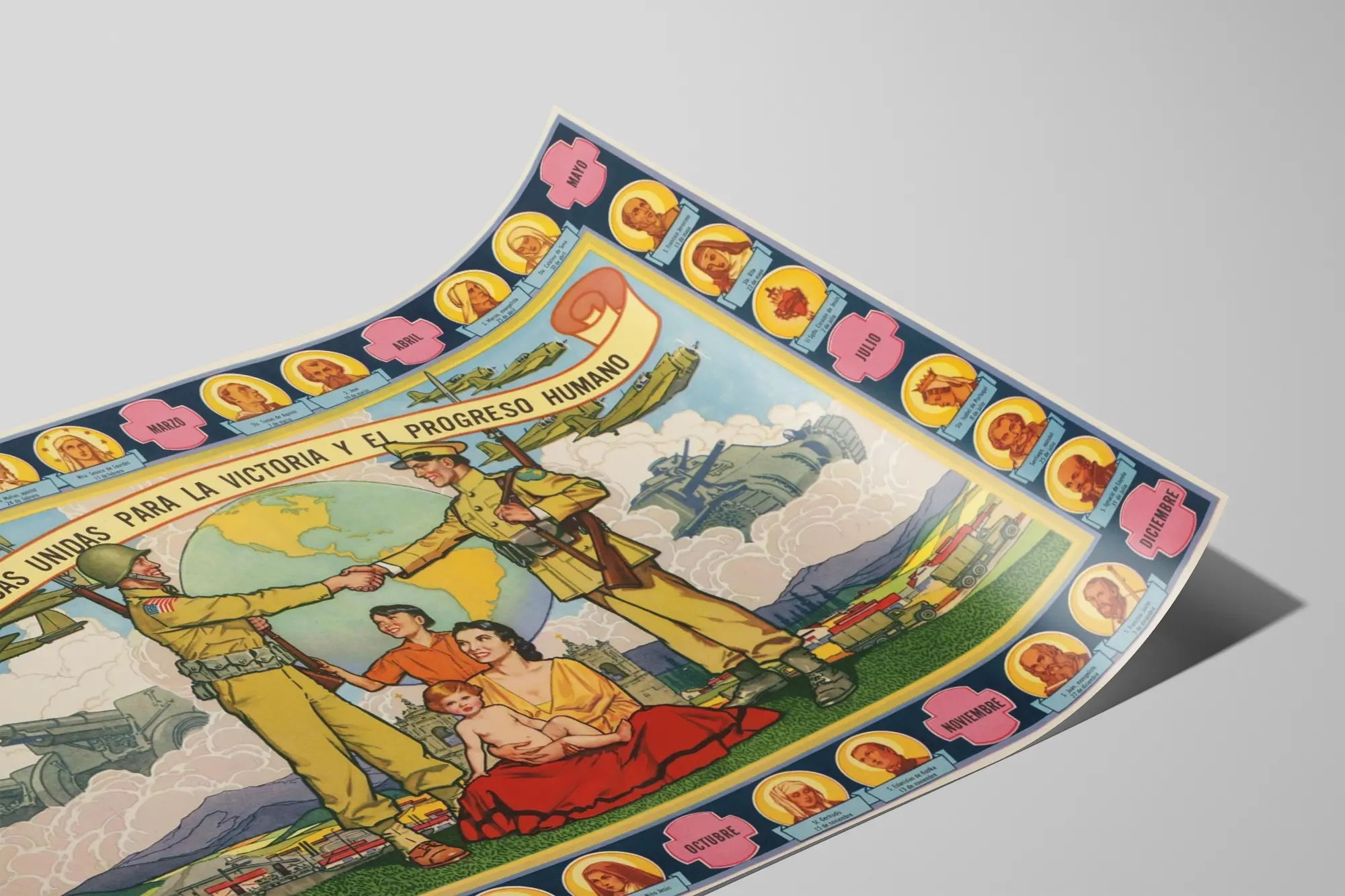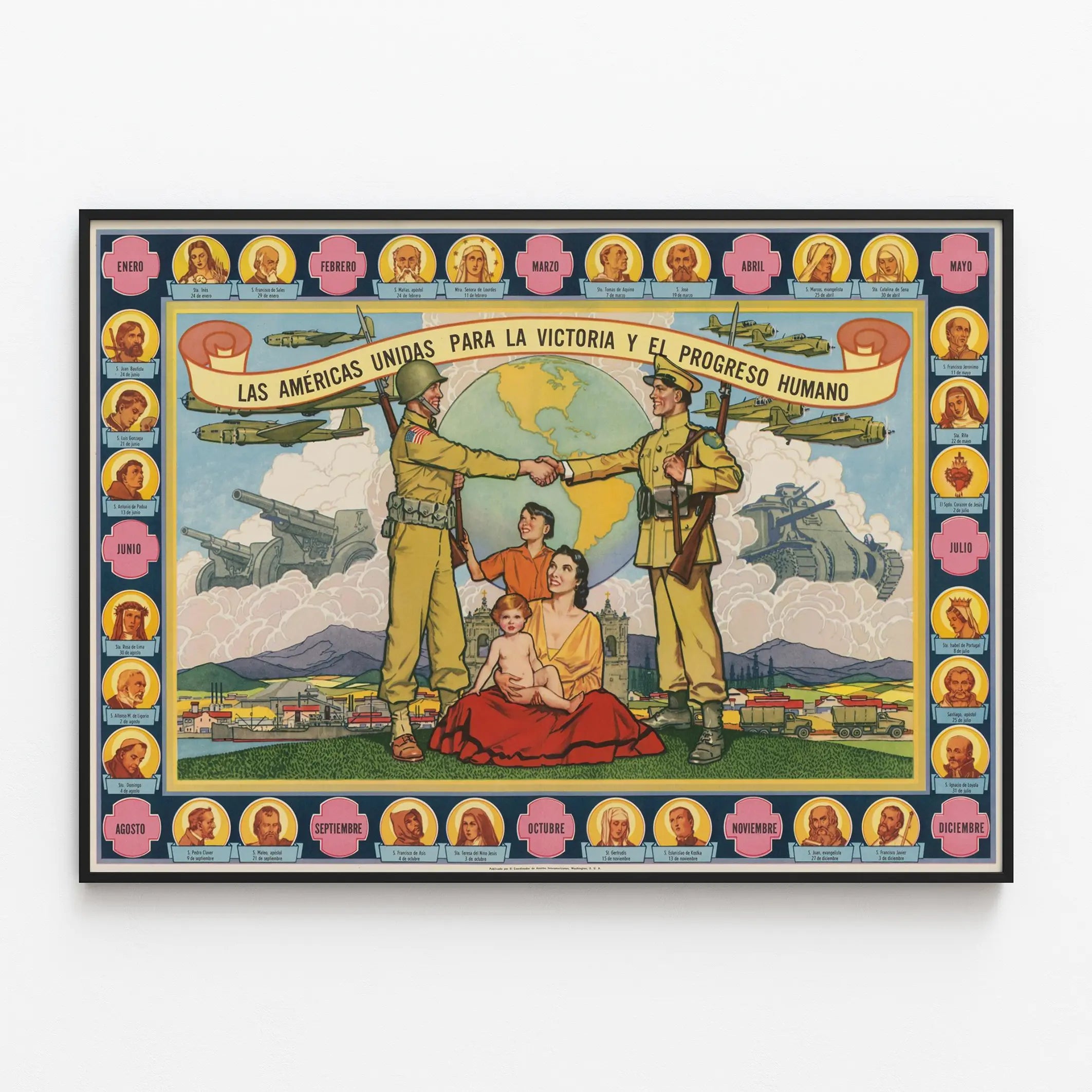 Cette affiche vintage intitulée « Las Américas Unidas para la Victoria y el Progreso Humano » est une décoration murale chargée d'histoire et de symbolisme. Elle met en scène deux soldats en tenue, se serrant la main devant une grande représentation du continent américain, mettant en lumière l'unité des Amériques dans un contexte de victoire et de progrès humain. La scène centrale inclut également une femme assise avec deux enfants, symbolisant peut-être l'espoir et la paix pour les générations futures. Le ciel est animé par plusieurs avions militaires, tandis qu'en arrière-plan, on aperçoit des infrastructures industrielles et des véhicules militaires, des chars et des canons, évoquant à la fois l'effort de guerre et le développement industriel. Le cadre de cette affiche est décoré par un calendrier composé des mois de l'année, associant chaque mois à une figure religieuse ou spirituelle, représentée en médaillons avec leur nom et date. Cela ajoute un élément culturel et religieux à l'ensemble, renforçant le message d'union et de protection divine. Cette décoration murale est idéale pour les amateurs d'histoire, notamment ceux intéressés par les affiches de propagande ou les documents visuels des périodes de conflits mondiaux. Ce poster au style graphique marqué et coloré apportera une touche rétro et unique à votre intérieur, qu’il soit exposé dans un salon, un bureau ou une salle d’exposition. C’est un tableau mural visuel fort qui offre une présence décorative originale, combinant des éléments militaires, familiaux et religieux. Cet affichage peut aussi convenir à une collection thématique dédiée aux Amériques et à leur histoire commune. Son style graphique soigné et ses couleurs chaudes captivent le regard et racontent une histoire de solidarité et d’espoir à travers un poster décoratif engageant. Un choix parfait pour enrichir vos murs avec une pièce décorative pleine de caractère et de sens.