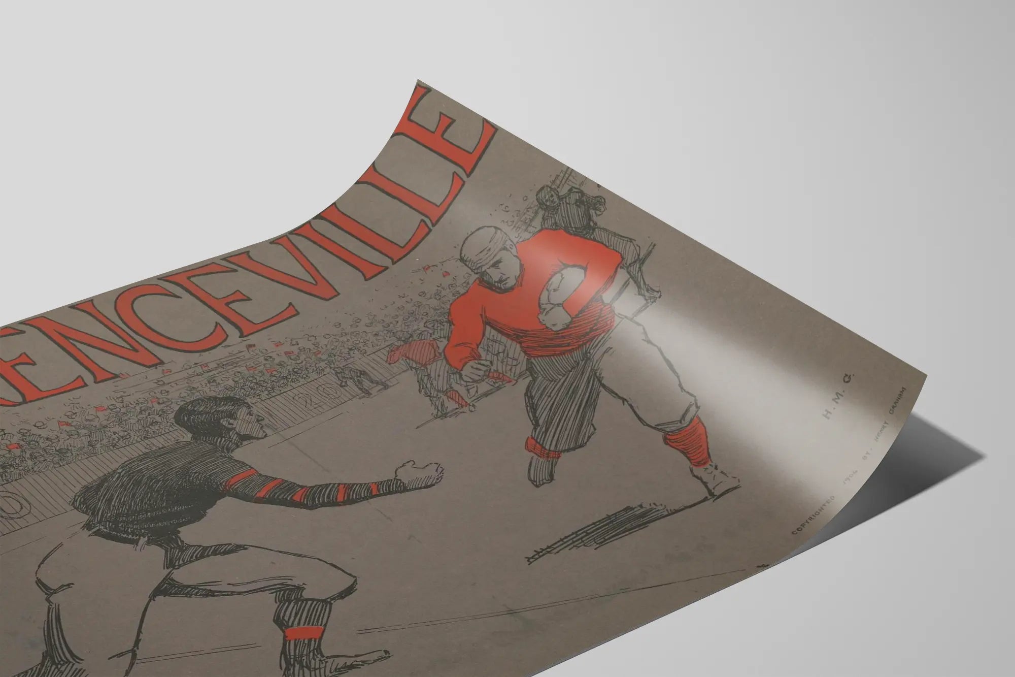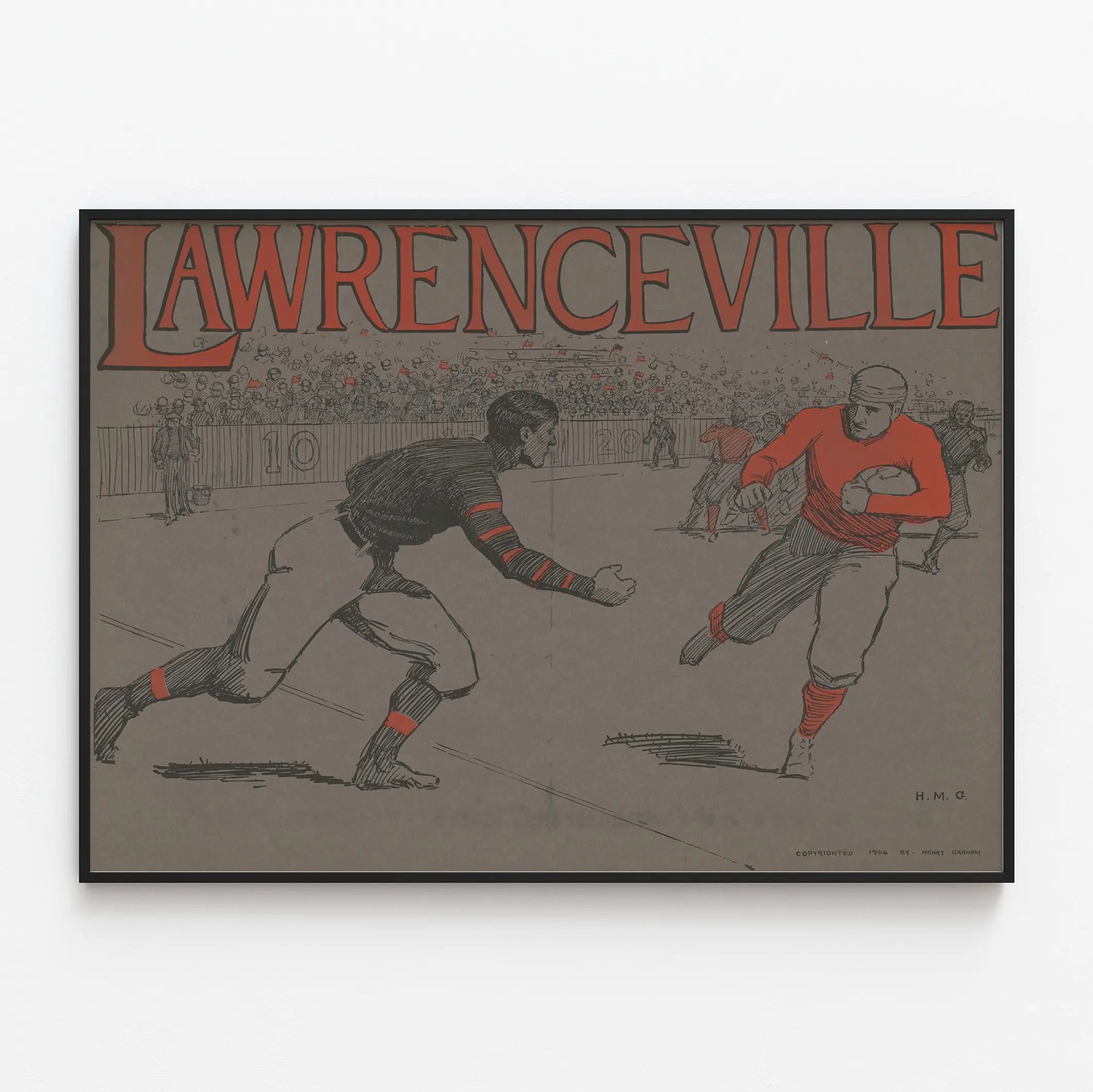 Cette affiche vintage intitulée "Lawrenceville" illustre une scène dynamique de football américain datant de 1906, offrant une décoration murale historique et sportive. Signée H.M.G. (Henry Graham), cette œuvre en noir et rouge met en avant un joueur portant un maillot rouge et un casque à l'ancienne, courant avec le ballon, tandis qu'un adversaire, en maillot rayé noir et rouge, tente de l'arrêter. Le style graphique, à la fois simple et expressif, capture parfaitement l'intensité et l'énergie du jeu à une époque où le football américain était en plein développement. Les couleurs limitées à des teintes noires, rouges et à un fond gris apportent une identité visuelle forte, idéale pour un affichage décoratif dans un intérieur contemporain ou rétro. L'arrière-plan esquisse une foule enthousiaste et des éléments de terrain, apportant du contexte à la scène sans surcharger la composition. Ce poster s'adresse particulièrement aux amateurs de décoration murale sportive, aux passionnés d'histoire du sport, ainsi qu'à ceux qui recherchent une ambiance vintage et équilibrée dans leur espace de vie ou leur bureau. Sa simplicité graphique et son caractère intemporel permettent une intégration harmonieuse dans divers styles de décoration, du loft industriel aux appartements au charme ancien. En choisissant ce tableau comme élément décoratif, vous ajoutez une touche d'authenticité et de nostalgie liées à l'histoire du football américain, un sport emblématique. Ce poster est également un parfait complément pour des collections thématiques ou pour personnaliser un coin sportif. La mise en valeur des mouvements des joueurs combinée à un design épuré fera de cette affiche un véritable point focal sur votre mur, sublimant tout espace avec une note sportive et artistique à la fois.