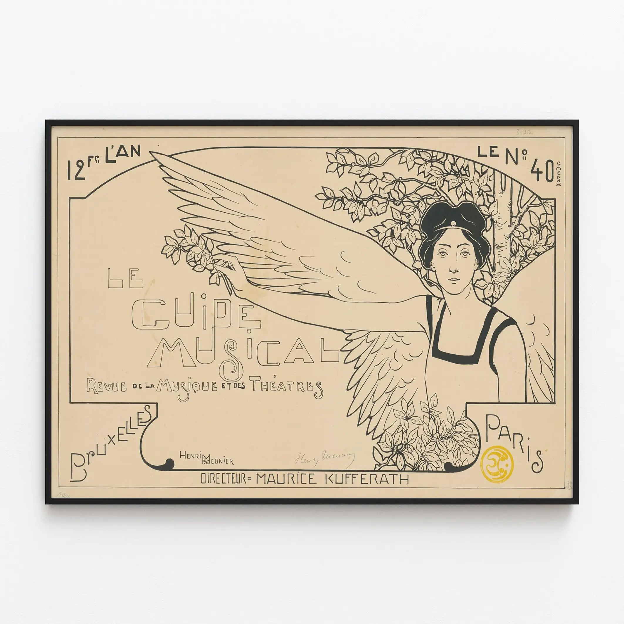 Découvrez cette affiche vintage intitulée "Le Guide Musical – Revue de la musique et des théâtres", une pièce de décoration murale unique qui ravira les passionnés de musique et de théâtre. Ce poster monochrome met en scène un personnage ailé entouré de feuillages, symbole d'élégance et de légèreté, qui s'étend sur un fond clair avec des lignes épurées et un graphisme typiquement art nouveau. La composition équilibrée et les détails soignés apportent un cachet authentique à cette œuvre, idéale pour embellir un intérieur moderne ou classique. Cette affiche est une représentation parfaite du style graphique et artistique des revues musicales et théâtrales du début du 20e siècle. Elle porte une typographie originale et stylisée, avec des lettres dessinées qui accentuent le caractère artistique et culturel de la pièce. Mentionnée comme appartenant au 12e année et portant le numéro 40, elle reflète l'importance culturelle qu'avait "Le Guide Musical" dans les milieux artistiques de Bruxelles et Paris. En décorant vos murs avec ce poster, vous apporterez une touche d'histoire et d'authenticité à votre espace. Que ce soit dans un salon, un bureau ou une salle de musique, cette décoration murale évoque l'ambiance des théâtres et des concert halls d'antan. Son dessin épuré, où le personnage aux grandes ailes semble en mouvement, crée une sensation de liberté et d'élan artistique, invitant à la contemplation et à l'inspiration musicale. Cette affiche est particulièrement adaptée à ceux qui cherchent un objet déco artistique et culturel, mêlant histoire, musique et théâtre. Sa tonalité sobre et ses lignes noires sur fond beige en font une pièce facile à assortir avec divers styles de décoration intérieure, des plus classiques aux plus contemporains. Offrez à votre espace une authenticité artistique raffinée avec cette décoration murale vintage issue d'une revue musicale emblématique. Elle est un choix parfait pour les amateurs de décoration murale qui souhaitent marier élégance graphique et passion pour les arts du spectacle.