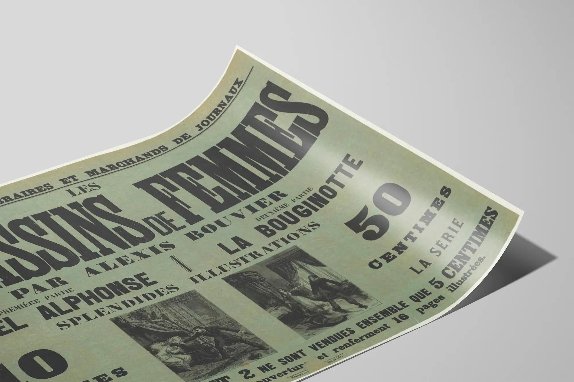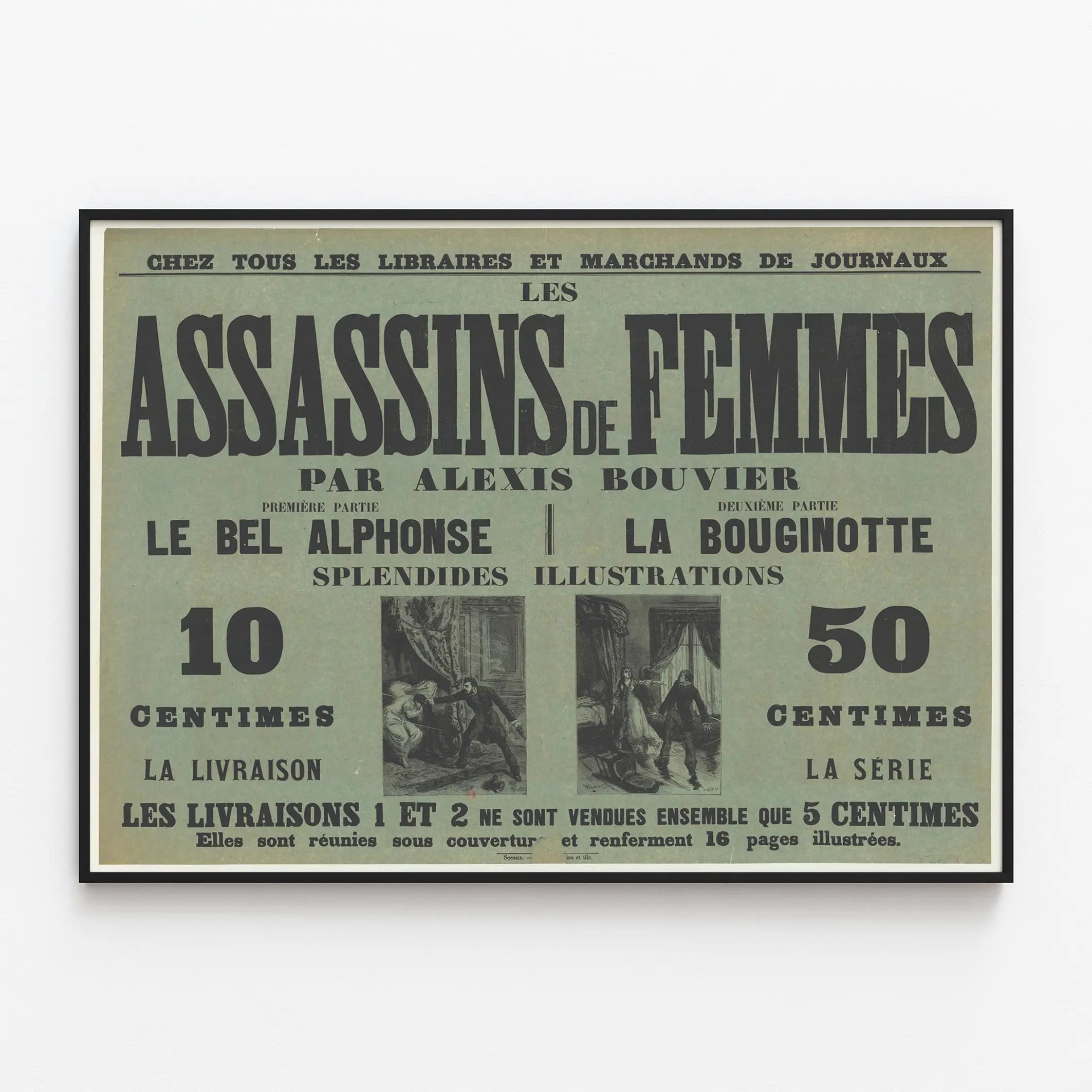 Cette affiche vintage intitulée "Les Assassins de Femmes" par Alexis Bouvier est une pièce intrigante qui séduira les amateurs de décoration murale au style rétro et historique. Présentée sous forme de poster imprimé, cette décoration murale attire le regard par sa typographie imposante et son design typique des publications anciennes. Idéale pour habiller un mur avec caractère, cette affiche représente une époque révolue de la littérature populaire et illustre un univers sombre et mystérieux. L'affiche est organisée en deux parties distinctes : "Le Bel Alphonse" et "La Bouginotte", chacune accompagnée de splendides illustrations. Ces dernières apportent un charme supplémentaire, mettant en scène des scènes dramatiques qui renforcent l'aspect narratif et captivant de cette décoration murale. Avec ses grandes lettres noires sur fond bleu-vert, ce poster est conçu pour capter l'attention tout en s'intégrant facilement dans une pièce au décor classique ou vintage. En tant que pièce de décoration murale, cette affiche s'adresse particulièrement à ceux qui apprécient les affiches anciennes et les esthétiques graphiques du XIXe siècle. Elle peut être intégrée dans un salon, une bibliothèque ou un bureau, ajoutant une touche d'authenticité et d'histoire à l'espace. Ce poster rétro se distingue par son style typographique fort, son format généreux et ses illustrations évocatrices, parfait pour un effet déco saisissant. Enfin, cette affiche constitue une pièce originale pour collectionneurs ou passionnés de graphisme ancien. Elle évoque un univers littéraire intense et mystérieux, tout en apportant une décoration murale pleine de charme et de profondeur. Une idée parfaite pour enrichir un intérieur avec une ambiance vintage et un goût marqué pour le patrimoine imprimé.