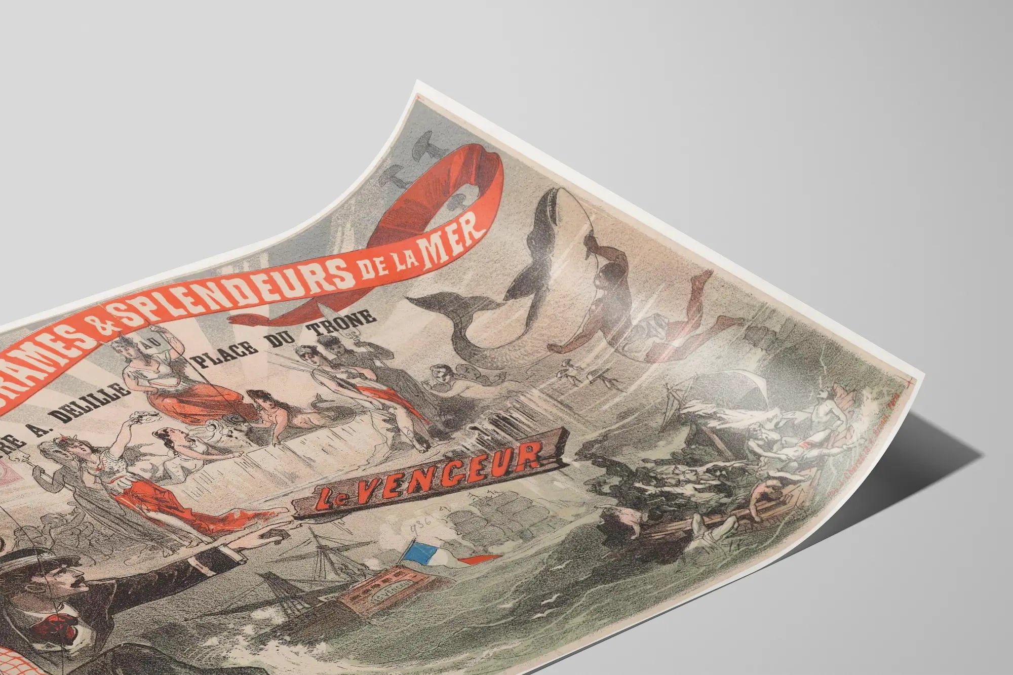 Découvrez cette affiche vintage captivante intitulée « Les Drames et Splendeurs de la Mer » qui évoque un spectacle théâtral au Théâtre A. Delille, Place du Trône. Cette décoration murale présente une scène maritime dramatique et mythologique, mêlant éléments humains et fantastiques. L'illustration met en avant un univers océanique intemporel, riche en émotions et en mouvements, avec des personnages en costumes éclatants, des sirènes, une baleine impressionnante, ainsi qu'un navire portant le nom « Le Vengeur ». Ce poster original se distingue par son style graphique ancien et ses teintes chaudes dominées par le rouge et le noir, conférant à la pièce une ambiance dramatique et énergique. Idéal pour agrémenter une décoration murale dans un intérieur contemporain ou vintage, ce tableau imprimé offre une touche d'histoire et de mystère qui séduira les passionnés d'art graphique et les amateurs de thèmes marins. Sa composition détaillée et son dynamisme font de cette affiche un élément décoratif unique pour un salon, un bureau ou une salle de théâtre, apportant une atmosphère pleine de récits et d'aventures maritimes. Cette œuvre isole parfaitement les contrastes entre le calme et les tempêtes, entre la légende et la réalité, donnant à votre décoration d'intérieur une élégance narrative qui ne passe pas inaperçue.