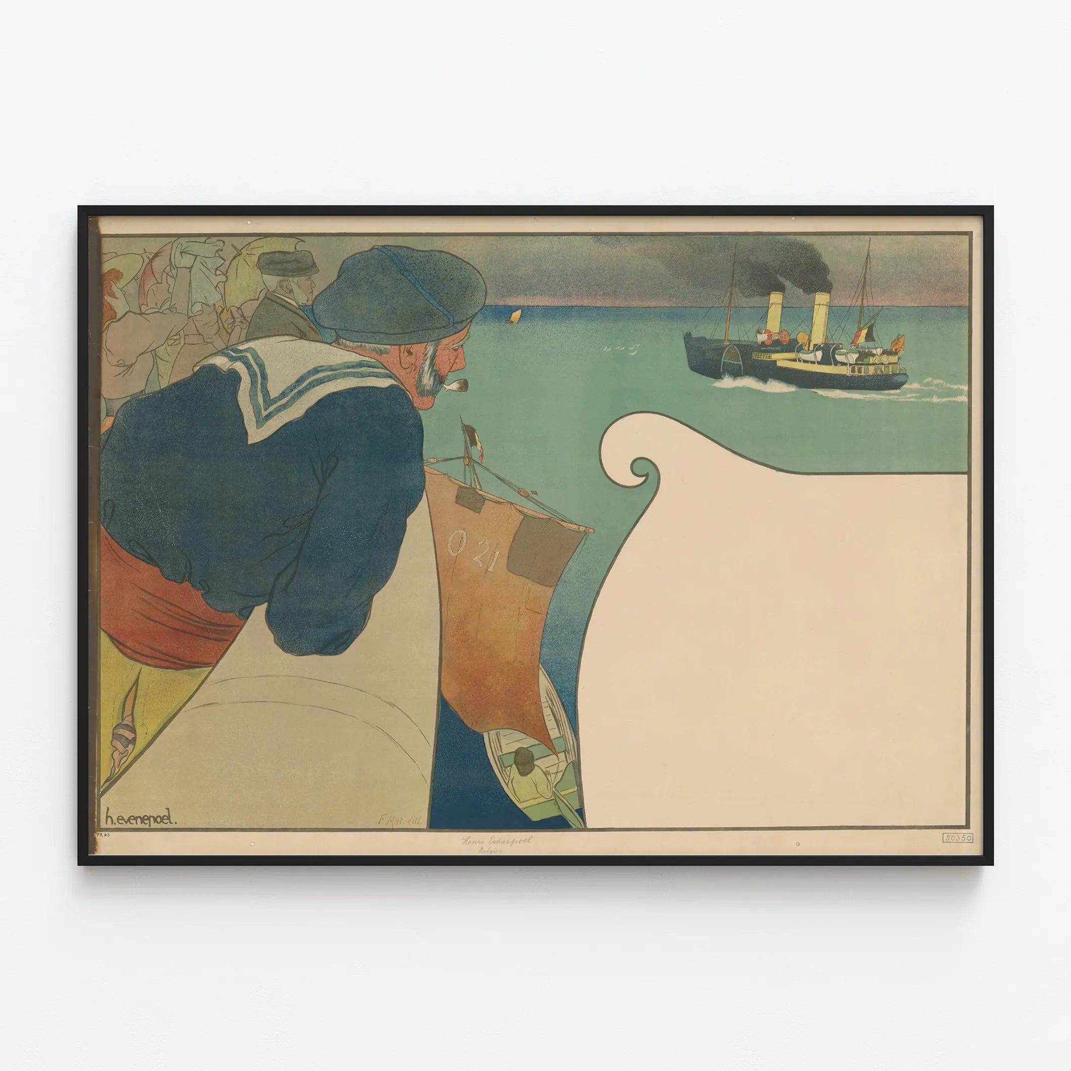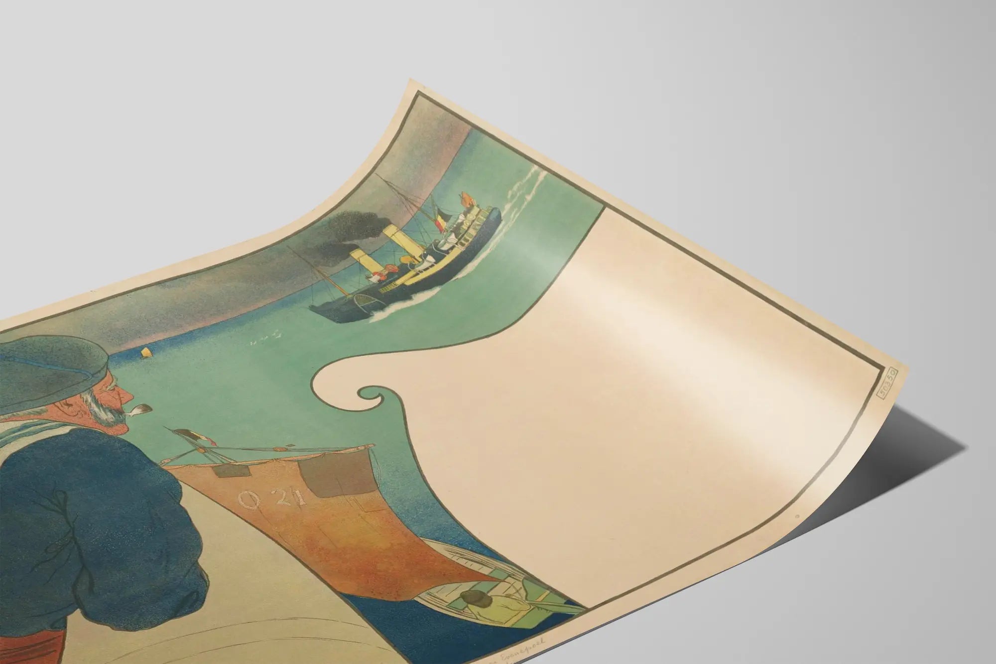 Cette affiche vintage représente une scène maritime illustrant la liaison postale entre Ostende et Dover. Son style graphique évoque une époque révolue et offre un aperçu unique de la vie maritime à travers une décoration murale authentique. On y distingue un marin en premier plan, vêtu d'un pull marin et d'un béret, regardant vers la mer où un vieux navire à vapeur fume ses cheminées. L’ensemble est traité dans des teintes douces et naturelles, avec une composition équilibrée entre les personnages au bord du quai et l’océan calme. Ce poster est idéal pour apporter une touche rétro et maritime à votre intérieur, que ce soit dans un salon, une chambre ou un bureau. Il conviendra parfaitement aux amateurs de décoration murale autour du thème nautique, du voyage ou des affiches anciennes. Sa large zone vide à droite pourrait aussi permettre d’ajouter du texte ou une inscription personnalisée, en faisant une pièce de choix pour une exposition ou une collection. La finesse du trait et la palette subtile de couleurs utilisées valorisent cet objet décoratif et témoignent du style graphique historique lié aux affiches de communication maritime. Ce tableau mural s’adresse aux passionnés d’histoire navale et de design graphique vintage, cherchant à décorer leur intérieur avec une pièce originale et chargée de sens. En matière de décoration, cette affiche représente un équilibre parfait entre esthétisme et authenticité, permettant ainsi d’insuffler un air marin et nostalgique dans tout espace de vie.