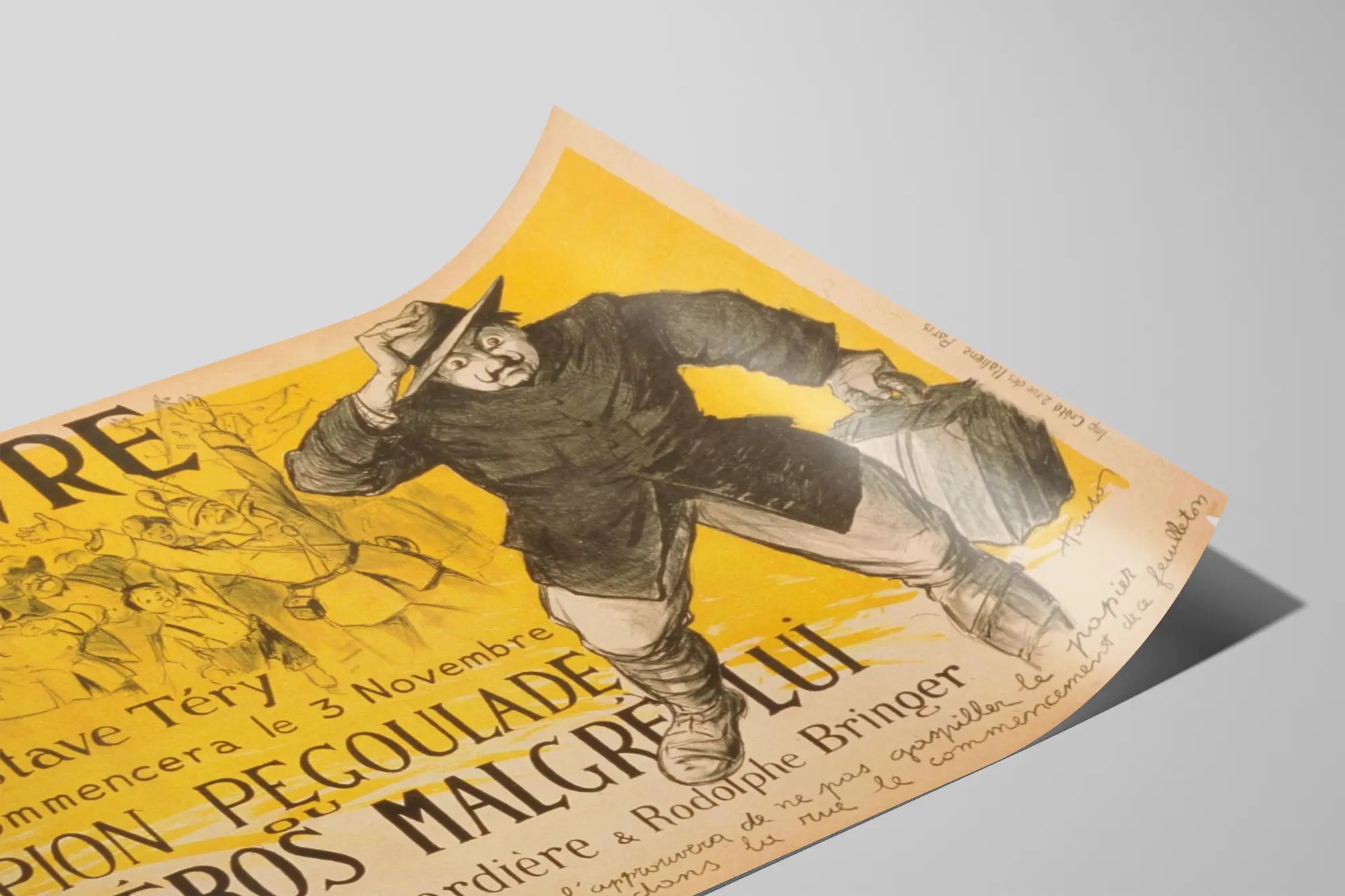 Cette affiche vintage originale présente une publicité pour "L'Œuvre" de Gustave Téry, annonçant le début d'une œuvre intitulée "Scipion Pégoulade ou le héros malgré lui" à partir du 3 novembre. Cette création graphique est une pièce de décoration murale au style rétro, mêlant dessin au trait et couleurs jaunes dominantes qui apportent une touche de chaleur et de dynamisme à l'ensemble. L'affiche met en scène un personnage central en mouvement, coiffé d'un chapeau, avec une expression marquée et un air surpris ou déterminé, tenant une valise, tandis qu'en arrière-plan une foule joyeuse et enthousiaste célèbre l'événement. Le contraste entre le personnage en avant-plan et la foule en arrière-plan crée une belle profondeur visuelle qui capte immédiatement l'attention. Parfait pour une décoration murale dans un intérieur au style vintage, cette affiche est idéale pour les amateurs d'art graphique et d'illustrations anciennes inspirées par la presse et la culture populaire française. L'œuvre, signée à la main, reflète le charme des affiches publicitaires du début du XXe siècle, avec un texte manuscrit et typographique soigné qui ajoute une authenticité supplémentaire au poster. Ce tableau mural peut être utilisé pour habiller un mur dans un bureau, un salon ou un espace dédié à la lecture, apportant une atmosphère artistique et culturelle unique. En choisissant cette affiche en décoration murale, vous invitez l'histoire et le style artistique d'une époque révolue à embellir votre espace de vie tout en valorisant une œuvre imprimée qui évoque la littérature et le spectacle français d'autrefois.