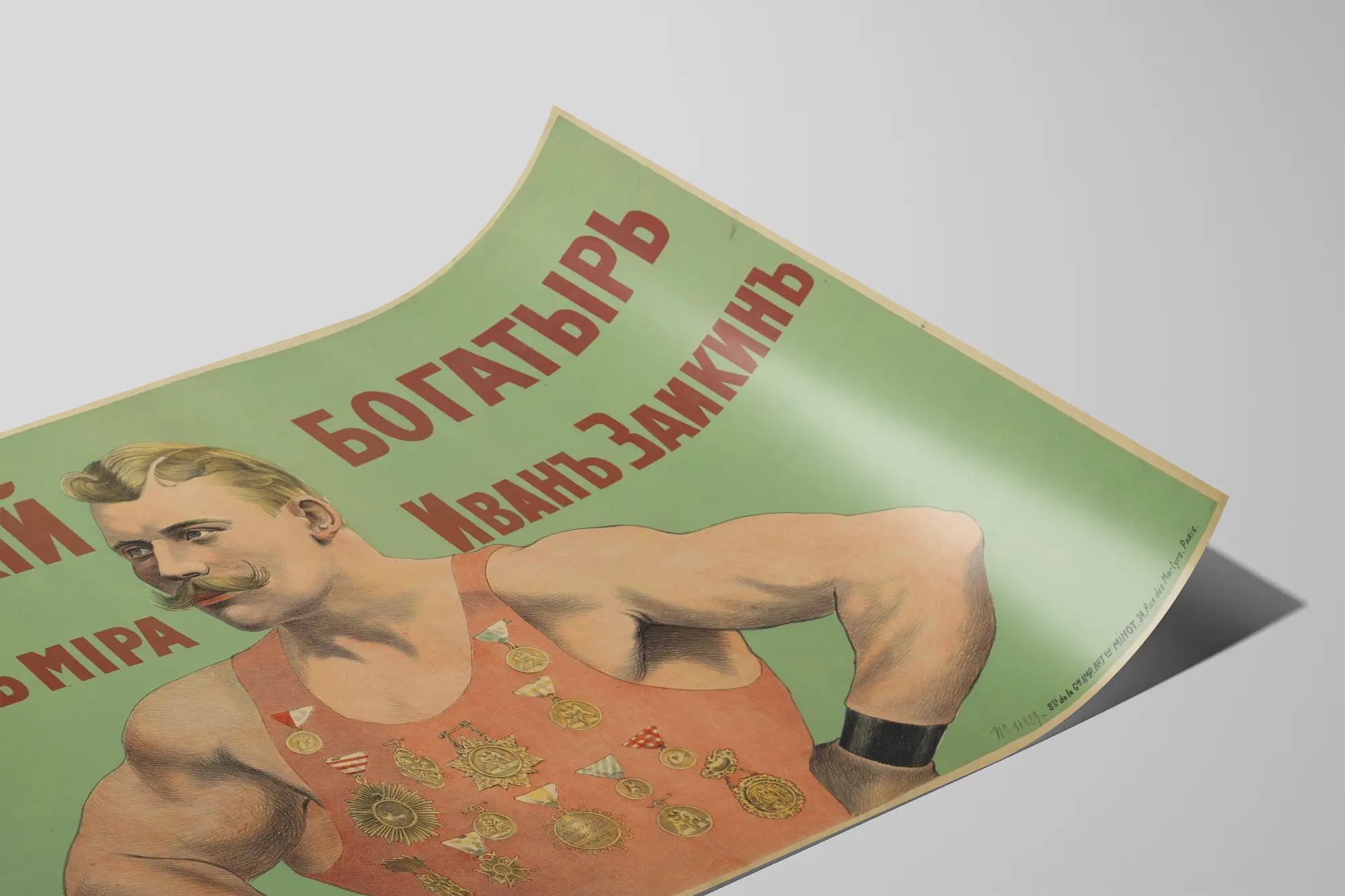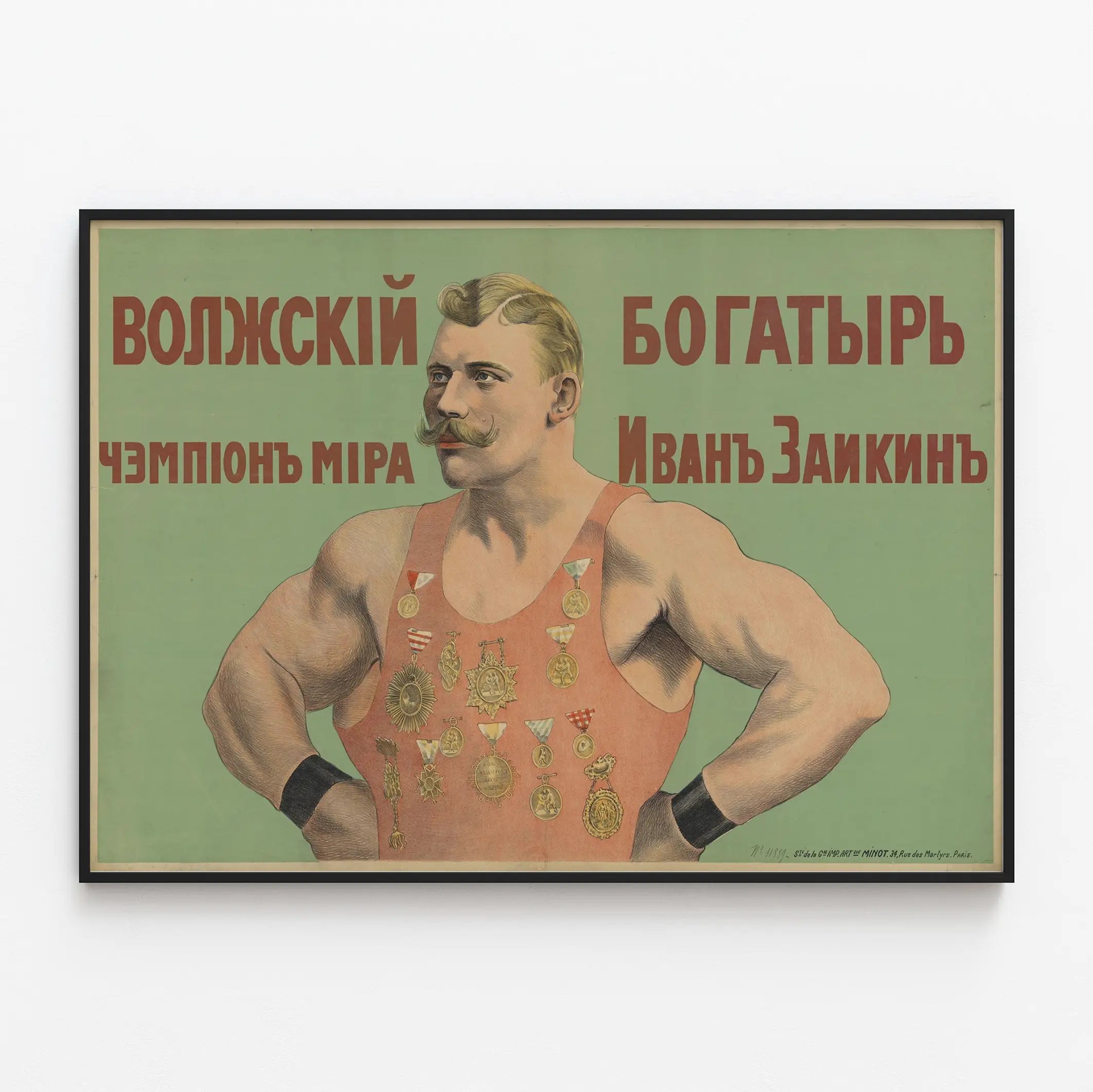 Cette affiche vintage représente un lutteur musclé et impressionnant, Ivan Zaikine, champion du monde, vêtu d'un débardeur rouge orné de nombreuses médailles de mérite et de distinction. Le personnage est dessiné avec un soin particulier aux détails, mettant en avant sa carrure puissante, son visage expressif avec une moustache soigneusement coiffée, et son regard déterminé. L'arrière-plan vert pastel souligne le portrait central, tandis que des inscriptions en caractères cyrilliques rouges encadrent le lutteur, renforçant l'aspect authentique et historique de cette décoration murale. Ce poster se distingue par son style graphique ancien, typique des affiches de promotion sportive du début du XXe siècle, ce qui en fait une pièce unique pour les amateurs d'arts graphiques, de sport et de décoration vintage. Cet élément de décoration murale apportera une ambiance rétro et dynamique à tout intérieur, qu'il s'agisse d'un salon, d'un bureau ou d'une salle dédiée au sport. En intégrant ce tableau mural, vous invitez à la fois la force et la détermination dans votre espace, tout en bénéficiant de l'esthétique élégante d'une affiche d'époque. Parfait pour les passionnés d'histoire du sport, cet objet décoratif saura attirer le regard et éveiller la curiosité de vos visiteurs. Son format poster est idéal pour être encadré ou simplement affiché sur un mur, offrant ainsi une décoration graphique et sportive à la fois « vintage » et intemporelle.