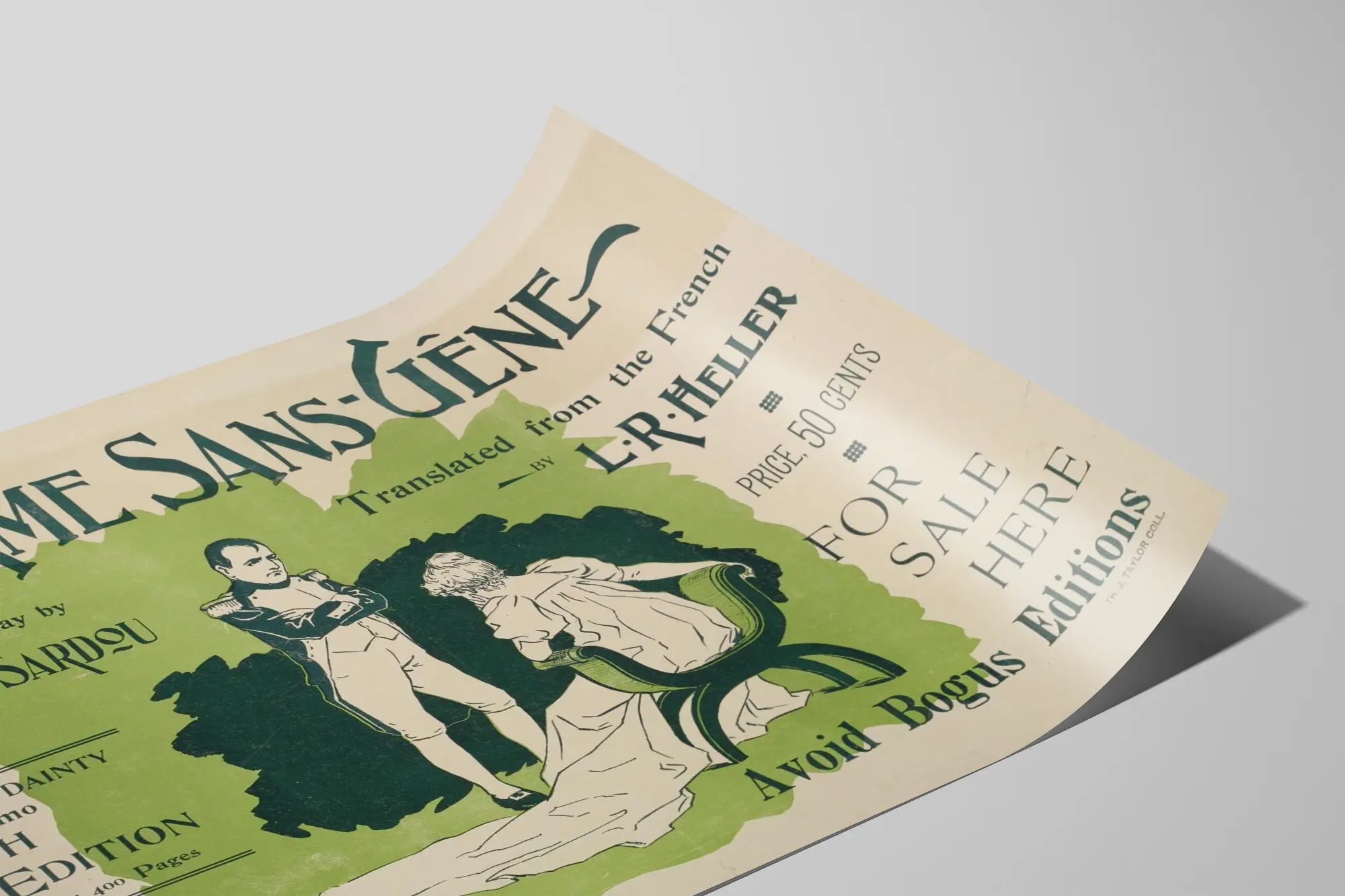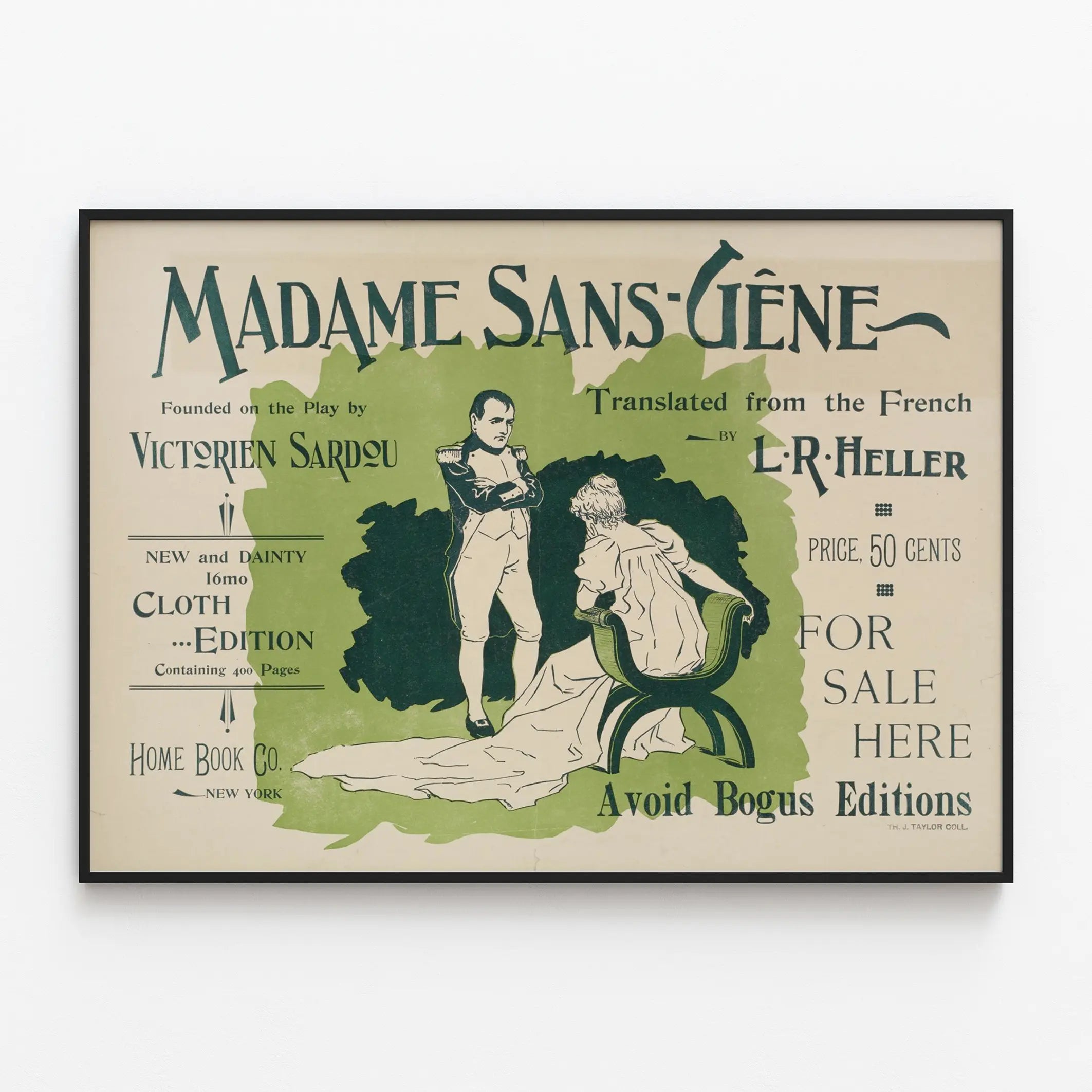 Cette affiche vintage intitulée « Madame Sans-Gêne » capture l’essence d’une pièce de théâtre classique écrite par Victorien Sardou. Représentée avec un style graphique rétro, cette affiche publicitaire présente deux personnages dans une scène théâtrale, mettant en avant une femme assise sur un fauteuil et un homme en tenue militaire debout devant elle. La palette de couleurs limitée, principalement des nuances de vert et de noir sur fond beige, confère à cette décoration murale un charme ancien et élégant, idéal pour les amateurs d’art rétro et de théâtre classique. Cette affiche est une excellente idée de décoration murale pour ceux qui souhaitent apporter une touche d’histoire et de culture française à leur intérieur. Qu’elle soit accrochée dans un salon, un bureau, ou un espace artistique, elle offre un impact visuel fort grâce à ses contrastes et son style typographique d’époque. Le nom « Madame Sans-Gêne » inscrit en grand au sommet attire immédiatement l’attention, tandis que les inscriptions secondaires détaillent la provenance théâtrale et la traduction anglaise réalisée par L. R. Heller. Avec ses lettres stylisées et l’illustration figurative, ce poster vintage s’intègre parfaitement dans une décoration murale d’inspiration classique ou éclectique. Son format permet de l’insérer facilement dans un cadre standard pour en faire un tableau mural captivant. Il séduira les passionnés de théâtre, les collectionneurs d’affiches anciennes, ainsi que ceux qui apprécient les éléments décoratifs chargés d’histoire. En résumé, cette affiche « Madame Sans-Gêne » est un choix authentique de décoration murale qui enrichit l’espace de toute pièce grâce à son esthétisme théâtral et vintage, tout en évoquant une œuvre culturelle notable. Une pièce de décoration murale idéale pour insuffler une ambiance élégante, historique et artistique dans votre décoration intérieure.