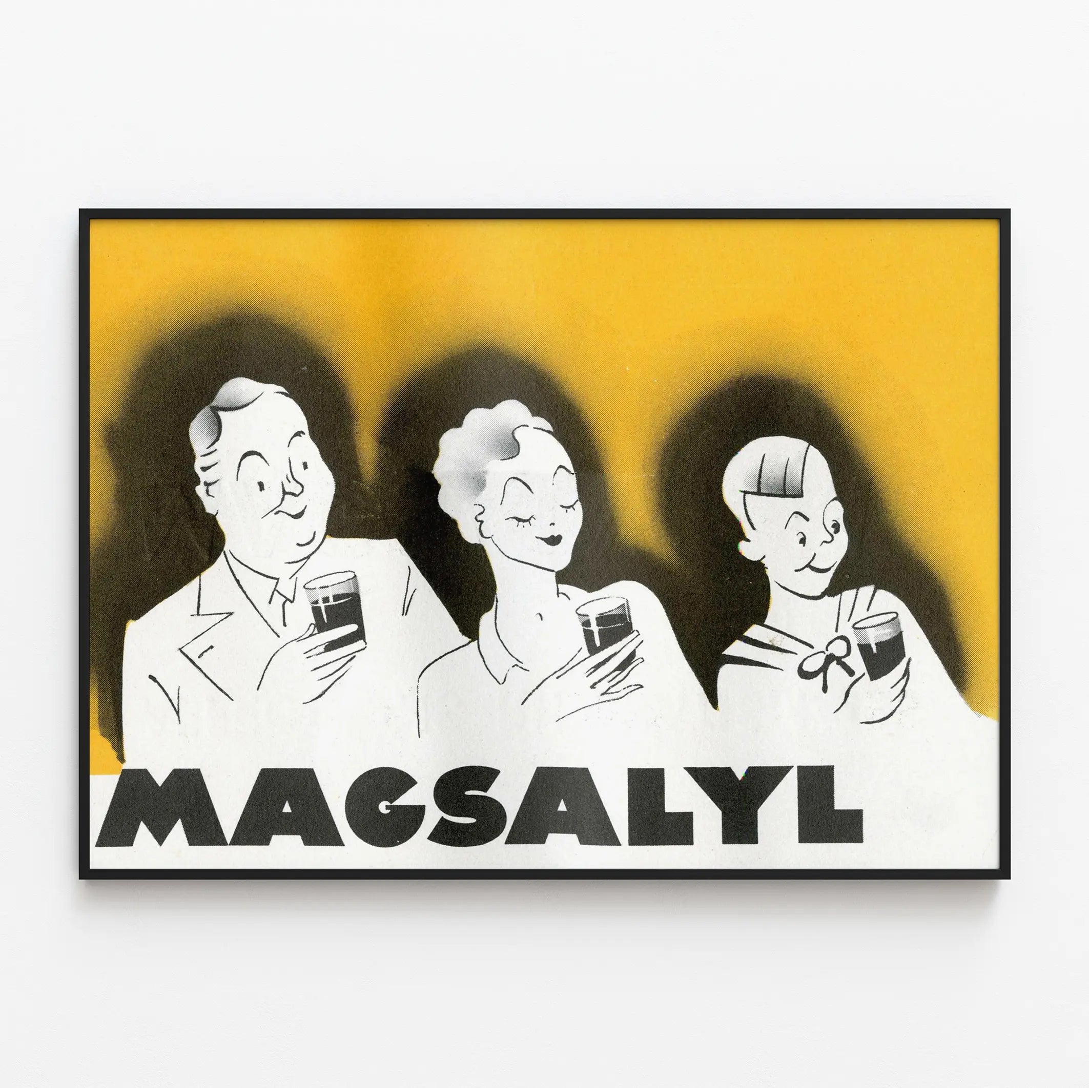 Cette affiche vintage MAGSALYL est un exemple parfait de décoration murale rétro, apportant une touche nostalgique et chaleureuse à votre intérieur. Représentant trois personnages souriants tenant chacun un verre, cette illustration en noir et blanc se détache sur un fond jaune lumineux, créant un contraste visuel saisissant qui attire naturellement l'œil. Le style graphique évoque les affiches publicitaires des années mid-20e siècle, avec un dessin simple mais expressif et une composition efficace, caractéristique des campagnes promotionnelles de cette époque.