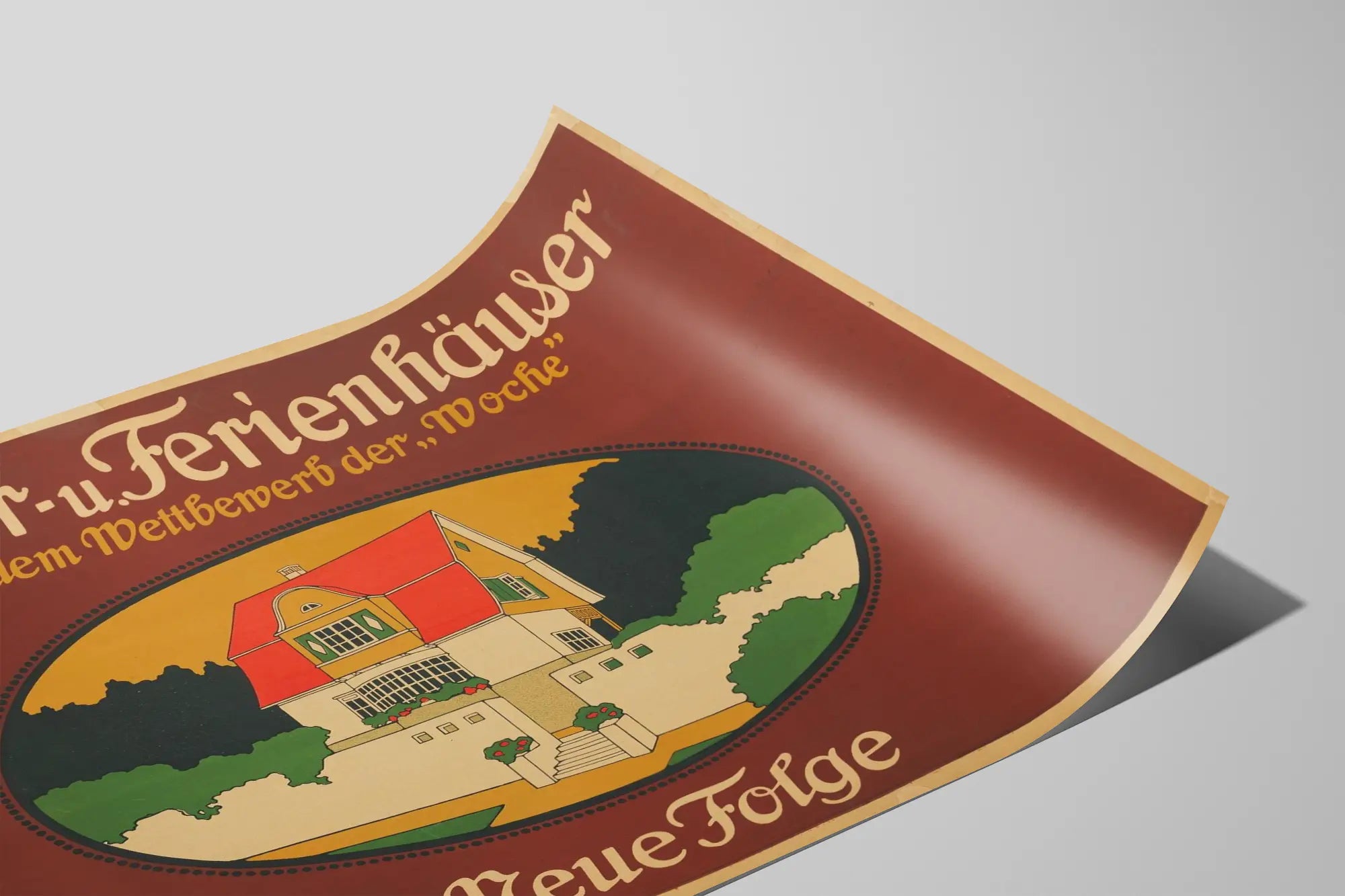 Cette affiche vintage intitulée "Sommer und Ferienhäuser" met en avant une maison d'été ou de vacances dessinée dans un style graphique simple et coloré, typique des affiches publicitaires anciennes. Le visuel central est encadré dans un ovale, montrant une maison à toit rouge avec des volets verts, entourée de végétation stylisée. Le fond marron et jaune met en valeur les teintes chaudes et automnales du dessin. Cette affiche est une décoration murale idéale pour apporter une touche rétro et chaleureuse à vos intérieurs, en particulier dans un salon, une entrée ou une pièce dédiée au repos. Parfait pour les amateurs de décoration vintage, ce poster évoque le charme des résidences secondaires et l'esprit des vacances à la campagne ou au bord de la mer. Utilisée en tant qu'affiche murale, elle peut également enrichir une composition murale autour du thème de la maison, des vacances ou du voyage. Son graphisme épuré et ses couleurs contrastées en font un élément de décoration murale à la fois discret et attractif. Que ce soit pour une collection personnelle d'affiches anciennes ou pour un lieu de vie à l'ambiance conviviale, ce poster apporte une touche unique et pleine de caractère. Sa taille standard permet une intégration facile sous cadre, offrant ainsi un support décoratif authentique et inspirant. Découvrez un style décoratif qui mêle histoire, architecture et nostalgie avec cette affiche design de maison de vacances.