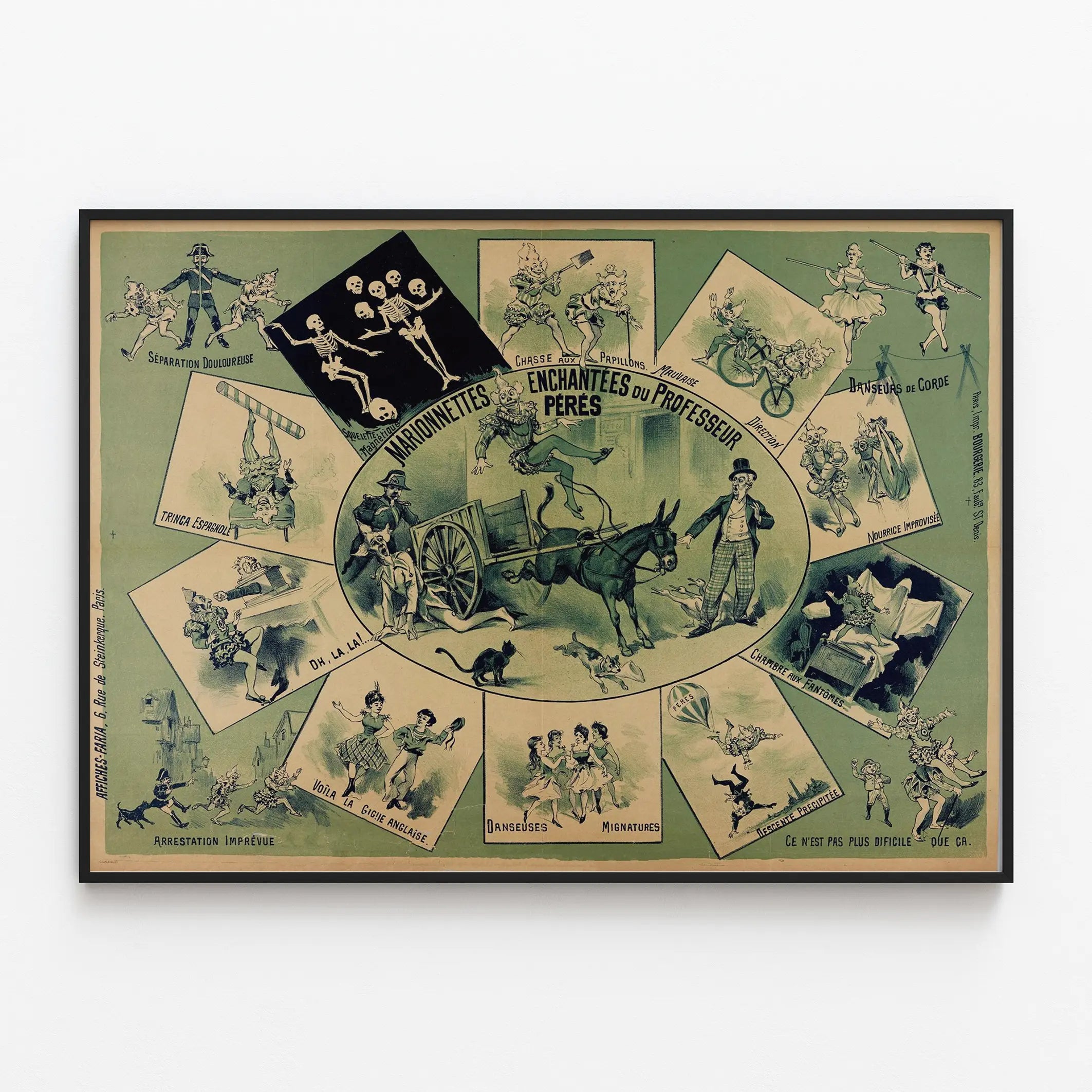 Cette affiche vintage intitulée « Marionnettes Enchantées du Professeur Péres » est une pièce de décoration murale originale qui séduira les amateurs de théâtre de marionnettes et d'illustrations anciennes. Elle présente une composition centrale entourée de scènes illustrées faisant vivre diverses saynètes de marionnettes animées avec humour et fantaisie. Les dessins montrent des personnages costumés dans différents tableaux où se mêlent fantaisie, humour et scènes costumées : squelettes dansants, danseurs de corde, chasse aux papillons, et scènes de « chambre aux fantômes » illustrent un univers théâtral foisonnant. Cette affiche illustre le savoir-faire d’un théâtre de marionnettes, avec un style graphique inspiré des lithographies anciennes. Les couleurs dominantes sont le noir, le blanc cassé et des teintes vertes, donnant à cette pièce un aspect rétro très marqué. La typographie manuscrite accompagne chaque scène, ajoutant une touche authentique et narrative à la composition. En décor, ce poster est idéal pour une décoration murale évoquant les arts du spectacle, la magie et l’époque victorienne. Il trouve facilement sa place dans un salon, une chambre d’enfant ou un espace dédié à la culture et aux arts. Son style original s’accorde particulièrement bien avec des intérieurs vintage, industriels ou bohèmes, apportant caractère et un charme d’antan. Ce tableau mural s’adresse aux passionnés de culture populaire, d’art ancien et de représentations théâtrales sous forme de marionnettes. C’est aussi un objet décoratif qui suscite curiosité et nostalgie, racontant des histoires à travers ses différents encadrés illustrés. Son format d'affiche permet de l'exposer aisément sur tout type de supports muraux comme un encadrement sous verre ou simplement fixé avec des pinces pour préserver son authenticité. Un excellent choix pour enrichir une collection d'art graphique ou pour personnaliser une pièce en quête d’un élément de décoration original et évocateur.